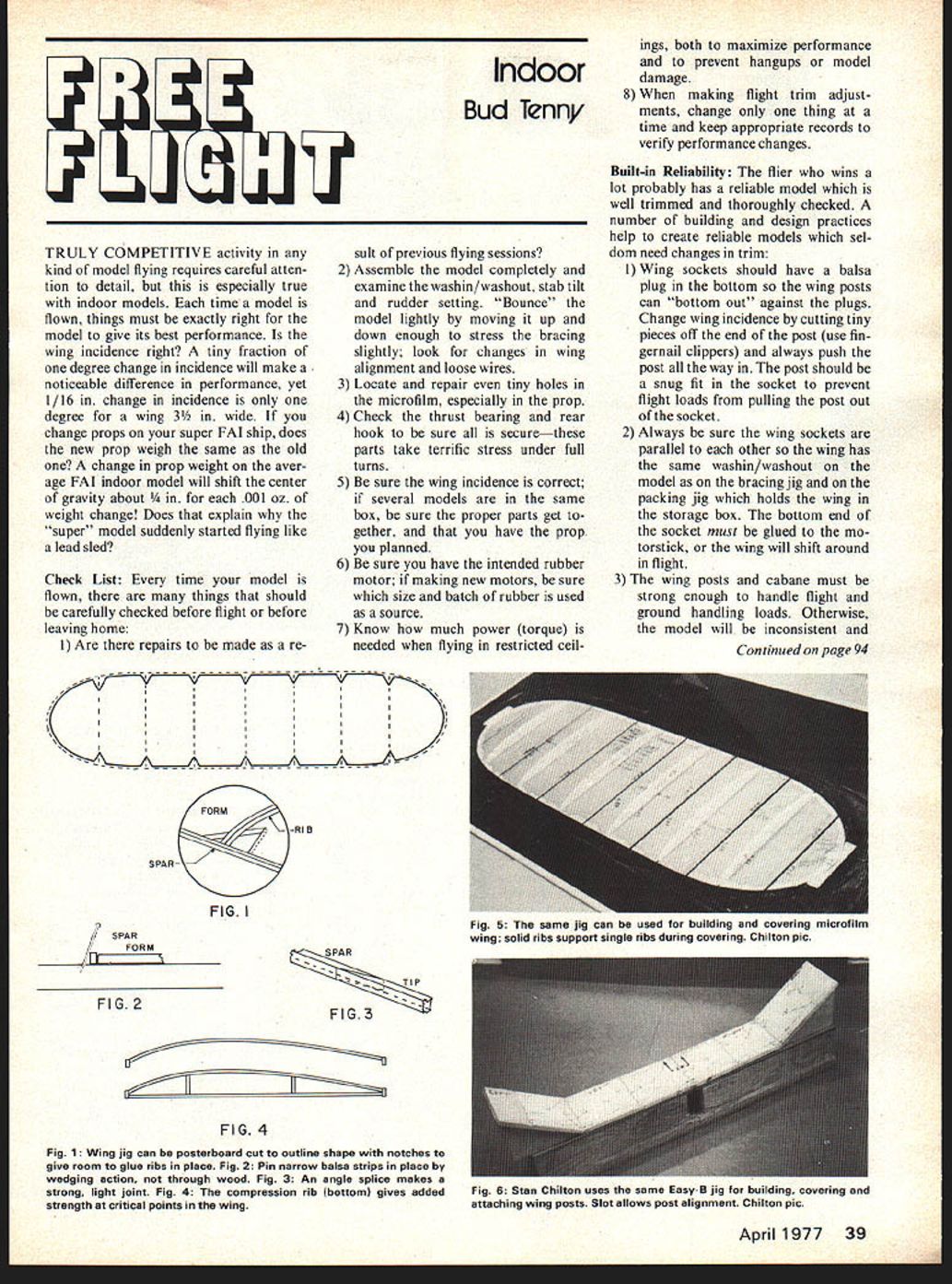 Indoor Bud Tenny TRULY COMPETITIVE activity kind model flying requires careful atten tion detail especially true indoor models time model flown things must exactly right model give its best performance wing incidence right tiny fraction degree change incidence will make noticeable difference performance yet 1/16 change incidence degree wing 3 wide change props super FAI ship does new prop weigh same old change prop weight aver age FAI indoor model will shift center gravity about oz weight change Does explain super model suddenly started flying like lead sled Check List time model flown things should carefully checked before flight before leaving home 1 Are repairs made re suIt previous flying sessions 2 Assemble model completely examine washin/washout stab tilt rudder setting Bounce model lightly moving up down enough stress bracing slightly look changes wing alignment loose wires 3 Locate repair tiny holes microfilm especially prop 4 Check thrust bearing rear hook sure securethese parts take terrific stress under full turns 5 Be sure wing incidence correct several models same box sure proper parts get gether have prop planned 6 Be sure have intended rubber motor making new motors sure size batch rubber used source 7 Know much power torque needed flying restricted ceil ings both maximize performance prevent hangups model damage 8 When making flight trim adjust ments change thing time keep appropriate records verify performance changes Built-in Reliability flier wins lot probably has reliable model well trimmed thoroughly checked number building design practices help create reliable models sel dom need changes trim 1 Wing sockets should have balsa plug bottom wing posts can bottom out against plugs Change wing incidence cutting tiny pieces off end post use fin gernail clippers always push post way post should snug fit socket prevent flight loads pulling post out socket 2 Always sure wing sockets parallel other wing has same washin/washout model bracing jig packing jig holds wing storage box bottom end socket must glued mo torstick wing will shift around flight 3 The wing posts cabane must strong enough handle flight ground handling loads Otherwise model will inconsistent Continued page 94 I I IIi I I I I I ~i\jRIe SPAR FIG I / SPAR FORM flr~ FIG 2 SPAR FIG3 FIG 4 Fig 1 Wing jig can posterboard cut outline shape notches give room glue ribs place Fig 2 Pin narrow balsa strips place wedging action through wood Fig 3 An angle splice makes strong light joint Fig 4 compression rib bottom gives added strength critical points wing April 1977 39 Fig 5 same jig can used building covering microfilm wing solid ribs support single ribs during covering Chilton pic Fig 6 Stan Chilton uses same Easy-B jig building covering attaching wing posts Slot allows post alignment Chilton pic nearing end read havent started new ship next season could well advised look partial kits produced P & W Model Service PO Box 925 Monrovia CA 91016 Schmidt Custom Kits 11948 Franklin Blvd Elk Grove CA 95624 Clipper built P & W par tial kit John Pond plans couldnt believe low price such quality product kit consisted ribs wing stab tips rudder outline curved fuselage parts plus plywood firewall P & W stocks variety popular designs Schmidt Custom will supply partial kits nearly design custom basis Prices right Write lists OT Event Month Rubber Rubber power began still offers challenging satisfying di version Old-Timer enthusiasts fly rubber events Prior introduc tion gas engine rubber models reached considerable sophistication early Zaic yearbooks provide wealth still pertinent information well multitude designs de signs look right home coitest field today Several fact could pass Coupe dHivers SAM rules call strict adherence original design means fold ing props allowed unless used original designs utilizing folders well single-blade prop avail able Prop carving builds character say rate mystery about prop carving removed Zaic yearbooks pitch determination basic theory modelers today feel qual ity rubber 30s better what currently available Having little experience old stock am no position comment However no limits amount rubber allowed duplicate performance should achiev able experimental nature models employing two motors gearing single prop available Old-Timer enthusiast Some systems quite elaborate yet easily fabricated modelers work shop Braided motors another interesting aspect technique developed means combining long running time long motor power burst short motor thereby hopefully obtaining best both worlds Rubber models require fussing perhaps gas models rubber re quires frequent washing eliminate grit lubrication improve life perform ance inspection detect impending fail ure effort prevent exposure heat sunlight regimented preflight proce dure insure proper power under ever present possibility bursting motor destroying model sounds rather formidable actuality great relaxation free dif ficulties locating procuring ig nition engine dont have oil over model days end Clarence Haught Route 5 Box 16 Coeur dA lene ID 83814 FF Indoor/Tenny Continued page 39 may handle high power tur bulent air 4 Use adequate reinforcement around thrust bearing have adequate clearance between motorstick motor Full-power hookups se verely stress front motorstick rubbing knots kill climb and/or wreck stick rubbing through wood 5 Color-code parts model including prop different props used same model sure prop weighs same others Mark props identify pitch different pitch props used 6 Keep careful records model per formance enough detail able repeat good performances 7 If possible test batch rubber keep track motor us ing small marked envelopes sure return motor its home after use different batches vary widely quality important know lind rubber using possible allow crum rubber motor unknown quality sure give nasty surprise 8 Build fly particular design enough learn its strengths weaknesses Take care make successive model design iden tical possible previo