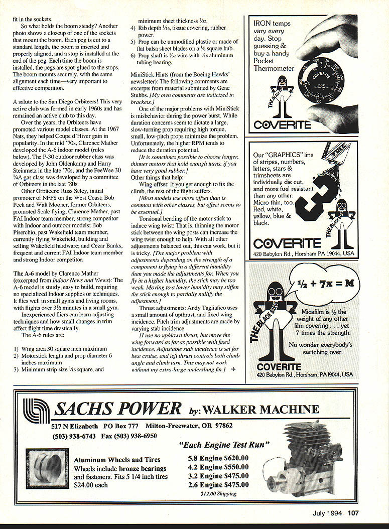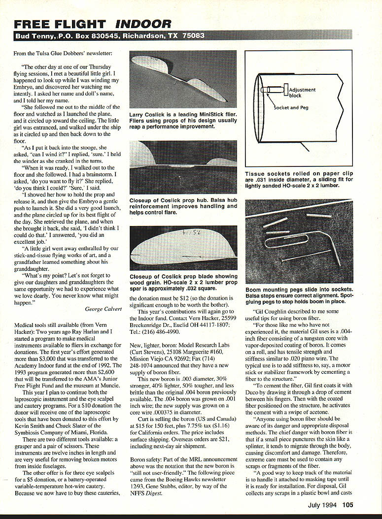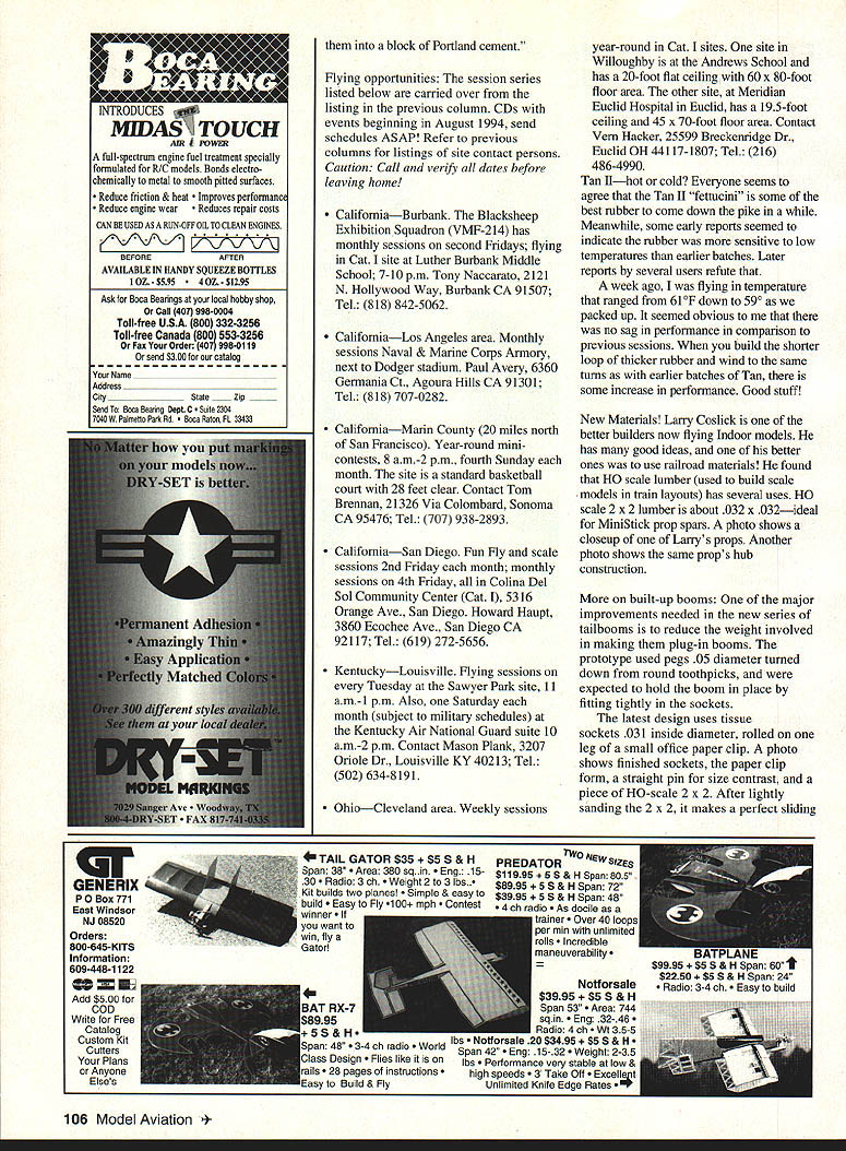 FREE FLIGHT INDOOR Tulsa Glue Dobbers newsletter other day Thursday flying sessions met beautiful little girl happened look up winding Embryo discovered watching intently asked name dolls name told name followed out middle floor watched launched plane circled up toward ceiling little girl entranced walked under ship circled up back down floor As put back stooge asked can wind replied sure held winder cranked turns ready walked out floor followed brainstorm asked want fly replied think could Sure said showed hold prop release give Embryo gentle push launch did very good launch plane circled up its best flight day retrieved plane brought back said didnt think could answered did excellent job little girl went away enthralled stick-and-tissue flying works art grandfather learned something about granddaughter What s point Lets forget give daughters granddaughters same opportunity experience what love dearly never know what might happen George Calvert Medical tools still available Vein Hacker Two years ago Ray Harlan started program make medical instruments available fliers exchange donations first years effort generated $3000 transferred Academy Indoor fund end 1992 1993 program generated $2600 will transferred AMA s Junior Free Flight Fund museum Muncie year plan continue botl laproscopic instrument eye scalpel cautery programs $10 donation donor will receive laproscopic tools have donated effort Kevin Smith Chuck Slater Symbiosis Company Miami Florida two different tools available grasper pair scissors instruments twelve inches length very useful removing broken motors inside fuselages other offer three eye scalpels $5 donation battery-operated variable-temperature hot-wire cautery Because now have buy cauteries donation must $12 donation significant enough worth bother years contributions will again go Indoor fund Contact Vein Hacker 25599 Breckenridge Dr Euclid OH 44117-1807 Tel 216 486-4990 New lighter boron Model Research Labs Curt Stevens 25108 Marguerite #160 Mission Viejo CA 92692 Fax 714 248-1074 announced have new supply boron fiber new boron 003 diameter 30% stronger 40% lighter 50% tougher less brittle original 004 boron previously available 004 boron grown 001 inch wire new supply grown core wire 000375 diameter Curt selling boron US Canada $15 150 feet plus 775% tax $116 California orders price includes surface shipping Overseas orders $21 including next-day air shipment Boron safety Part MRL announcement above notation new boron still user-friendly following piece came Boeing Hawks newsletter 1293 Gene Stubbs editor way NFFS Digest Tissue sockets rolled paper clip 031 inside diameter sliding fit lightly sanded HO-scale 2 x 2 lumber Gil Coughlin described some useful tips using boron fiber like have experienced material Gil uses 004inch fiber consisting tungsten core vapor-deposited coating boron comes roll has tensile strength stiffness similar 020 piano wire typical use add stiffness say motor stick stabilizer framework cementing fiber structure cement fiber Gil first coats Duco drawing through drop cement between fingers coated fiber positioned structure activates cement swipe acetone Anyone using boron fiber should aware its danger appropriate disposal methods chief danger boron fiber small piece punctures skin like splinter tends migrate through body causing discomfort damage Therefore extreme care must used contain scraps fragments fiber good way keep track material handle attached masking tape until ready instailation disposal Gil collects scraps plastic bowl casts July1994 105 Larry Coslick leading MiniStick flier Fliers using props design usually reap performance improvement Adjustment \block ocket Peg Closeup Coslick prop hub Balsa hub reinforcement improves handling helps control flare Closeup Coslick prop blade showing wood grain HO-scale 2 x 2 lumber prop spar approximately 032 square Boom mounting pegs slide sockets Balsa stops ensure correct alignment Spotgluing pegs stop holds boom place 55N 1KUUUU full-spectrum engine fuel treatment specially formulated RIC models Bonds electro chemically metal smooth pitted surfsees Reduce friction & heat Improves performanci Reduce engine wear ces repair costs CAN BE USED AS RUN-OFF OIL TO CLEAN ENGINES REAFTER AVAILABLE IN RANDY SQUEEZE BOTTLES OZ -5595 $1295 Ask Boca Bearings local hobby shop Call 407 998-0004 Toll-free USA 800 332-3256 Toll-free Canada 800 5533256 Faa Order 407 998-0119 send $300 catalog Ad qr GENERIX P0 Box 771 East Windsor NJ 08520 Orders 800-645-KITS Information 609-448-1122 Add $5 00 COD Write Free Catalog Custom Kit Cutters Plans Anyone Elses block Portland Cement Flying opportunities session series listed below carried over listing previous column CDs events beginning August 1994 send schedules ASAP Refer previous columns listings site contact persons Caution Call verify dates before leaving home CaliforniaBurbank Blacksheep Exhibition Squadron VMF-214 has monthly sessions second Fridays flying Cat site Luther Burbank Middle School 7-10 pm Tony Naccarato 2121 N Hollywood Way Burbank CA 91507 Tel 818 842-5062 CaliforniaLos Angeles area Monthly sessions Naval & Marine Corps Armory next Dodger stadium Paul Avery 6360 Germania Ct Agoura Hills CA 91301 Tel 818 707-0282 CaliforniaMain County 20 miles north San Francisco Year-round minicontests 8 am-2 pm fourth Sunday month site standard basketball court 28 feet clear Contact Tom Brennan 21326 Via Colombard Sonoma CA 95476 Tel 707 938-2893 CaliforniaSan Diego Fun Fly scale sessions 2nd Friday month monthly sessions 4th Friday Colina Del Sol Community Center Cat 5316 Orange Ave San Diego Howard Haupt 3860 Ecochee Ave San Diego CA 92117 Tel 619 272-5656 KentuckyLouisville Flying sessions Tuesday Sawyer Park site 11 am-1 pm Also Saturday month subject military schedules Kentucky Air National Guard suite 10 am-2 pm Contact Mason Plank 3207 Oriole Dr Louisville KY 40213 Tel 502 634-8191 OhioCleveland area Weekly sessions TAIL GATOR $35 -i- $5 S & HPREDATOR ONws 