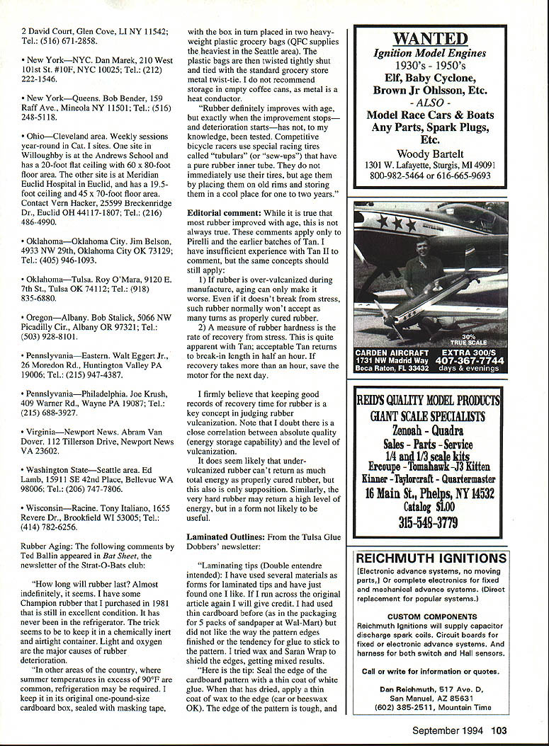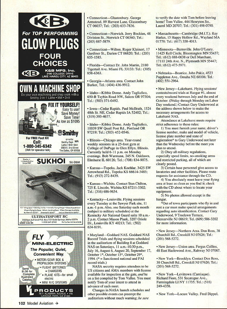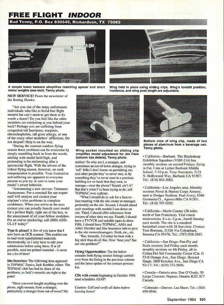FREE FLIGHT INDOOR TT lin NEW SERVICE newsletter Boeing Hawks Are unfortunate individuals like build free flight models cant seem get fly worth damn feel like other modelers snickering behind back Perhaps suffering congenital tail heaviness warposis churnchophobia tall grass allergy other modelers afflictions despair Help way During summer outdoor flying season problems can overcome simply stumbling back weeds smiling model held high pretending retrimming after spectacular flight advent indoor flying season however no such compensation possible frustration suffering apparent everyone present try vain tame models errant behavior Announcing new service Trimmers Anonymous nominal fee expert staff will analyze correct airplanes trim problems complete confidence arrive next contest can proudly launch model perfect flight right out box amazement fellow modelers Put end snickering call 800 ADDCLAY today Type please few know now have OCR scanner enables read typed/printed materials electronically have edit submissions before using possible send printed materialit saves lot time Site Searches following item appeared TOPMAC Topics Jack Koehlar editor TOPMAC club has its share site problems Jacks remarks right point Have ever bought anything over phone sight unseen stranger particularly stranger out-of-town Wing socket mounted sliding clip simplifies model adjustment Jim Clem column has details Tenny photo neither So am stranger sometimes out-of-town stranger trying sell folks dont know permitting other people theyve never met fly something theyve never seen precious building land own manageover phone Stupid aint thats what Ive trying sell TOPMAC over phone What should ask face-toface meeting site owner manager preferably site Second should attend such meetings models can demo site Third should offer references owners other sites use Fourth should have TV/VCR suitable tapes show Fifth should have TOPMAC AIvIA AMA Member Site Insurance info give site owners/managers Sixth etc etc honestly Id rather beat big stick bout See site problem Flying Opportunities list below contains both flying session listings carried over listing previous column latest update contact-persons list CDs events beginning October 1994 send schedules ASAP Caution Call verify dates before leaving home CaliforniaBurbank Blacksheep Exhibition Squadron VMF-214 has monthly sessions second Fridays flying Cat site Luther Burbank Middle School 7-10 pm Tony Naccarato 2121 N Hollywood Way Burbank CA 91507 Tel 818 842-5062 CaliforniaLos Angeles area Monthly sessions Naval & Marine Corps Armory next Dodger Stadium Paul Avery 6360 Germania Ct Agoura Hills CA 91301 Tel 818 707-0282 CaliforniaMann County 20 miles north San Francisco Year-round minicontests 8 am-2 pm fourth Sunday month site standard basketball court 28 feet clear Contact Tom Brennan 21326 Via Colombard Sonoma CA 95476 Tel 707 938-2893 CaliforniaSan Diego Fun-Fly Scale sessions 2nd Friday month monthly sessions 4th Friday Colina Del Sol Community Center Cat 5316 Orange Ave San Diego Howard Haupt 3860 Ecochee Ave San Diego CA 92117 Tel 619 272-5656 CanadaOntario area Dan OGrady 50 Largo Crescent Nepean Ontario K2G 3C7 Canada ColoradoDenver Les Shaw Tel 303 499-0946 September 1994 101 simple beam balance simplifies matching spacer shortWing held place using sliding clips Wings fore/aft position motor weights see text Tenny photoincidence wing post length adjustable Bottom view wing clip made two pieces aluminum beverage can Tenny photo ConnecticutGlastonbury George Armstead 89 Harvest Lane Glastonbury CT 06037 Tel 203 633-7836 ConnecticutNorwich Jerry Bockius 48 Division St Norwich CT 06360 Tel 203 887-5879 ConnecticutWilton Roger Kleinert 17 Gardiner St Darien CT 06820 Tel 203 655-1585 FloridaContact Dr John Martin 2180 Tigertail Ave Miami FL 33133 Tel 305 858-6363 GeorgiaAtlanta area Contact John Barker Tel 404 436-9912 IdahoKibbie Dome Andy Tagliafico 650-B Taybin Road NW Salem OR 97304 Tel 503 371-0492 IowaCedar Rapids Paul Mcllrath 1524 48th St NE Cedar Rapids IA 52402 Tel 319 393-4677 IdahoKibbie Dome Andy Tagliafico 10039 SW Quail Post Rd Portland OR 97219 Tel 503 452-0546 IllinoisChicago area Year-round weekly sessions 25-foot gym College DuPage Glen Ellyn Illinois Currently held 6-11 pm Monday evenings Bob Warmann 245 N Oaklawn Elmhurst IL 60126 Tel 708 834-9075 KansasTopeka Jack Koehlar 3425 SW Arrowhead Rd Topeka KS 66614-3485 Tel 913 272-8439 KansasWichita Contact Stan Chilton 725 E Lincoln Wichita KS 67211-3302 Tel 316 686-9634 KentuckyLouisville Flying sessions Tuesday Sawyer Park site 11 am-1 pm Also Saturday month subject military schedules Kentucky Air National Guard suite 10 am 2 pm Contact Mason Plank 3207 Oriole Dr Louisville KY 40213 Tel 502 634-8191 MarylandGoddard NAS Goddard NAS Record Trials flying sessions scheduled auditorium Building 8 Goddard NAS Saturdays 11 am-1030 pm July 16 August 6 August 20 September 17 October 1* October 15* October 29* 1994 * tioned national FAI record trials NASA security requires attendees US citizens AMA members license available inspection gate list compiled Tom Vallee must notify Tom intent attend advance meet Changes NASA launch schedules other possible events can preempt auditorium much warning sure verify date Tom before leaving home Tom Vallee 444 Henryton So Laurel MD 20707 Tel 301 498-0790 MassachusettsCambridge MIT Ray Harlan 15 Happy Hollow Rd Wayland MA 01778 Tel 617 358-4013 MinnesotaBurnsville John OLeary 11425 Kell Circle Bloomington MN 55437 Tel 612 888-0638 Dell Marchant 17110 24th Ave N Plymouth MN 55447 Tel 612 473-5971 NebraskaBeatrice John Pakiz 4523 Poppleton Ave Omaha NE 68106 Tel 402 551-2964 New JerseyLakehurst Flying sessions contestslrecord trials Hangar #1 almost weekend between July end October Friday through Monday Labor Day weekend Contact Gary Underwood address shown below make necessary arrangements access Lakehurst NAS Attendance Lakehurst meets require strict adherence rules 1 must furnish