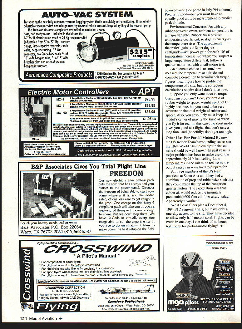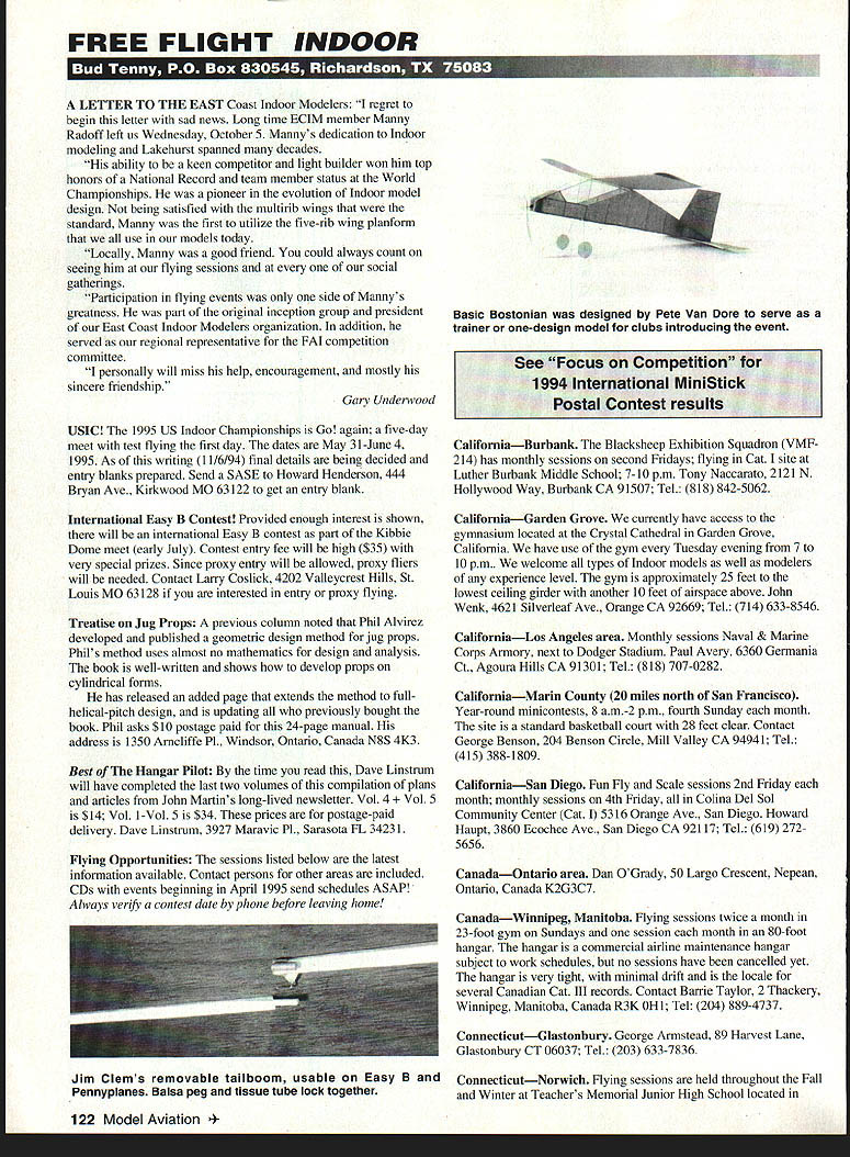 FREE FLIGHT INDOOR LETTER TO THE EAST Coast Indoor Modelers regret begin letter sad news Long time ECIM member Manny Radoff left us Wednesday October 5 Mannys dedication Indoor modeling Lakehurst spanned decades ability keen competitor light builder won him top honors National Record team member status World Championships pioneer evolution Indoor model design being satisfied multirib wings standard Manny first utilize five-rib wing planform use models today Locally Manny good friend could always count seeing him flying sessions social gatherings Participation flying events side Mannys greatness part original inception group president East Coast Indoor Modelers organization addition served regional representative FAI competition committee personally will miss help encouragement mostly sincere friendship Gary Underwood USIC 1995 US Indoor Championships Go again five-day meet test flying first day dates May 3 1-June 4 1995 As writing 11/6194 final details being decided entry blanks prepared Send SASE Howard Henderson 444 Bryan Ave Kirkwood MO 63122 get entry blank International Easy B Contest Provided enough interest shown will international Easy B contest part Kibbie Dome meet early July Contcst entry fee will high $35 very special prizes Since proxy entry will allowed proxy fliers will needed Contact Larry Coslick 4202 Valleycrest Hills St Louis MO 63128 interested entry proxy flying Treatise Jug Props previous column noted Phil Alvirez developed published geometric design method jug props Phils method uses almost no mathematics design analysis book well-written shows develop props cylindrical forms has released added page extends method fullhelical-pitch design updating previously bought book Phil asks $10 postage paid 24-page manual address 1350 Arncliffe P1 Windsor Ontario Canada N85 4K3 Best Hangar Pilot time read Dave Linstrum will have completed last two volumes compilation plans articles John Martins long-lived newsletter Vol 4 5 $14 Vol 1-Vol 5 $34 prices postage-paid delivery Dave Linstrum 3927 Maravic P1 Sarasota FL 34231 Flying Opportunities sessions listed below latest information available Contact persons other areas included CDs events beginning April 1995 send schedules ASAP Always verify contest date phone before leaving home Basic Bostonian designed Pete Van Dore serve trainer one-design model clubs introducing event See Focus Competition 1994 International MiniStick Postal Contest results CaliforniaBurbank Blacksheep Exhibition Squadron VMF 214 has monthly sessions second Fridays flying Cat site Luther Burbank Middle School 7-10 pm Tony Naccarato 2121 N Hollywood Way Burbank CA 91507 Tel 818 842-5062 CaliforniaGarden Grove currently have access gymnasium located Crystal Cathedral Garden Grove California have use gym Tuesday evening 7 10 pm. welcome types Indoor models well modelers experience level gym approximately 25 feet lowest ceiling girder another 10 feet airspace above John Wenk 4621 Silverleaf Ave Orange CA 92669 Tel 714 633-8546 CaliforniaLos Angeles area Monthly sessions Naval & Marine Corps Armory next Dodger Stadium Paul Avery 6360 Germania Ct Agoura Hills CA 91301 Tel 818 707-0282 CaliforniaMann County 20 miles north San Francisco Year-round minicontests 8 am-2 pm fourth Sunday month site standard basketball court 28 feet clear Contact George Benson 204 Benson Circle Mill Valley CA 94941 Tel 415 388-1809 CaliforniaSan Diego Fun Fly Scale sessions 2nd Friday month monthly sessions 4th Friday Colina Del Sol Community Center Cat 5316 Orange Ave San Diego Howard Haupt 3860 Ecochee Ave San Diego CA 92117 Tel 619 2725656 CanadaOntario area Dan OGrady 50 Largo Crescent Nepean Ontario Canada K2G3C7 CanadaWinnipeg Manitoba Flying sessions twice month 23-foot gym Sundays session month 80-foot hangar hangar commercial airline maintenance hangar subject work schedules no sessions have cancelled yet hangar very tight minimal drift locale several Canadian Cat III records Contact Bame Taylor 2 Thackery Winnipeg Manitoba Canada R3K OHl Tel 204 889-4737 ConnecticutGlastonbury George Armstead 89 Harvest Lane Glastonbury CT 06037 Tel 203 633-7836 ConnecticutNorwich Flying sessions held throughout Fall Winter Teachers Memorial Junior High School located 122 Model Aviation Clems removable tailboom usable Easy B Pennyplanes Balsa peg tissue tube lock together Norwich Connecticut Beginners welcome assistance provided veteran aeromodelers Sessions 1994-95 scheduled Saturdays 9 am 1 pm February 18 March 18 April 15 1995 Contact John Koptonak 3 Wiemes Ct Waterford CT 06385 Tel 203 442-9003 ConnecticutWilton Roger Kleinert 17 Gardiner St Darien CT 06820 Tel 203 655-1585 FloridaContact Dr John Martin 2180 Tigertail Ave Miami FL 33133 Tel 305 858-6363 GeorgiaAtlanta area Contact John Barker Tel 404 436-9912 IdahoKibbie Dome Andy Tagliafico 650B Taybin Road NW Salem OR 97304 Tel 503 371-0492 IllinoisChicago area Year-round weekly sessions 25-foot gym College DuPage Glen Ellyn Illinois Currently held 6-11 pm Monday evenings Bob Warmann 245 N Oaldawn Elmhurst IL 60126 Tel 708 834-9075 IowaCedar Rapids Non-sanctioned Indoor flying Nov 1994 through Feb 1995 Paul Mcllrath 152448 St NE Cedar Rapids IA 52402 Tel 319 393-4677 KansasTopeka Jack Koehiar 3425 SW Arrowhead Rd Topeka KS 666 14-3485 Tel 913 272-8439 KansasWichita Contact Stan Chilton 725 E Lincoln Wichita KS 67211-3302 Tel 316 686-9634 KentuckyLouisville Flying sessions Tuesday Sawyer Park site 11 am-i pm Also Saturday month subject military schedules Kentucky Air National Guard suite 10 am-2 pm Contact Mason Plank 3207 Oriole Dr Louisville KY 40213 Tel 502 634-8191 MarylandGoddard NAS Contact Tom Vallee 444 Henryton So Laurel MD 20707 Tel 301 498-0790 MassachusettsCambridge MIT Ray Harlan 15 Happy Hollow Rd Wayland MA 01778 Tel 617 358-4013 MinnesotaBurnsville John OLeary 11425 Kell Circle Bloomington MN 55437 Tel 612 888-0638 Dell Marchant 17110 24th Ave N Plymouth MN 55447 Tel 612 473-5971 NebraskaBeatrice John Pakiz 4523 Poppleton