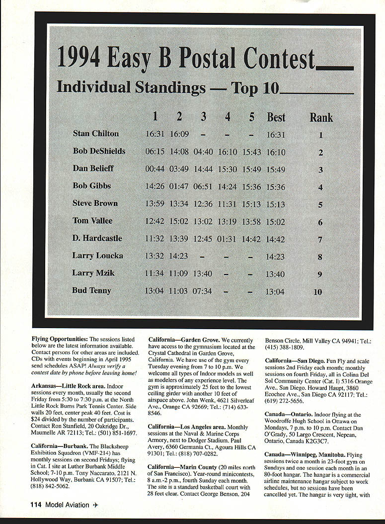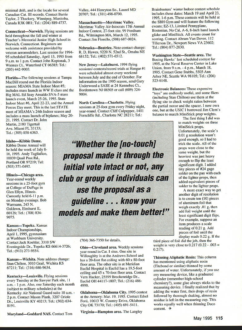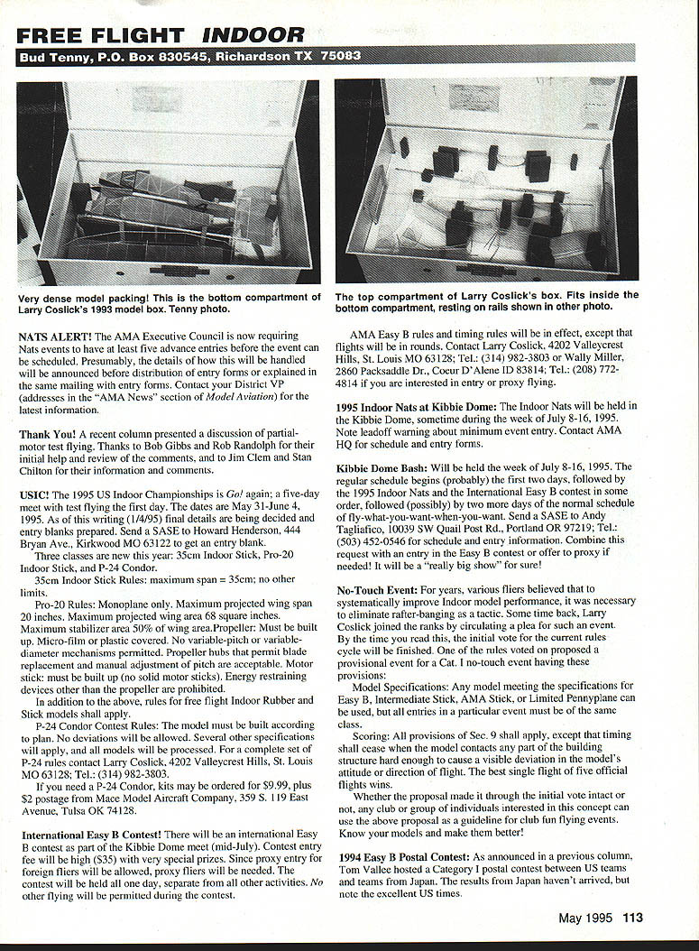 FREE FLIGHT INDOOR 1TT ALERT AMA Executive Council now requiring Nats events have least five advance entries before event can scheduled Presumably details will handled will announced before distribution entry forms explained same mailing entry forms Contact District VP addresses AMA News section Model Aviation latest information Thank recent column presented discussion partialmotor test flying Thanks Bob Gibbs Rob Randolph initial help review comments Jim Clem Stan Chilton information comments USIC 1995 US Indoor Championships Go again five-day meet test flying first day dates May 31-June 4 1995 As writing 1/4/95 final details being decided entry blanks prepared Send SASE Howard Henderson 444 Bryan Ave Kirkwood MO 63122 get entry blank Three classes new year 35cm Indoor Stick Pro-20 Indoor Stick P-24 Condor 35cm Indoor Stick Rules maximum span no other limits Pro-20 Rules Monoplane Maximum projected wing span 20 inches Maximum projected wing area 68 square inches Maximum stabilizer area 50% wing areaPropeller Must built up Micro-film plastic covered No variable-pitch variablediameter mechanisms permitted Propeller hubs permit blade replacement manual adjustment pitch acceptable Motor stick must built up no solid motor sticks Energy restraining devices other propeller prohibited addition above rules free flight Indoor Rubber Stick models shall apply P-24 Condor Contest Rules model must built according plan No deviations will allowed Several other specifications will apply models will processed complete set P-24 rules contact Larry Coslick 4202 Valleycrest Hills St Louis MO 63128 Tel 314 982-3803 need P-24 Condor kits may ordered $999 plus $2 postage Mace Model Aircraft Company 359 5 119 East Avenue Tulsa OK 74128 International Easy B Contest will international Easy B contest part Kibbie Dome meet mid-July Contest entry fee will high $35 very special prizes Since proxy entry foreign fliers will allowed proxy fliers will needed contest will held day separate other activities No other flying will permitted during contest AMA Easy B rules timing rules will effect except flights will rounds Contact Larry Coslick 4202 Valleycrest Hills St Louis MO 63128 Tel 314 982-3803 Wally Miller 2860 Packsaddle Dr Coeur DAlene ID 83814 Tel 208 7724814 interested entry proxy flying 1995 Indoor Nats Kibbie Dome Indoor Nats will held Kibbie Dome sometime during week July 8-16 1995 Note leadoff warning about minimum event entry Contact AMA HQ schedule entry forms Kibbie Dome Bash Will held week July 8-16 1995 regular schedule begins probably first two days followed 1995 Indoor Nats International Easy B contest some order followed possibly two days normal schedule fly-what-you-want-when-you-want Send SASE Andy Tagliafico 10039 SW Quail Post Rd Portland OR 97219 Tel 503 452-0546 schedule entry information Combine request entry Easy B contest offer proxy needed will really big show sure No-Touch Event years various fliers believed systematically improve Indoor model performance necessary eliminate rafter-banging tactic Some time back Larry Coslick joined ranks circulating plea such event time read initial vote current rules cycle will finished rules voted proposed provisional event Cat no-touch event having provisions Model Specifications Any model meeting specifications Easy B Intermediate Stick AMA Stick Limited Pennyplane can used entries particular event must same class Scoring provisions Sec 9 shall apply except timing shall cease model contacts part building structure hard enough cause visible deviation models attitude direction flight best single flight five official flights wins Whether proposal made through initial vote intact club group individuals interested concept can use above proposal guideline club fun flying events Know models make better 1994 Easy B Postal Contest As announced previous column Tom Vallee hosted Category postal contest between US teams teams Japan results Japan havent arrived note excellent US times May1995 113 Very dense model packing bottom compartment Larry Coslicks 1993 model box Tenny photo top compartment Larry Coslicks box Fits inside bottom compartment resting rails shown other photo Flying Opportunities sessions listed below latest information available Contact persons other areas included CDs events beginning April 1995 send schedules ASAP Always very contest date phone before leaving home ArkansasLittle Rock area Indoor sessions month usually second Friday 530 730 pm North Little Rock Bums Park Tennis Center Side walls 20 feet center peak 40 feet Cost $24 divided number participants Contact Ron Stanfield 20 Oakridge Dr Maumelle AR 72113 Tel 501 851-1697 CaliforniaBurbank Blacksheep Exhibition Squadron VMF-214 has monthly sessions second Fridays flying Cat site Luther Burbank Middle School 7-10 pm Tony Naccarato 2121 N Hollywood Way Burbank CA 91507 Tel 818 842-5062 CaliforniaGarden Grove currently have access gymnasium located Crystal Cathedral Garden Grove California have use gym Tuesday evening 7 10 pm welcome types Indoor models well modelers experience level gym approximately 25 feet lowest ceiling girder another 10 feet airspace above John Wenk 4621 Silverleaf Ave Orange CA 92669 Tel 714 6338546 CaliforniaLos Angeles area Monthly sessions Naval & Marine Corps Armory next Dodger Stadium Paul Avery 6360 Germania Ct Agoura Hills CA 91301 Tel 818 707-0282 CaliforniaMann County 20 miles north San Francisco Year-round minicontests 8 am-2 pm fourth Sunday month site standard basketball court 28 feet clear Contact George Benson 204 Benson Circle Mill Valley CA 94941 Tel 415 388-1809 CaliforniaSan Diego Fun Fly scale sessions 2nd Friday month monthly sessions fourth Friday Colina Del Sol Community Center Cat 5316 Orange Ave San Diego Howard Haupt 3860 Ecochee Ave San Diego CA 92117 Tel 619 272-5656 CanadaOntario Indoor flying Woodroffe Hugh School Ottawa Mondays 7 pm 10 pm Contact Dan OGrady 50 Largo Crescent Nepean Ontario Canada K2G3C7 CanadaWinnipeg Manitoba Flying sessio