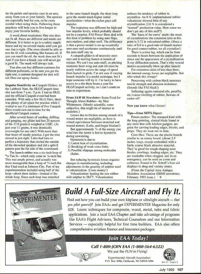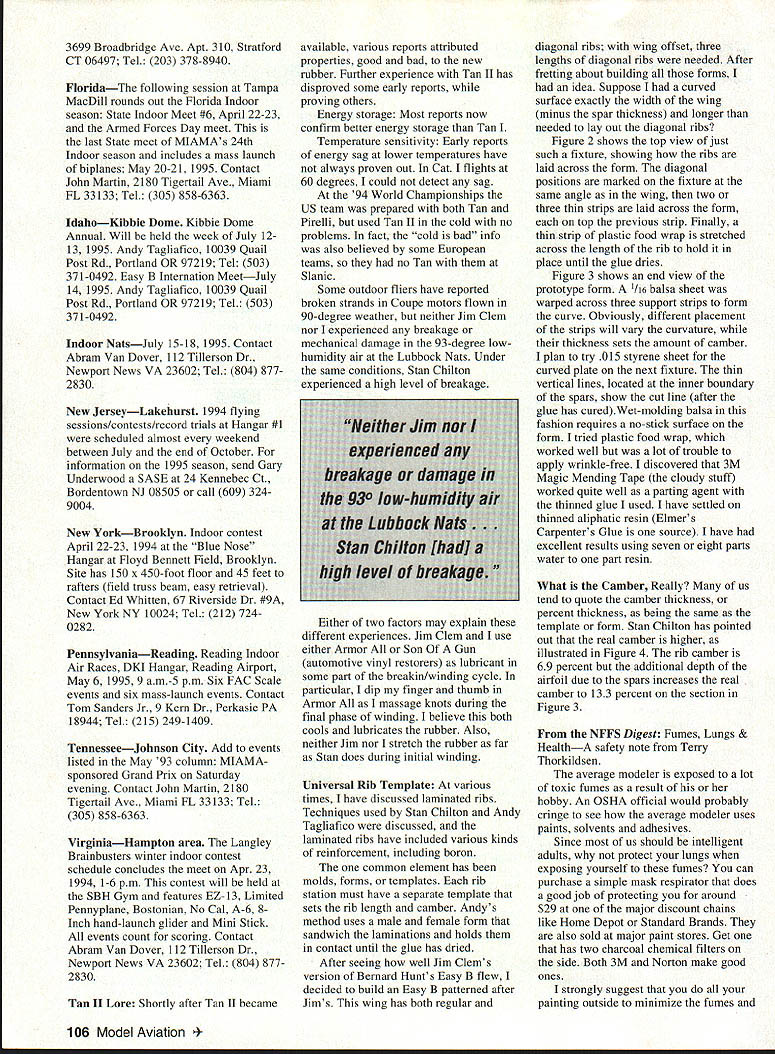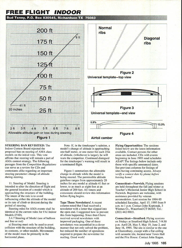 FREE FLIGHT INDOOR 200 ft 8 ft 175 ft 150 ft 12 t Qoft 75ft 5Oft 41 ft 20 inches25 ft IIII 2ft3ft4ft5ft6ft7ft8ft Allowable altitude gain loss during steering Figure 1 Figure 2 Universal templatetop view [] Figure 3 Universal templateend view 69% ______________________________ IlK Figure 4 Airfoil camber STEERING BAN REVISITED Indoor Contest Board rejected proposed ban steering AMA class models initial vote vote affirms steering will remain part AMA contest strategy following passages Competition Regulations can serve review CDs contestants alike regarding important steering parameter change altitude during steering 11 Steering Model Steering intended alter direction flight general location model approaching structure building intent rule avoid influencing either altitude model its rate climb descent during period steering Steering rules AMA events shall identical current rules FAI Indoor Models FlD 347 Steering Model use balloon line rod a Steering must used avert collision structure building its contents other models Movements model must primarily horizontal plane Note If timekeepers opinion models change altitude approaching one-half meter meter 25m altitude whichever larger will warn competitor Continued disregard timekeepers warning will result terminated flight Figure 1 summarizes allowable change altitude model being steered permissible altitude gain/loss ranges approximately 20 inches model altitude 41 feet lower much eight feet altitude 200 feet timers contestants should review information before flying begins Tape Newsletters recent column noted received newsletter letter slipped open end suggested prevent happening Since have received several newsletters improved packaging newsletters assembled clever manner solved problem reduced number operations required prepare newsletter mailing Good work Flying Opportunities sessions listed below latest information available Contact persons other areas included CDs events beginning June 1995 send schedules ASAP listings below include specific announced dates See previous columns listings sites having continuing access Always verify contest date phone before leaving home ConnecticutNorwich Flying sessions held throughout fall winter Teachers Memorial Junior High School Norwich Beginners welcome assistance provided veteran aeromodelers Last session 1994-95 scheduled Saturday April 15 1995 9 am 1 pm Contact John Koptonak 3 Wiemes Ct Waterford CT 06385 Tel 203 442-9003 ConnecticutStratford Flying sessions Fridays Stratford High School 7-930 pm April 28 May 5 May 19 June 2 June 16 1995 site similar Glastonbury except flat ceiling acoustic tile located near Town Hall Fire House Contact John Kagan July 1995 105 Normal ribs 3699 Broadbridge Ave Apt 310 Stratford CT 06497 Tel 203 378-8940 FloridaThe following session Tampa MacDill rounds out Florida Indoor season State Indoor Meet #6 April 22-23 Armed Forces Day meet last State meet MIAMA s 24th Indoor season includes mass launch biplanes May 20-21 1995 Contact John Martin 2180 Tigertail Ave Miami FL 33133 Tel 305 858-6363 IdahoKibbie Dome Kibbie Dome Annual Will held week July 1213 1995 Andy Tagliafico 10039 Quail Post Rd Portland OR 97219 Tel 503 371-0492 Easy B Internation MeetJuly 14 1995 Andy Tagliafico 10039 Quail Post Rd Portland OR 97219 Tel 503 371-0492 Indoor NatsJuly 15-18 1995 Contact Abram Van Dover 112 Tillerson Dr Newport News VA 23602 Tel 804 8772830 New JerseyLakehurst 1994 flying sessions/contests/record trials Hangar #1 scheduled almost weekend between July end October information 1995 season send Gary Underwood SASE 24 Kennebec Ct Bordentown NJ 08505 call 609 3249004 New YorkBrooklyn Indoor contest April 22-23 1994 Blue Nose Hangar Floyd Bennett Field Brooklyn Site has 150 x 450-foot floor 45 feet rafters field truss beam easy retrieval Contact Ed Whitten 67 Riverside Dr #9A New York NY 10024 Tel 212 7240282 PennsylvaniaReading Reading Indoor Air Races DKI Hangar Reading Airport May 6 1995 9 am-5 pm Six FAC Scale events six mass-launch events Contact Tom Sanders Jr 9 Kern Dr Perkasie PA 18944 Tel 215 249-1409 TennesseeJohnson City Add events listed May 93 column MIAMA sponsored Grand Prix Saturday evening Contact John Martin 2180 Tigertail Ave Miami FL 33133 Tel 305 858-6363 VirginiaHampton area Langley Brainbusters winter indoor contest schedule concludes meet Apr 23 1994 1-6 pm contest will held SBH Gym features EZ-13 Limited Pennyplane Bostonian No Cal A-6 8Inch hand-launch glider Mini Stick events count scoring Contact Abram Van Dover 112 Tillerson Dr Newport News VA 23602 Tel 804 8772830 Tan II Lore Shortly after Tan II became available various reports attributed properties good bad new rubber Further experience Tan II has disproved some early reports proving others Energy storage Most reports now confirm better energy storage Tan Temperature sensitivity Early reports energy sag lower temperatures have always proven out Cat flights 60 degrees could detect sag 94 World Championships US team prepared both Tan Pirelli used Tan II cold no problems fact cold bad info also believed some European teams no Tan Slanic Some outdoor fliers have reported broken strands Coupe motors flown 90-degree weather neither Jim Clem nor experienced breakage mechanical damage 93-degree lowhumidity air Lubbock Nats Under same conditions Stan Chilton experienced high level breakage Either two factors may explain different experiences Jim Clem use either Armor Son Gun automotive vinyl restorers lubricant some part breakin/winding cycle particular dip finger thumb Armor massage knots during final phase winding believe both cools lubricates rubber Also neither Jim nor stretch rubber far Stan does during initial winding Universal Rib Template various times have discussed laminated ribs Techniques used Stan Chilton Andy Tagliafico discussed laminated ribs have included various kinds reinforcement including boron common element has molds forms templates rib station must have separate template sets rib le