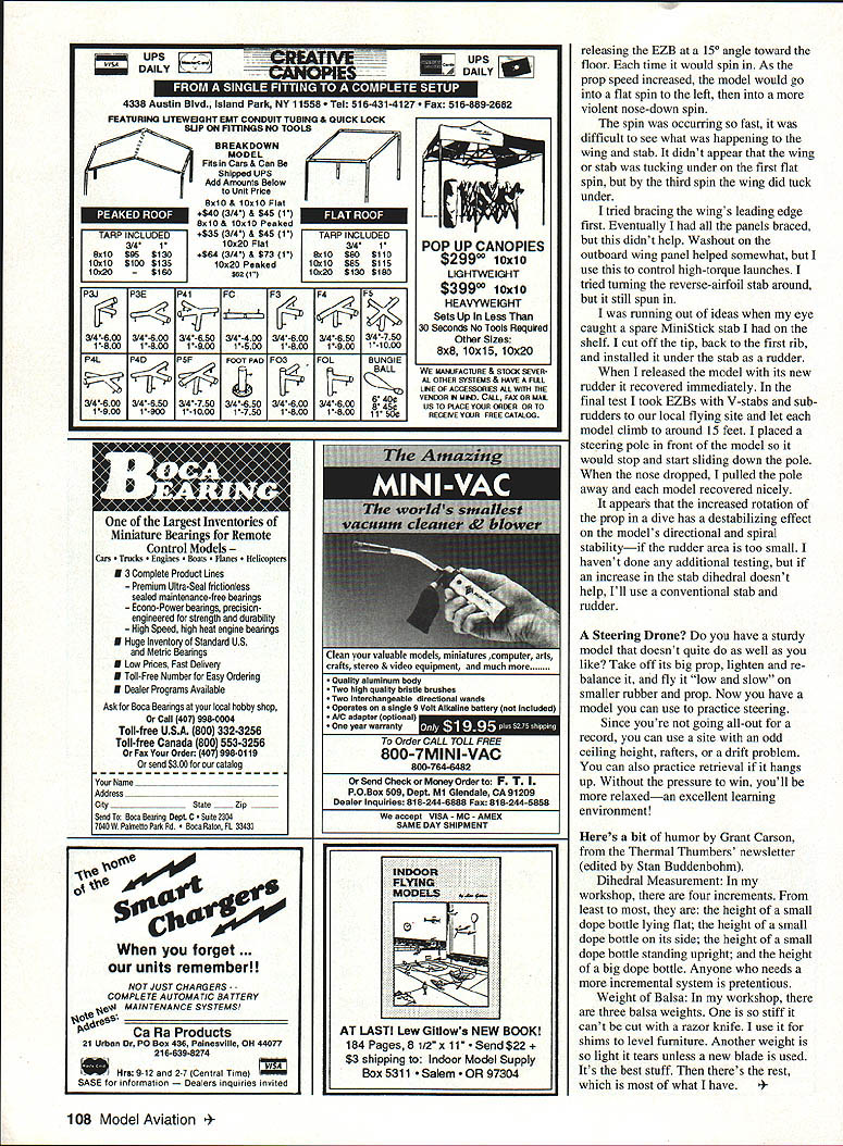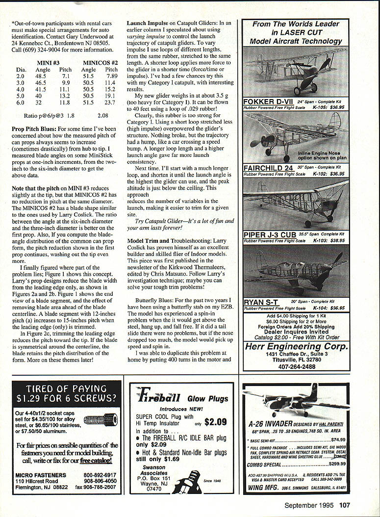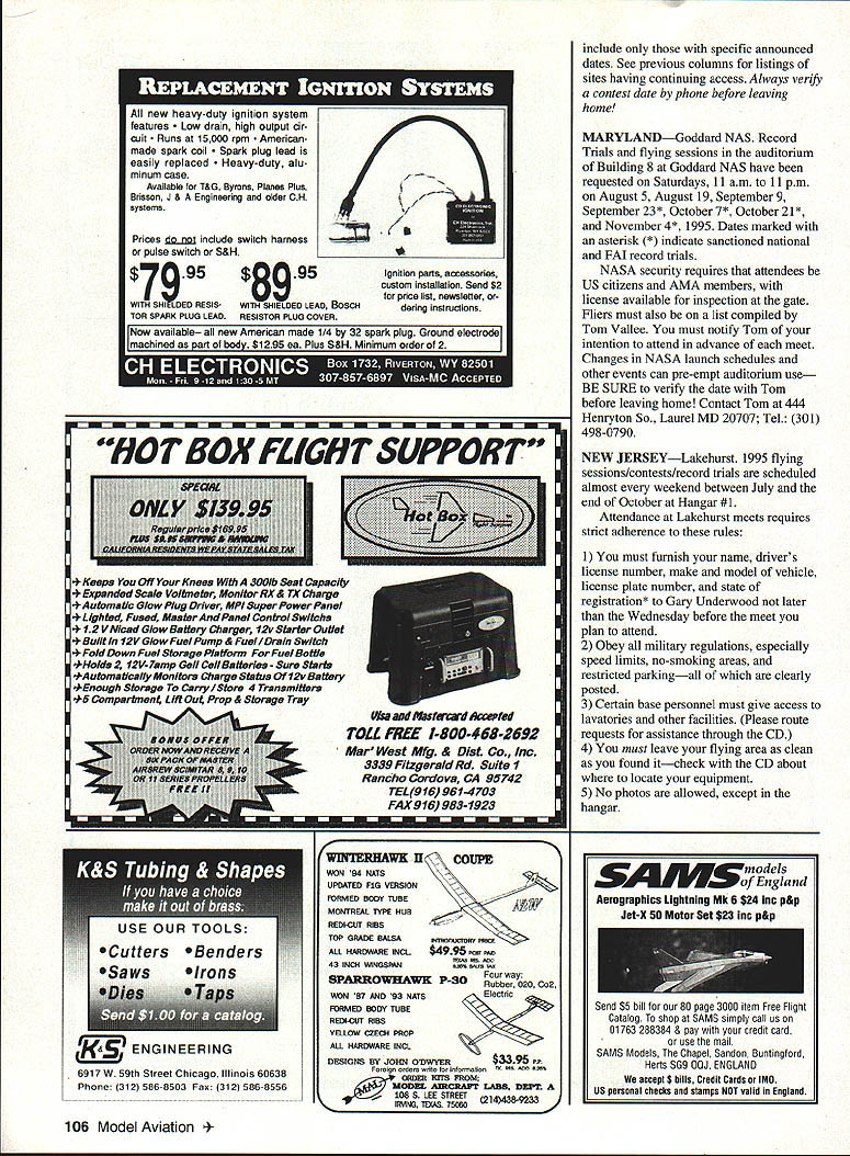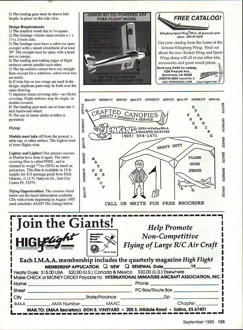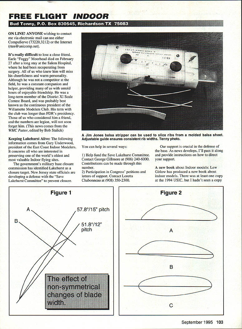 FREE FLIGHT INDOOR ON LINE ANYONE wishing contact via electronic mail can use either CompuServe 732203212 Internet rten @unicompnet Its really difficult lose close friend Earle Foggy Moorhead died February 27 after long stay Salem Hospital recuperating surgery us knew him will miss cheerfulness wann personality Although competitor field constant companion helper providing us untold hours enjoyable friendship long-term member District XI Scale Contest Board probably best known continuous president Willamette Modelers Club term club longer FDRs presidency us considered him friend numbers legion will soon forget him news comes WMC Patter edited Bob Stalick Keeping Lakehurst Alive following information comes Gary Underwood president East Coast Indoor Modelers concerns interested preserving worlds oldest valuable Indoor flying sites governments military base closure commission has identified Lakehurst closure target New Jersey state officials developing defense Save Lakehurst Committee prevent closure can help several ways 1 Help fund Save Lakehurst Committee Contact George Gillmore 908 240-6000 Contributions can made through number 2 Participation Congress petitions letters support Contact Loretta Chabonneau 908 350-2300 support crucial defense base As news develops Ill pass along provide instructions direct support new book about Indoor models Lew Gitlow has produced new book about indoor models least copy 1994 USIC hadnt seen copy B September 1995 103 Jim Jones balsa stripper can used slice ribs molded balsa sheet Adjustable guide ensures consistent rib widths Tenny photo Figure 1 A578oI15~ pitch B 51 80/1 2 pitch Figure 2 C until recently Lew has packed book sketches commentary hintsall topics youd expect include first visit indoor site flying models schools history models rubber techniques design sketches torque-actuated variable-pitch propeller Indoor Flying Models priced $22 Its available Indoor Model Supplies Box 5311 Salem OR 97304 avery good book Oops March 1995 column showed picture simple appealing Bostonian built Peter Van Dore Peter wrote say called Beginners Bostonian designed Carl Hedley plans published Bill Hannan s book Stick & Tissue Vol 1 stab supposed top rudder Peter noted must have martini before assembling Another New Indoor Event WMC Patter Legal Eagle has spread its wings Its being sponsored new event Indoor sites US event originally developed East Coast flown MIAMA group upcoming two-day Indoor meet no exception well have eagles South Albany brief rules Drawing Requirements 1 drawing must fit side sheet legal size 85 x 14-inch paper 2 No component parts drawing may superimposed overlap another must clear another edge paper least 1/g 3 Wings stabilizer must drawn full-span tip-to-tip 4 Fins may drawn space allows necessarily attached side view Build Full-Size Aircraft Fly Find out can build own kitplane ultralight aircraft t yourself Join EAA get EXPERIMENTER Magazine $28 Learn techniques composite wood metal tube fabric applications Join local EAA Chapter take advantage programs like EAAs Flight Advisors Technical Counselors Information Services cially helpful first time builders EAA also offers 104 Model Aviation J ELECTRONICS 900 Lucy Road Howell Michigan 48843 517-546-2644 Service & Repairs Most Radio Control Systems Utilizing Calibrated Test Equipment & Spectrum Analyzers Endorsed AMA1 RCMA Sticker Station #105 Futaba Airtronics JR Ace HiTec Tower Cirrus World Engines & WE USE GENUINE FACTORY REPLACEMENT PARTS Complete 1991 Narrow Banding & Upgrades RCD / HITEC R/C DEALER FCC Licensed Speed Control Repairs Quality Service Fast Turn Around Shipping & Insurance Extra UPS Mail VISA MASTERCARD & DISCOVER WELCOMED AMA #256123ARRLWB8YS ITS REAL ROLLING HANGAR WELLS CARGO Rolling Hangar works serious RC Model Pilot get great weatherproof transport convenient safe storage Bird wings spare props radio organized ready go Buzzin anytime weatherman says OK models ranging 6 48 theres WELLS CARGO trailer just right Plus get 3-Year Warranty Program real/v works CALL TOLL-FREE 1 -800-348-7553 Literature Prices & Nearest Dealer comprehensive aviation finance insurance packages Call 1-800-JOIN EAA 1-800-564-6322 put FUN Flying Experimental Aircraft Association PO Box 3086 Oshkosh WI 54903-3086 5 landing gear must drawn full length in-place side view Design Requirements 1 smallest wood size 1/16 square 2 fuselage volume must contain 1 x 11/2x 3-inch cube 3 fuselage must have cabin open cockpit raised windshield least 300 cockpit must open head rest canopy 4 leading trailing edges flight surfaces cannot parallel other 5 tip outlines cannot have straight lines except stabilizer twin fins used 6 twin fins two wings used design duplicate parts may built over same drawing 7 Japanese tissue covering onlyno Mylar covering Flight surfaces may single- double-covered 8 landing gear must use least 1inch hardwood wheel 9 use motor sticks tubes permitted Flying Models must take off ground table top other surface highest total three flights wins Lighter Lighter plastics mavens Florida have done again latest covering film called PM2L claimed weigh 271/285 95% much polymicro film available 15-ft lengths $15 postage paid Dick Obarski 2112 N Halcyon Dr Sun City Center FL 33573 Flying Opportunities sessions listed below latest information available CDs events beginning August 1995 send schedules ASAP listings below L&L1TY I/TEGRITY SERVICE QUALm ThTEGUTY SERVICE QJJAL TTY TKrEGRITY SERVICE cJ 0AFTED 395O-AVallstBIvd WALNUT CA 91789 vi U C w i4 T PE RR 00 F 01 S T F R N ED E N CALL OR WRITE FOR FREE BROCHURE Join Giants Help Promote iLJEfNon-CompetitiveI .,. M ing Large RI C Air Craft i I IMAA membership includes quarterly magazine High Flight I MEMBERSHIP APPLICAllON IJ NEW 0 RENEWAL Date19I Yeay Dues$1500 USA $2000 US Canada & Mexico $3000 US ElsewhereI Make CHECK MONEY ORDER Payable INTERNATiONAL MINIAlURE AIRCRAFT ASSOCIATION INC I Name _________________ Phone ___________ I Street _______________
