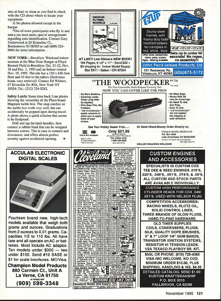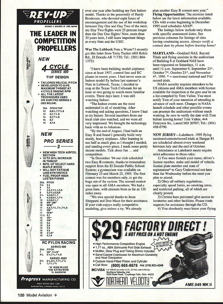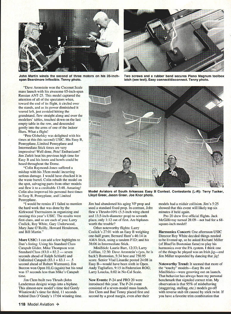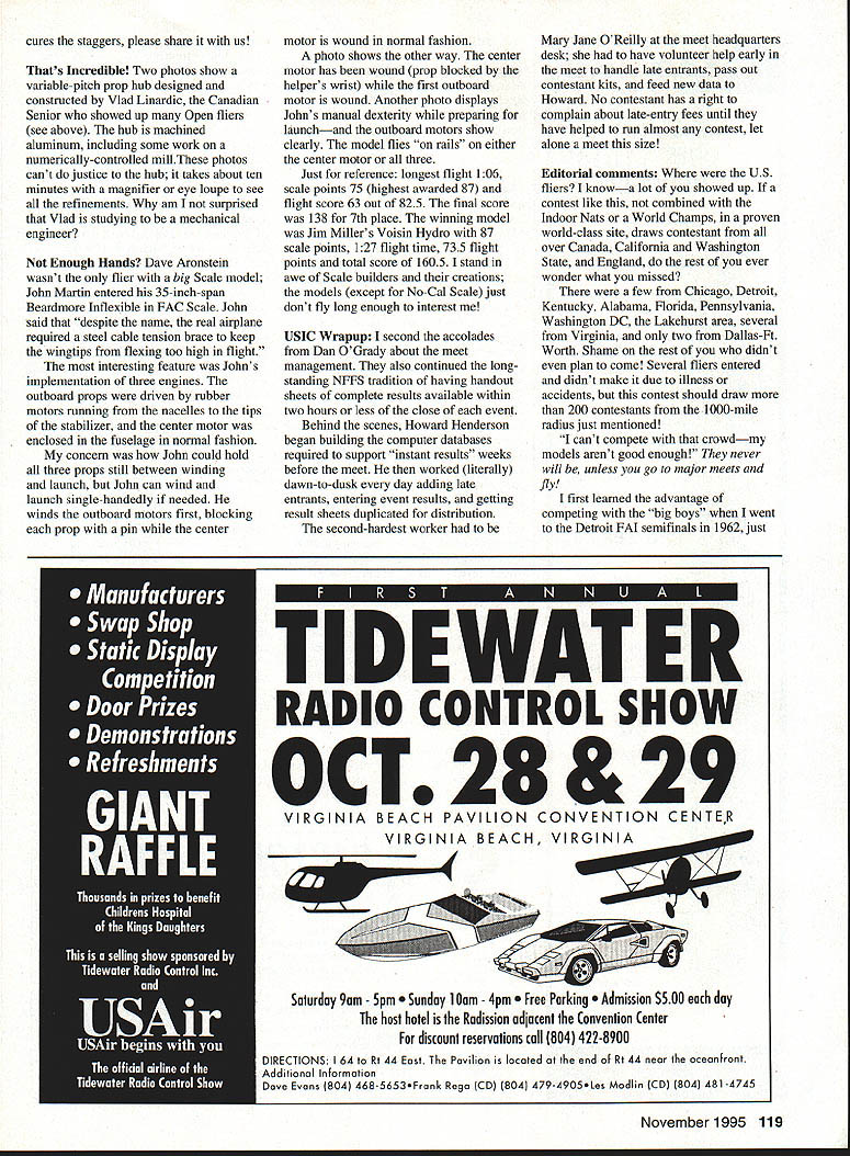 FREE FLIGHT INDOOR DICK GANSLEN Indoor fliers will remember Dick Ganslen active years until fall ladder resulted severe injuries required long recuperation died late May 1995 Dick also physiologist worldrenowned pole-vault authorityan AllAmerican pole vault triple jump last competed mid late 60s wrote articles books mechanics pole vault aerodynamics pole vault discus javelin flight psychology sports physiology pharmaceutical applications sports skills professor several colleges including Texas Womans University Denton Texas Texas fliers remember sponsorship numerous contests flying sessions ballroom TWU Due long illness newer fliers Texas wont remember old-timers Thanks did Dick 1995 USIC Dan OGrady performed incredible feat publishing June/July 1995 issue SAM 86 Speaks within week after event issue contained full results almost USIC events plus entertaining report Ten Canadians participated USIC five Canadian records set see box Vlad Linardics Dan OGradys times also new record times Mini-Dome events Although Vlad entered Jr/Sr category Limited Pennyplane 1553 would have won Open category won Jack McGillivray 1523 John Marett third event time 1456 Jack McGillivray first FlD 12749 total best two flightsa new Mini-Dome record placed first Highlights United States Indoor Championships Ten Canadians participated USIC including Grand Champion Jack McGiilivray Five Canadian records set ContestantCatagory Viad LinardicLimited Pennyplane Jack McGillivrayEasy B FiD John Marett Dan OGrady Manhattan Pennyplane Time 1553 2506 4359 1235 1704 SOURCE Bud Tenny PRO 20 2809 second Peanut Scale FAC Scale Ray Harlan posted amazing 1813 omithopter Current winning times expected 12-minute range MiniStick mass-launch winner Larry Cailliau Although timed event model clocked 1203 Jim Grant won Bostonian mass launch very convincingly wasnt anyone near flight time November1995 117 Heres keep three motors wound until launch time John Martin holds onto Beardmore Inflexible FAC Scale model Tenny photo Top view VIad Linardics amazing aluminum variable-pitch prop hub see text Tenny photo Side view VIads machined-aluminum prop hub Some work done numerically controlled mill Tenny photo Dave Aronstein won Coconut Scale mass launch awesome 65-inch-span Russian ANT-25 model captured attention of spectators toward end its flight circled over stands its power diminished veered left just avoided hitting grandstand flew straight along over modelers tables touched down last empty table row descended gently arms Indoor fliers What flight Pete Olshefsky delighted times second USIC Easy B Pennyplane Limited Pennyplane Intermediate Stick times very impressive Well done Pete Enthusiasm Jim Zufelt beat previous high time Easy B hoots howls could heard throughout Dome Cohn Raymond-Jones suffered mishap 35cm model incurring serious damage would have chucked waste barrel Cohn rebuilt model spot salvaging parts other models flew creditable 1348 Amazing Cohn also improved personal-best times Easy B Pennyplane Limited Pennyplane would remiss failed mention hard work done Kirkwood Thermaleers organizing running years USIC results first-class Larry Coslick Roy White Gary Underwood Mary Jane OReilly Howard Henderson Bill Martin USIC can add few highlights Dans listing Using Standard Class Catapult Glider Mike Thompson won Standard Class 830 seven seconds ahead Ralph Schlarb Unlimited Catapult 831 5 second ahead Robert Warmana Jim Buxton won Open HLG again total 17 seconds less Mikes Catapult time Jim Clem built two Thrush John Lenderman design wings biplane almost-new models time tied Gordy Wisniewskis time third 11 seconds behind Dan OGradys 1704 winning time Jim abandoned aging VP prop used standard fixed prop contrast John flew Thrusbl0% 55-inch wing chord 135-inch-diameter prop seventh place 112 out first Are biplanes worth trouble Other noteworthy flights Larry Coslicks 2701 Easy B weighing one-half gram Bernard Hunts 4614 AMA Stick using tandem FlD 3806 Intermediate Stick MiniStick Laurie Barr 1233 Larry Cailliau 1230 Dave Aronsteins yes back Bostonian 534 best 75095 score Senior Vlad Linardic posted 2408 Easy Bwould have sixth Open Andy Tagliafico 915 Federation ROG Larry Loucka 802 No-Cal Scale New Events P-24 PRO 20 introduced year P-24 event consisted seven-model mass launch Jim Clem Bud Tenny placed first second good margin after models midair collision Jims 525 showed event will likely top six minutes held again Pro 20 drew five official flights Jack McGillivray turned 2809not bad 68square-inch model Harmonica Concert afternoon USIC Director Roy White decided things needed livened up asked Richard Miller BlueFin Bostonian fame play harmonica over PA system think things played Irish jigand Jim Miller responded dancing jig Noteworthy Trend seemed touchy modelsEasy Bs MiniStickswere grooving out launch behavior has always personal benchmark signaled correct trim observation 95% misbehaving staggering stalling etc models go off reverse stab tilt caused stick twist have favorite trim combination 118 Model Aviation Martin winds second three motors 35-inch-Two screws rubber band secures Piano Magnum toolbox span Beardmore Inflexible Tenny photolatch see text Easy connectldisconnect Tenny photo Model Aviators South Arkansas Easy B Contest Contestants L-R Terry Tucker Lloyd Greer Jason Greer Joe Knor photo cures staggers please share us Thats Incredible Two photos show variable-pitch prop hub designed constructed Viad Linardic Canadian Senior showed up Open fliers see above hub machined aluminum including some work numerically-controlled millThese photos cant justice hub takes about ten minutes magnifier eye loupe see refinements am surprised Vlad studying mechanical engineer Enough Hands Dave Aronstein wasnt flier big Scale model John Martin entered 35-inch-span Beardmore Inflexible FAG Scale John said despite name real airplane required steel cable tension brace keep wingtips flexing too high flight interesting feature Johns implementati