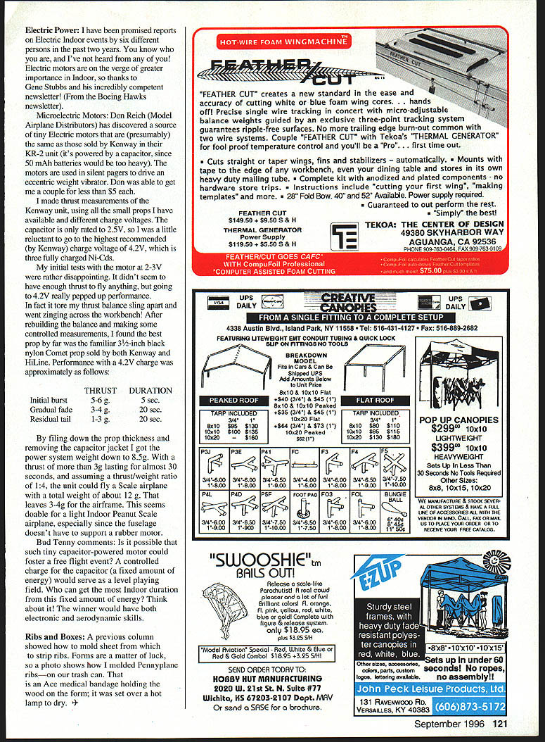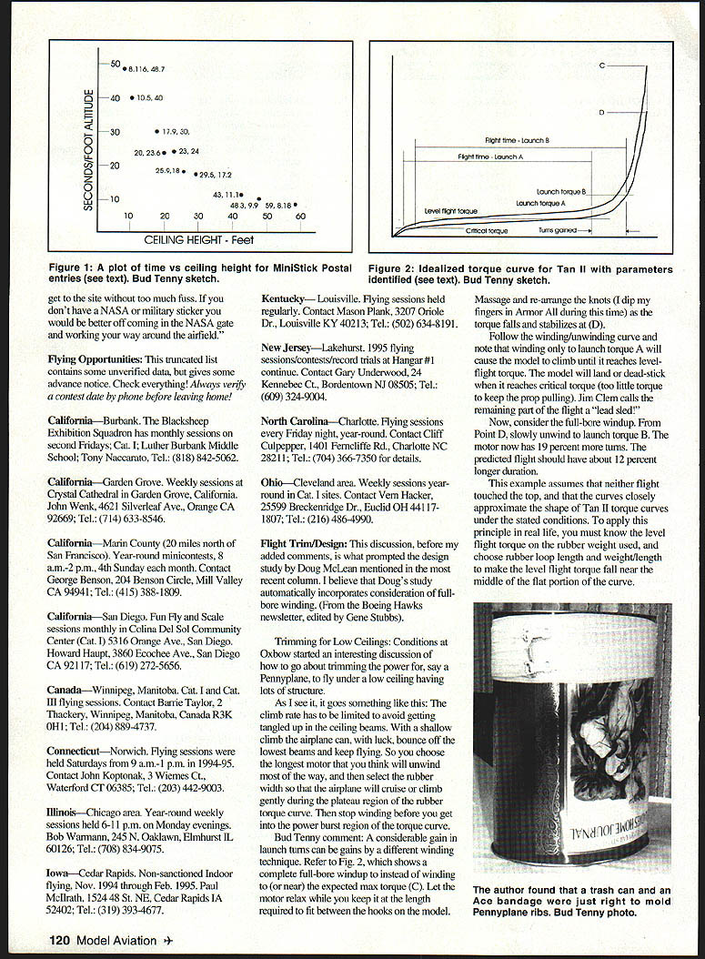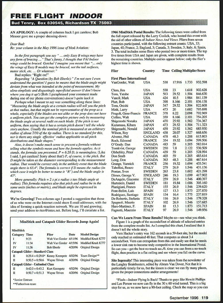 FREE FLIGHT INDOOR APOLOGY couple columns back got careless Bob Meuser gave proper dressing-down Dear Bud Re column May 1996 issue Mod Aviation first paragraph say . Easy B wings may have form bracing ts funny thought FAI Indoor wings could braced Gotcha imagine meant . wings Easy B models may braced tail surfaces motor stick etc . whatever Bud replies Right Regarding Question Bob Eberle Im sure understand question guess means blade angle might deviate what intended point measurement ultra-simplistic disgustingly superficial answer dont know dug up Bob paraphrased comment made during phone conversations doesnt quite hack Perhaps what meant say something along lines Measuring blaSe angle certain radius will tell pitch radius might representative prop whole especially blades alike prop does have uniform pitch can get complete picture measuring blade angle several radii blade pitch uniform saying has certain pitch doesnt tell whole story anyhow Usually nominal pitch measured arbitrary radius about 7/10 tip radius no standard nor single effective radius applicable pitch distributions blade shapes Also doesnt make much sense present formula telling what symbols mean formula applies As stands formula presented P D meaningless Like said got careless Sorry about P course pitch D might taken diameter corresponding measurement radius would correct unlikely event blade angle 6340 formula correct D means radius case might better name R blade angle 450 generally Pitch pi x radius x tan blade angle radius formula requires also pitch radius same units inches metric blade angle expressed degrees Growing Two columns ago posted suggestion us Internet could share E-mail addresses idea forming quick-reaction network 10 growing send address rten@intexnet Before long Ill circulate list 1966 MiniStick Postal Results following times culled full report released Larry Coslick hosted event aid other editors Indoor News Views Fliers seven countries participated following entrant counts USA 33 Japan 40 France 2 England 3 Canada 3 Sweden 3 Italy 6 Spain 3 total includes some fliers posted two times top five times USA Japan given complete results remaining countries Multiple entries appear below fliers highest time shown CountryTime Ceiling MultiplierScore Flier Ffrst Place International VanGorder Walt Clem Jim Toni Yatabe Vancil Mark Platt Bob Toni Onishi Mzik Larry Frugoli Gene-Francis Collins Walt Shigezoshi Nonaka Kazumasa Kihara Shigezashi Nonald Wilson Roy Alverez Phil Roch Edmond OGrady Dan Tomkvist George Olshefsky Peter Don Steeb Long Don Grange Yannick Tabellini Renzo Pontan Sven Dimes George V DeAngelo Giacomo Hartstrein Daniel Pianigiani Franco Font-Bellot Luis Rodriguez Santiago De Robertis Stefania Spagnoli Maurio Haro-Martinez F Fagnotti Maunzio USA USA JAPAN USA USA JAPAN USA FRANCE USA JAPAN JAPAN JAPAN ENGLAND CANADA FRANCE CANADA SWEDEN CANADA CANADA CANADA FRANCE ITALY SWEDEN ENGLAND ITALY SWEDEN ITALY SPAIN SPAIN ITALY ITALY SPAIN ITALY 538 17916 1733 932598 558 563 424 398 547 473 378 359 470 473 439 438 478 354 483 250 439 403 363 256 279 263 246 259 181 155 127 134 116 102 81 97 23 2952 105 8166 2952 20 822 8166 2592 2952 2592 2807 483 1952 59 78 59 59 483 1952 269 238 193 269 1984 269 133 164 269 269 133 269 1618 1504 1984 2101 1504 1682 2098 2101 1562 1504 1562 1527 1288 1694 1205 2122 1205 1205 1288 1694 1546 1602 1699 1546 1686 1546 1873 1775 1546 1546 1873 1546 902628 846670 841139 836138 822608 795698 792969 754205 734367 711323 685930 668656 615 803 599506 582014 530509 528994 485614 467614 433541 431136 421298 417902 400397 305160 239620 237870 237819 179328 157685 151713 149956 MiniStick Catapult Glider Records Jump Again MimStick Category Time I 923 IV 1134 IV ll36 Catapult Glider Standard Class II 0294 * Kenny Krempetz II 0505 Wayne Triven Catapult Glider UnlImited Class II 0420 Kurt Kremperz II 0507 Wayne Triven FlierDate Walt Van Gorder 4/11/96 Walt Van Gorder 4/15/96 Bob Eberle 4/20/96 Model Design Modified Knish K777 Modified Knish K777 Original Design 4/02/96 Team Design** 4/20/96 Original Design 4/02/96 Original Design 4/20/96 Original Design *Junior Entrant **Fafler/son team Can Learn Results Maybe sosee what think Figure 1 graph seconds/foot altitude selected entries complete results list As compiled chart realized doesnt tell whole story Vein Hackers entry 162 seconds 59-foot site model reached estimated 48 feet computes about 34 seconds/foot Vein can extrapolate easily see needs lower sink rate become truly competitive International Postal So can youget best no-touch secift time can no-touch flight practice flat ceiling see fall curve Site Ingenuity interesting piece taken newsletter Langley Brainbusters edited Abram Van Dover particularly timely us lesson clear can fly places given proper connections and/or arrangements FlashIndoor Flying Back Thanks guys like Hewitt Phillips Lee Person now can fly 30 x 60 wind tunnel big step us now have 90-foot ceiling Check map can September 1996 119 Figure 1 plot time vs ceiling height MiniStick Postal entries see text Bud Tenny sketch Figure 2 Idealized torque curve Tan II parameters identified see text Bud Tenny sketch get site too much fuss dont have NASA militaiy sticker would better off coming NASA gate working way around airfield Hying Opportunities truncated list contains some unverified data gives some advance notice Check everything Always venfy contest date phone before leaving home CaliforniaBurbank Blacksheep Exhibition Squadron has monthly sessions second Fridays Cat Luther Burbank Middle School Tony Naccarato Tel 818 842-5062 CaliforniaGarden Grove Weekly sessions Crystal Cathedral Garden Grove California John Wenk 4621 Silverleaf Ave Orange CA 92669 Tel 714 633-8546 CaliforniaMann County 20 miles north San Francisco Year-round minicontests 8 am-2 pm 4th Sunday month Contact George Benson 204 Benson Circle Mill Valley CA 94941 Tel 415 388-1809 CaliforniaSan Diego Fun Fly Scale sessions monthly Colina Del Sol Community Cen