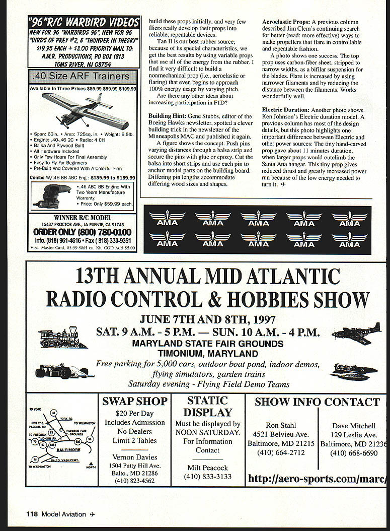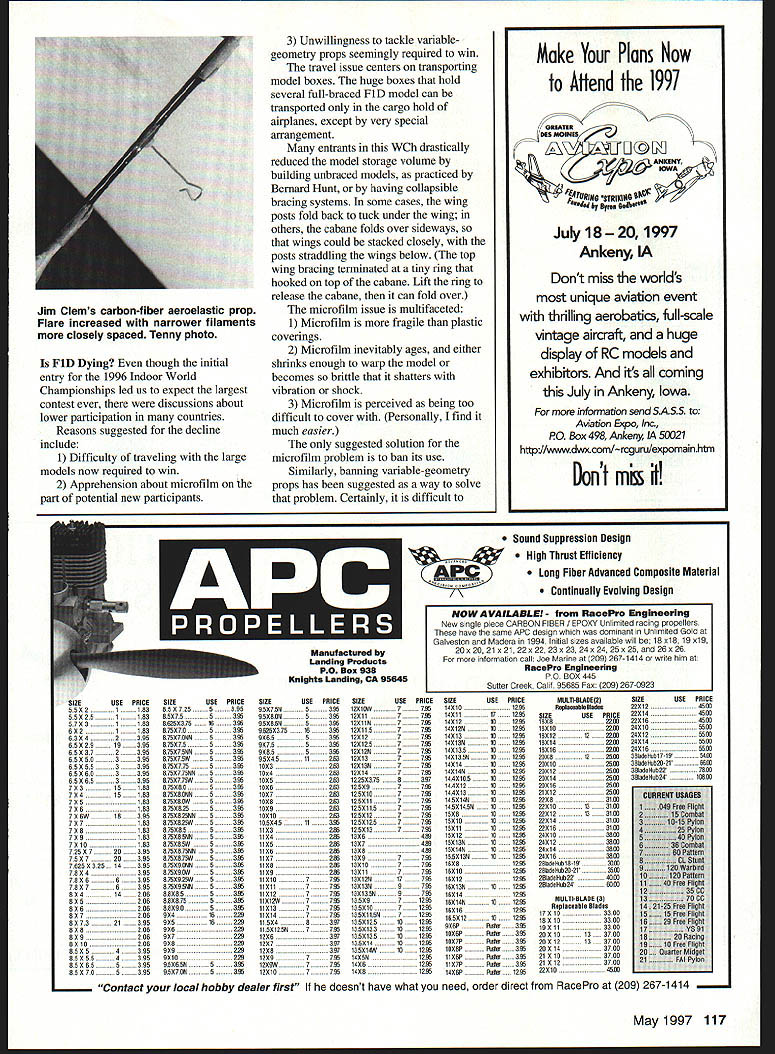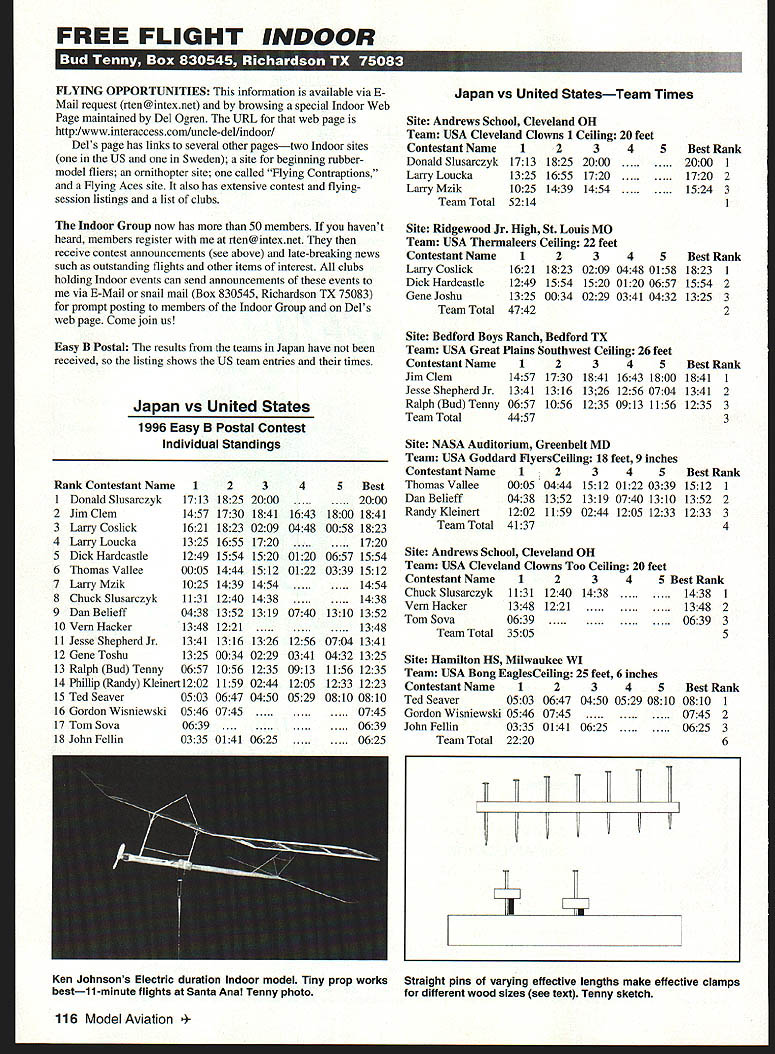 FREE FLIGHT INDOOR fr FLYING OPPORTUNITIES information available via E Mail request rten@intexnet browsing special Indoor Web Page maintained Del Ogren URL web page http/wwwinteraccesscomJuncledellindoorl Dels page has links several other pagestwo Indoor sites US Sweden site beginning rubbermodel fliers omithopter site called Flying Contraptions flying Aces site also has extensive contest flyingsession listings list clubs Indoor Group now has 50 members havent heard members register rten@intexnet receive contest announcements see above late-breaking news such outstanding flights other items interest clubs holding Indoor events can send announcements events via E-Mail snail mail Box 830545 Richardson TX 75083 prompt posting members Indoor Group Dels web page Come join us Easy B Postal results teams Japan have received listing shows US team entries times Japan vs United States 1996 Easy B Postal Contest Individual Standings 12 17131825 14571730 1621 1823 4 Larry Loucka13251655 S Dick Hardcastle12491554 6 Thomas Vallee00051444 7 Larry Mzik10251439 8 Chuck Slusarczyk11311240 9 Dan Belieff04381352 lOVeruHacker13481221 11 Jesse Shepherd Jr13411316 l2GeneToshu13250034 13 Ralph Bud Tenny06571056 14 Phillip RandyKleinertl2021159 15 Ted Seaver05030647 16 Gordon Wisniewski05460745 17 Tom Soya0639 l8JohnFellin03350141 3 2000 1841 0209 1720 1520 1512 1454 1438 1319 1326 0229 1235 0244 0450 0625 4 1643 0448 0120 0122 0740 1256 0341 0913 1205 0529 5 1800 0058 0657 0339 1310 0704 0432 1156 1233 0810 Best 2000 1841 1823 1720 1554 1512 1454 1438 1352 1348 1341 1325 1235 1223 0810 0745 0639 0625 Rank Contestant Name Donald Slusarczyk 2 Jim Clem 3 Larry Coslick Japan vs United StatesTeam Times Site Andrews School Cleveland OH Team USA Cleveland Clowns 1 Ceiling 20 feet Contestant Name 12 345 Donald Slusarczyk 1713 1825 2000 Larry Loucka 1325 1655 1720 Larry Mzik 1025 1439 1454 Team Total 5214 Site Ridgewood Jr High St Louis MO Team USA Thermaleers Ceiling 22 feet Contestant Name 1 2 3 4 5 Larry Coslick 1621 1823 0209 0448 0158 Dick Hardcastle 1249 1554 1520 0120 0657 Gene Joshu132500340229 0341 0432 Team Total 4742 Site Bedford Boys Ranch Bedford TX Team USA Great Plains Southwest Ceiling 26 feet Contestant Name1 2 34 5 Jim Clem145717301841 1643 1800 Jesse ShepherdJr 1341 1316 1326 1256 0704 RalphBudTenny 0657 1056 1235 0913 1156 Team Total 4457 Site NASA Auditorium Greenbelt MD Team USA Goddard FlyersCeiling 18 feet 9 inches Contestant Name 1 2 3 4 5 Thomas Vallee 0005 0444 1512 0122 0339 Dan Belieff043813521319 0740 1310 Randy Kleinert 1202 1159 0244 1205 1233 Team Total 4137 Best Rank 20001 17202 15243 1 Best Rank 18231 15542 13253 2 Best Rank 18411 13412 12353 3 Best Rank 15121 13522 12333 4 Site Andrews School Cleveland OH Team USA Cleveland Clowns Too Ceiling 20 feet Contestant Name1 2345 Best Rank Chuck Slusarczyk11311240143814381 Vein Hacker1348122113482 Tom Soya063906393 Team Total35055 Site Hamilton HS Milwaukee WI Team USA Bong EaglesCeiling 25 feet 6 inches Contestant Name1 2345 Ted Seaver 0503 0647 0450 0529 0810 Gordon Wisniewski 0546 0745 John Fellin 0335 0141 0625 Team Total 2220 Best Rank 08101 07452 06253 6 Straight pins varying effective lengths make effective clamps different wood sizes see text Tenny sketch 116 Model Aviation ITI111111 I1 Ken Johnsons Electric duration Indoor model Tiny prop works bestil-minute flights Santa Anal Tenny photo Jim Clems carbon-fiber aeroelastic prop Flare increased narrower filaments closely spaced Tenny photo FiD Dying though initial entry 1996 Indoor World Championships led us expect largest contest ever discussions about lower participation countries Reasons suggested decline include 1 Difficulty traveling large models now required win 2 Apprehension about microfilm part potential new participants USE PRICE 1183 55X251183 57031183 6221183 63X42388 65 22919395 85X372395 852503395 65X553385 850893395 650653388 70315183 70415183 720183 726183 726W19395 7X7183 708183 709183 7010183 725X725395 752728395 76250325.14395 7624395 79266395 78X78395 92414238 825208 926208 827208 907321395 808208 809206 8015206 85254395 850554395 800655395 800 705395 3 Unwillingness tackle variablegeometry props seemingly required won travel issue centers transporting model boxes huge boxes hold several full-braced FlD model can transported cargo hold airplanes except very special arrangement entrants WCh drastically reduced model storage volume building unbraced models practiced Bernard Hunt having collapsible bracing systems some cases wing posts fold back tuck under wing others cabane folds over sideways wings could stacked closely posts straddling wings below top wing bracing terminated tiny ring hooked top cabane Lift ring release cabane can fold over microfilm issue multifaceted 1 Microfilm fragile plastic coverings 2 Microfilm inevitably ages either shrinks enough warp model becomes brittle shatters vibration shock 3 Microfilm perceived being too difficult cover Personally find much easier suggested solution microfilm problem ban its use Similarly banning variable-geometry props has suggested way solve problem Certainly difficult Sound Suppression Design h Thrust Efficiency Long Fiber Advanced Composite Material FJ2 Continually Evolving Design SIZEUSEPRICE 85 07255 395 8527552W 86282275182W a7507052W 2782708852W 87507552W 8750758853W 875275WS3W 9750775S328 975X775N8S2W 8782775WS2W 87528052W 87528WINS2W 275088W52W 8752225S2W &752825N852W 8752828W5328 87522552W 8752858852W 875285W52W 97522788852W 2752875WS2W 87528088S2W 875295WS2W 8752928W52W 2752958852W 88285S2W 882875S2W 880905328 92418228 925182W 928228 927229 908229 909239 9210228 95265852W 95070852W Manufactured Landing Products PO Box 938 Knights Landing CA 95645 SIZEUSE PRICESIZEUSE PRICESIZE558 PRICEMULI1-RIADE2 95275852W12215W77W1421012WRepIaceabIeBIadeE 95080852W1221177W142111712WSIZEUSE PRICE 95088852W12211877W1421210122818282262 98252375182W12211577W1421281012W180102262 906552W1221277W142131012W18212122262 9075S2W