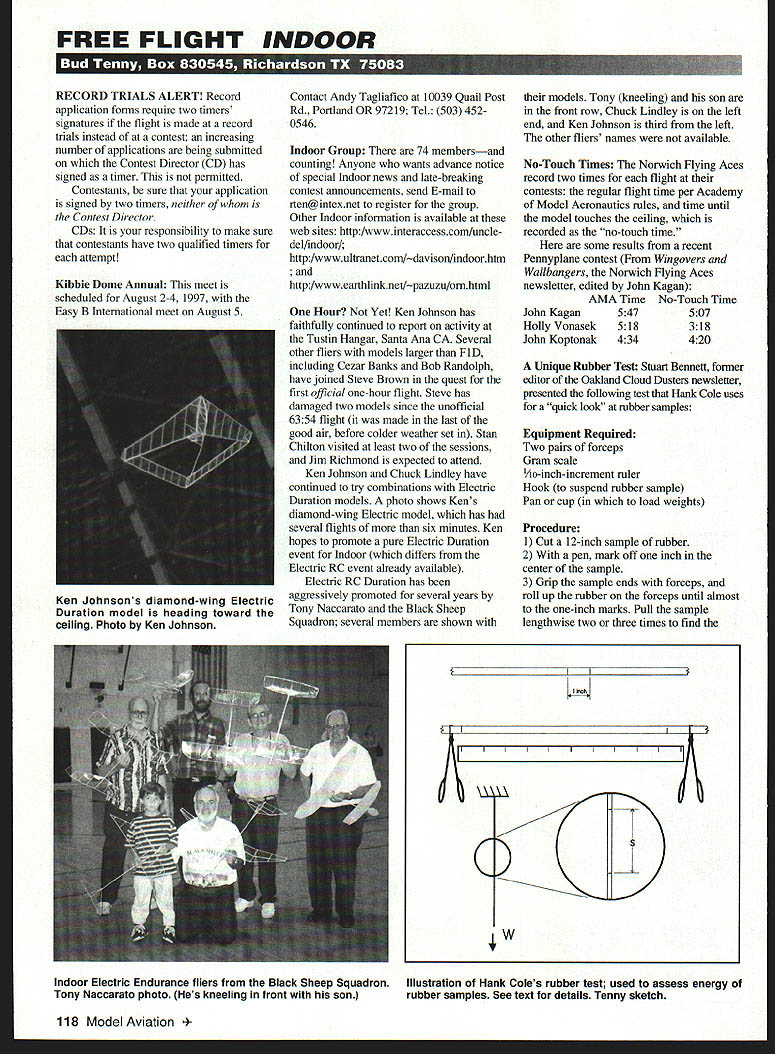 FREE FLIGHT INDOOR RECORD TRIALS ALERT Record application forms require two timers signatures flight made record trials instead contest increasing number applications being submitted Contest Director CD has signed timer permitted Contestants sure application signed two timers neither Contest Director CDs It responsibility make sure contestants have two qualified timers attempt Kibbie Dome Annual meet scheduled August 2-4 1997 Easy B International meet August 5 Contact Andy Tagliafico 10039 Quail Post Rd Portland OR 97219 Tel 503 4520546 Indoor Group 74 membersand counting Anyone wants advance notice special Indoor news late-breaking contest announcements send E-mail rten@intexnet register group Other Indoor information available web sites http/wwwinteraccesscomluncle del/indoor http/wwwultranetcom/davison/indoorhtm http/wwwearthlinknetlpazuzu/omhtml Hour Yet Ken Johnson has faithfully continued report activity Tustin Hangar Santa Ana CA Several other fliers models larger FiD including Cezar Banks Bob Randolph have joined Steve Brown quest first official one-hour flight Steve has damaged two models since unofficial 6354 flight made last good air before colder weather set Stan Chilton visited least two sessions Jim Richmond expected attend Ken Johnson Chuck Lindley have continued try combinations Electric Duration models photo shows Kens diamond-wing Electric model has several flights six minutes Ken hopes promote pure Electric Duration event Indoor differs Electric RC event already available Electric RC Duration has aggressively promoted several years Tony Naccarato Black Sheep Squadron several members shown models Tony kneeling son front row Chuck Lindley left end Ken Johnson third left other fliers names available No-Touch Times Norwich Flying Aces record two times flight contests regular flight time per Academy Model Aeronautics rules time until model touches ceiling recorded no-touch time some results recent Pennyplane contest Win govers Walibangers Norwich Flying Aces newsletter edited John Kagan AMA Time No-Touch Time John Kagan547507 Holly Vonasek518318 John Koptonak434420 Unique Rubber Test Stuart BenneW former editor Oakland Cloud Dusters newsletter presented following test Hank Cole uses quick look rubber samples Equipment Required Two pairs forceps Gram scale Ao-inch-increment ruler Hook suspend rubber sample Pan cup load weights Procedure 1 Cut 12-inch sample rubber 2 pen mark off inch center sample 3 Grip sample ends forceps roll up rubber forceps until almost one-inch marks Pull sample lengthwise two three times find I.1 Illustration Hank Coles rubber test used assess energy rubber samples See text details Tenny sketch 118 Model Aviation Johnsons diamond-wing Electric Duration model heading toward ceiling Photo Ken Johnson Th\ oor Electric Endurance fliers Black Sheep Squadron Tony Naccarato photo Hes kneeling front son maximum stretch will take considerable force Tan II s 1 inches 4 Tie ioops both ends sample Hang sample hook pan cup lower end Load weights until rubber stretch 58 s-i 1 See illustration 5 Weigh rubber sample wt b Weigh weight W Note W wt must same units grams ounces 6 Energy ote E expressed ft lbflb Typical numbers wt grams s nches W grams E 537 g 101 ft lbilb Additional notes 1 sure include weight container W 2 Samples will usually yield energy ratings high example Often variables within rubber skein 34000-4100 average Energy range 4 sample weight critical measurement Use accurate gram scale Indoor scale etc Put Tool Box Brainbusters Newsletter edited Abram Van DoverThis JackMcGillivray old issue information still current will help decide what size length motor use Im serious about puffing tool box book keep information dont can look tool boxThanks help Jack Optimization Rubber Motor Size object utilize maximum number turns wound rubber motor during efficient flight model should land floor just turns used up Following methods achieving Problem 1 Aircraft runs out turns above floor overpowered Solutions Use different motor smaller cross section maintaining increasing its overall length Use different motor originalcross section increased length Increase propeller pitch and/or propeller diameter motor new problem will diminish somewhat motor breaks Problem 2 Aircraft lands unused turns left motor underpowered Solutions Shorten existing motor Use another motor larger crosssection maintaining shortening overall motor length Decrease propeller pitch and/or propeller diameter Scale Warbirds 57 6075 91120 4 stroke 544560/609l4stroke 686075 91120 4 stroke 616075 /911204 stroke 596075 /911204 stroke Prices subject change notice $17499 $16499 $20499 $19499 $17999 S/H 4 & h4 Working Tomorrows Technology S Camino Seco #415 Tucson AZ 85710 e/FAX 520 886-3678 Worlds Most Unique Aviation Event RADIO CONTROLLED AND FULLSCALE AIRSHOW Huge Display R/G Models Control Line Flying r RIG Flying 5 Days r Pilot Appreciation Dinner Trainer Flying Brought Ii part KCCI r Static Model Contest 2 R/C Exhibitors Exhibitor Demos -Scale Combat JPO Sanctioned Event jZc R/C Auction general show information call 515-964-2000 try FAX BACK number 515-964-0558 receive fax general show pilot vendor travel lodging camping regional airport information may also visit Web Site http//www dwxcom/-rcguru/expomain htm July 16- 20 1997 July 166 17 H/C Flying 9- 7 July 1820 H/C Flying 9 4 Show 4 keny Exposition Park Ankeny IA r Star Aerobatic Team Hornet r Russian Yak-55M r Sky Fighters Demo r Comedy Club Act r Full-Scale Rides r Vintage Aircraft DU MCN1S7C# 4reR NB StB ewe BP5 &&v By. 9Jh P51 F4U AT6 F/W 190 A6M2 ru urgeui Striking Back Production Airshow Fantastic Pyro considering solutions either problem keep parameters mind possible rubber motor weight should exceed airframe weight twice airframe weight aircraft motors heavy cant utilized because high wing loading See note 1 motor length 2 times longer aircraft motor base vibration risk rubber bunching can occur spoiling good flights because center-of-g