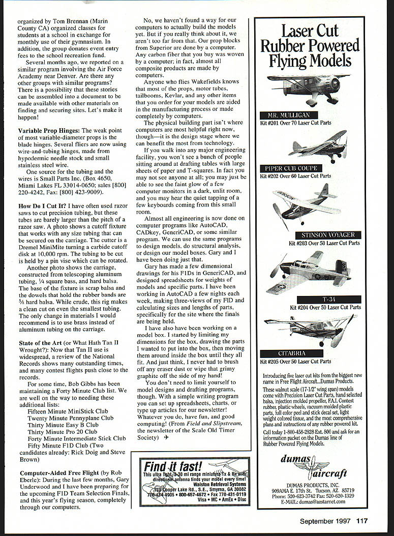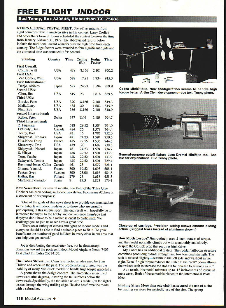 FREE FLIGHT INDOOR U NTERNATIONAL POSTAL MEET Sixty-five entrants eight countries flew nineteen sites contest Larry Coslick other fliers St Louis scheduled contest cover time January 1 -March 31 1977 abbreviated results below include traditional award winners plus high time country fudge factors rounded four significant digits corrected time rounded 1/10 second Standing First Overall Collins Walt First USA Van Gorder Walt First International Danjo Akihiro Second USA Clem Jim Third USA Brocks Peter Mzik Larry Platt Bob Second International Keller Peter Third International Z Fujiwara OGrady Dan Tenny Bud Shigezoshi Nonaka Hua-Nboc Trung Slusarczyk Don Shigeyoshi Nonari S Miuya Torn Yatabe Sadayeshi Tomita Raymond-Jones Collin Grange Yannick Pentan Sven Halhis Kai Martinez Fernando Country Time Ceiling Fudge ft Factor USA 438 8166 Time 2101 9202 USA528179117349153 Japan527 2423 1594 8399 Cobra MiniSticks New configuration seems handle high USA5192316188395torque better Jim Clem developmentsee text Tenny photo USA3908166 USA48520 USA3868166 2101 1682 2101 8193 8159 8109 Switz377 8042108 7947 Japan Canada USA Japan France USA Japan Japan Japan Japan Canada France Sweden Finland Spain 528 484 421 471 485 439 461 488 488 485 461 300 300 279 91 2952 25 16 2423 2755 20 2423 2952 2952 2952 25 1952 2306 23 133 1504 1579 1786 1594 1535 1682 1594 1504 1504 1504 1579 1693 1616 1618 1873 7940 7644 7520 7506 7445 7385 7347 7339 7339 7294 7281 5081 4848 4513 1704 New Newsletter several months Joe Kehr Tulsa Glue Dobbers has editing Indoor newsletter issue #2 statement purposes goals news sheet provide communications entry level Indoor modeler casually participating unique sport end result will hopefully introduce them/you hobby convenience them/you they/you dont have rocket scientist participate challenge join us have great time variety classes types Indoor models everyone should able find suitable place fit benefit number good builders class area can help get started Joe distributing newsletter free does accept donations toward postage Indoor Model Airplane News 7405 East 82nd P1 Tulsa OK 74133 Cobra Strikes Jim Clem resurrected idea used Stan Chilton others past problem being chased inability MiniStick models handle high torque gracefully photo shows design concept motorstick inclined downward nine degrees lowering tail surfaces below downwash Specifically thrnstline Jims model right passes through wing trailing edge also has flown model subrudder Much Torque Jim routinely uses 1 inch-ounces torque model normally climbs out smoothly slowly despite Coslick prop requires high drive Cobra has additional feature rndder/tailboom structure combines good longitudinal strength low torsional strength stab twisted slightlywashin left side washout right high torque reduces stab tilt soft boom allows twisted stab increase stab tilt increase much 200 As result model tolerates up 13 inch-ounces torque cases Both models placed International Postal Meet Finding Sites club has secured use site trading services periodic use site group 116 Model Aviation ral-purpose cutoff fixture uses Dremel MiniMite tool See text explanations Bud Tenny photo Close-up carriage Precision tubing allows smooth sliding action Suggest brass instead aluminum shown organized Tom Brennan Mann County CA organized classes students school exchange monthly use gymnasium addition group donates event entry fees school recreation fund Several months ago reported similar program involving Air Force Academy near Denver Are other groups similar programs possibility stories can assembled document made available other materials finding securing sites Lets make happen Variable Prop Hinges weak point variable-diameter props blade hinges Several fliers now using wire-and-tubing hinges made hypodermic needle stock small stainless steel wire source tubing wires Small Parts Inc Box 4650 Miami Lakes FL 33014-0650 sales [800] 220-4242 Fax [800] 423-9009 Cut have often used razor saws cut precision tubing tubes barely larger pitch razor saw photo shows cutoff fixture works size tubing can secured carriage cutter Dremel MiniMite turning carbide cutoff disk 10000 rpm tubing cut held pin vise can rotated Another photo shows carriage constructed telescoping aluminum tubing re bass hard balsa base fixture scrap balsa dowels hold rubber bands 5/ hard balsa crude rig makes clean cut smallest tubing change materials would recommend use brass instead aluminum tubing carriage State Art What Hath Tan II Wrought Now Tan II use widespread review National Records shows outstanding times contest flights push close records some time Bob Gibbs has maintaining Forty Minute Club list well way needing additional lists Fifteen Minute MiniStick Club Twenty Minute Pennyplane Club Thirty Minute Easy B Club Thirty Minute Pro 20 Club Forty Minute Intermediate Stick Club Fifty Minute FiD Club Two candidates already Rick Doig Steve Brown Computer-Aided Free Flight Rob Eberle During last few months Gary Underwood have preparing upcoming FlD Team Selection Finals years flying season completely through computers No havent found way computers actually build models yet really think about arent too far prop blocks Superior done computer Any carbon fiber buy woven computer fact almost composite products made computers Anyone flies Wakefields knows props motor tubes tailbooms Keviar other items order models aided manufacturing process made completely computers physical building part isnt computers helpful right now thoughit design stage can benefit technology walk major engineering facility wont see bunch people sitting around drafting tables large sheets paper T-squares fact may see anyone may just able see faint glow few computer monitors dark unlit room may hear quiet tapping few keyboards coming small room Almost engineering now done computer programs like AutoCAD CADkey GeneriCAD some similar program can use same programs design models structural analysis design model boxes Gary have doing just 