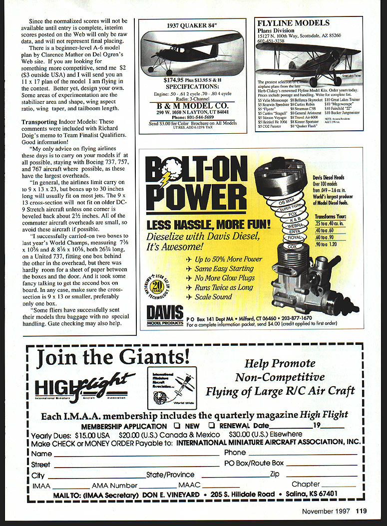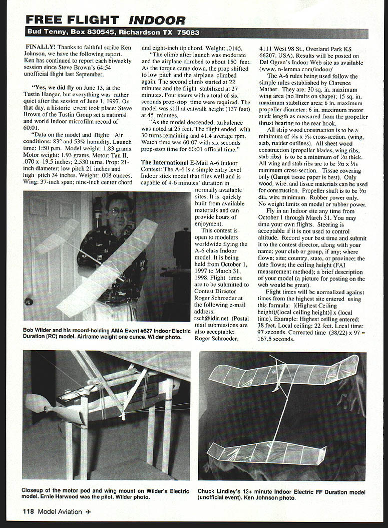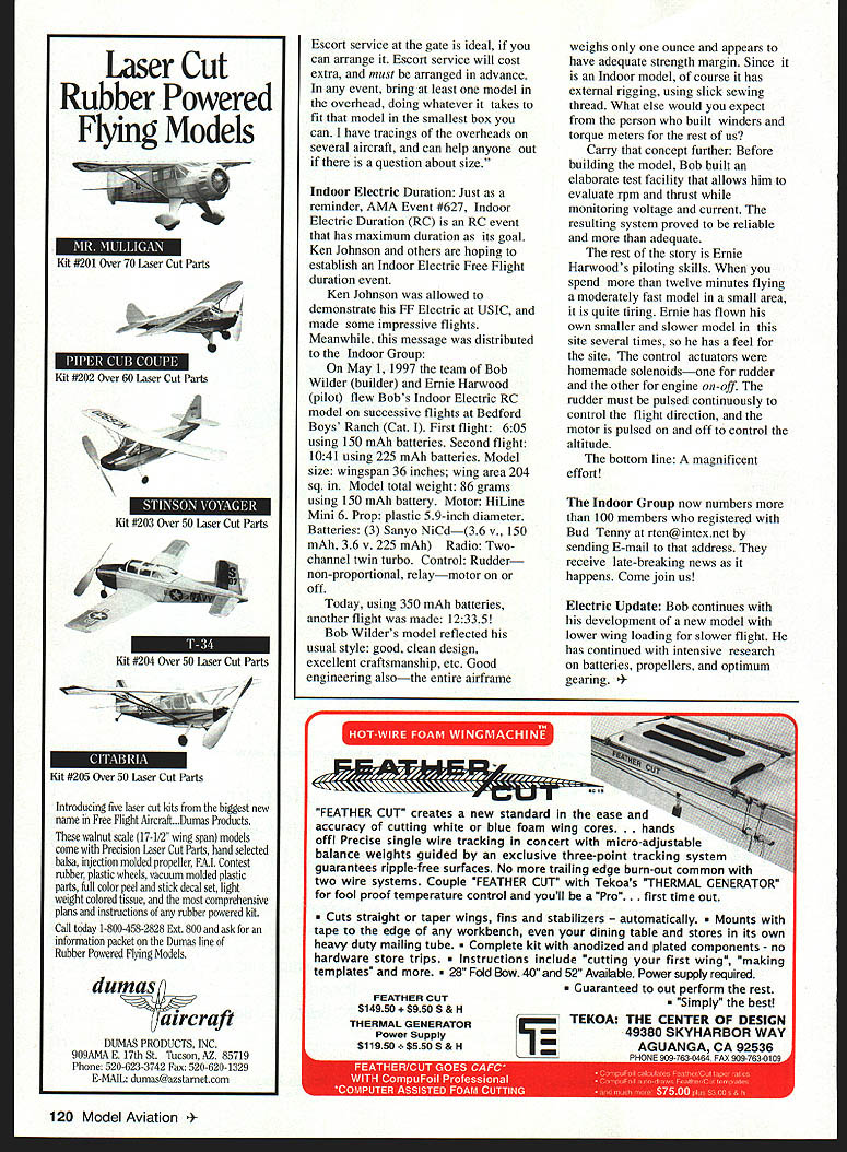 FREE FLIGHT INDOOR FINALLY Thanks faithful scribe Ken Johnson have following report Ken has continued report biweekly session since Steve Browns 6454 unofficial flight last September Yes did fly June 15 Tustin Hangar everything rather quiet after session June 11997 day historic event took ptace Steve Brown Tustin Group set national world Indoor microfilm record 6001 Data model flight Air conditions 830 53% humidity Launch time 150 pm Model weight 183 grams Motor weight 193 grams Motor Tan II 070 x 195 inches 2530 turns Prop 21inch diameter low pitch 21 inches high pitch 34 inches Weight 008 ounces Wing 37-inch span nine-inch center chord eight-inch tip chord Weight 0 145 climb after launch moderate airplane climbed about 150 feet As torque came down prop shifted low pitch airplane climbed again second climb started 22 minutes flight stabilized 27 minutes Four steers total six seconds prop-stop time required model still catwalk height 137 feet 45 minutes As model descended turbulence noted 25 feet flight ended 30 turns remaining 414 average rpm Watch time 6007 six seconds prop-stop time 6001 official time International E-Mail A-6 Indoor Contest A-6 simple entry level Indoor stick model flies well capable 4-6 minutes duration normally available sites quickly built available materials can provide hours enjoyment contest open modelers worldwide flying A-6 class Indoor model being held October 1 1997 March 31 1998 Flight times submitted Contest Director Roger Schroeder following e-mail address rsch@idirnet Postal mail submissions also acceptable Roger Schroeder 4111 West 98 St Overland Park KS 66207 USA Results will posted Del Ogrens Indoor Web site available www n-lemmacom/indoor/ A-6 rules being used follow simple rules established Clarence Mather 30 sq maximum wing area no limits shape 15 sq maximum stabilizer area 6 maximum propeller diameter 6 maximum motor stick length measured propeller thrust bearing rear hook strip wood construction minimum 1/16 x 1/16 cross-section wing stab rudder outlines sheet wood construction propeller blades wing ribs stab ribs minimum l/2 thick wing stab ribs A2 x minimum cross-section Tissue covering Gampi tissue paper best Only wood wire tissue materials can used construction Propeller shaft 1A2 dia wire minimum Rubber power No weight limits model rubber power Fly Indoor site time October 1 through March 31 may time own flights Steering acceptable used control altitude Record best time submit contest director along name club group flown site country state province date flown ceiling height FAJ measurement method brief description model picture posting web would great Flight times will normalized against times highest site entered using formula [Highest Ceiling height/local ceiling height] x local time Example Highest ceiling entered 38 feet Local ceiling 22 feet Local time 97 seconds Corrected time 38/22 x 97 seconds 118 Model Aviation Wilder record-holding AMA Event #627 Indoor Electric Duration RC model Airframe weight ounce Wilder photo Closeup motor pod wing mount Wilders Electric Chuck Lindleys 13 minute Indoor Electric FF Duration model model Ernie Harwood pilot Wilder photo unofficial event Ken Johnson photo Since normalized scores will available until entry complete interim scores posted Web will raw data will represent final placing beginner-level A-6 model plan Clarence Mather Del Ogrens Web site looking something competitive send $2 $3 outside USA will send lix 17 plan model lam flying contest Better yet design own Some areas experimentation stabilizer area shape wing aspect ratio wing taper tailboom length Transporting Indoor Models comments included Richard Doigs memo Team Finalist Qualifiers Good information advice flying airlines days carry models possible staying Boeing 737 757 767 aircraft possible have largest overheads general airlines limit carry 9 x 13 x 23 boxes up 30 inches long will usually fit jets 9 x 13 cross-section will fit older DC9 Stretch aircraft unless corner beveled back about 21/2 inches commuter aircraft overheads small avoid aircraft possible successfully carried-on two boxes last years World Champs measuring 73/g x 10/s & 8/s x 10/ both 26 long United 737 fitting box behind other overhead hardly room sheet paper between boxes door took some fancy talking get second box board case make sure crosssection 9 x 13 smaller preferably box Some fliers have successfully sent models thru baggage no special handling Gate checking may also help 1937 QUAKER 84 B & M MUIJEL Co 290 W 1050 N LAYTON UT 84041 Phone 801-544-5689 Send $300 Color Brochure Models UT RES 6125% TAX FLYLINE MODELS Plans Division 151 7 N 100th way Scottsdale AZ 85260 GiantsHelp Promotei hIm.d IHIGNon-Competitive ..... ~ Flying Large RIC Air Craft AA membership includes quarterly magazine High Flight I MEMBERSHIP APPUCAllON 0 NEW 0 RENEWAL Date_________ _____ I Yearly Dues $1500 USA $2000 US Canada & Mexico $3000 US Elsewhere 19I Make CHECK MONEY ORDER Payable INTERNATiONAL MINIATURE AIRCRAFT ASSOCIATION INC I Name _________________ Phone ___________ I Street _____________________________________ P0 Box/Route Box ________________ I________________________ 1CityState/Province ________________Zip IMAA_______ AMA Number________ MAAC ________Chapter L TO IMAA Secretary DON E VINEYARD Hilidole Road no KS 67401 November1997 119 Plus $1395 S & H SPECIFICATIONS Engine 50 61 2 cycle 70 804 cycle Radio 3-Channel gecatest selegtl0trfltT ajeplane plans las Herb Clukeys renowned Flyline its Order yours today Peices include postage handlingse complete list $5 Velie Monecoupe$8 Bellonca Skyeocket$10 Great Lakes Tealnee $5 Rearwin Speedster $8 Cuniss Robin$10 Megoacoupe $5 Plyctte58 Steatusm C3B$10 Faiechild 22 $5 Cnniss Seagoll$8 General Aeistocrat$10 Backee Jungmeister $5 Stinsun Voyagee$8 Teavcl Aie 6000 $5 Heinkel lOOd$5 Kinner Sponsteeoea 715% $5 C02 Fnnster$5 Quakee Rash T-ON OWED LESS HISSLE MOE N Y Dieselize Davis Diesel Its Awesome Up 50% Power Same Easy Starting No Gl