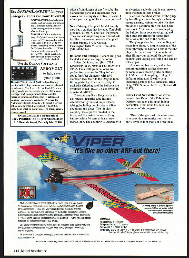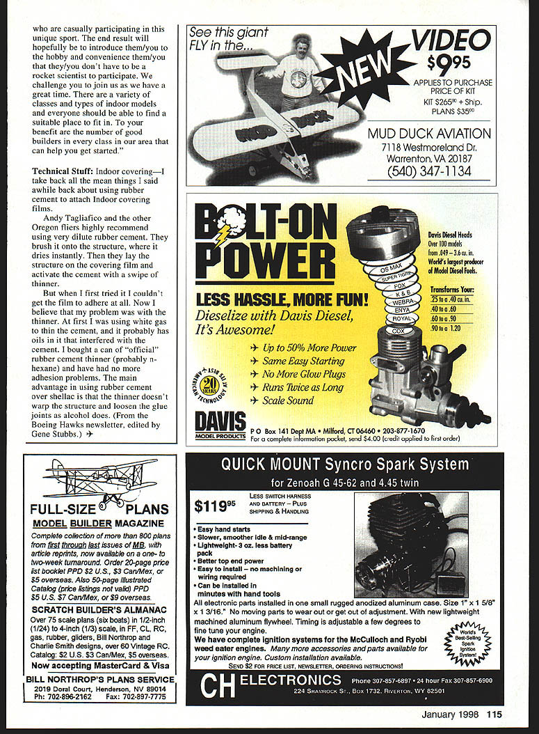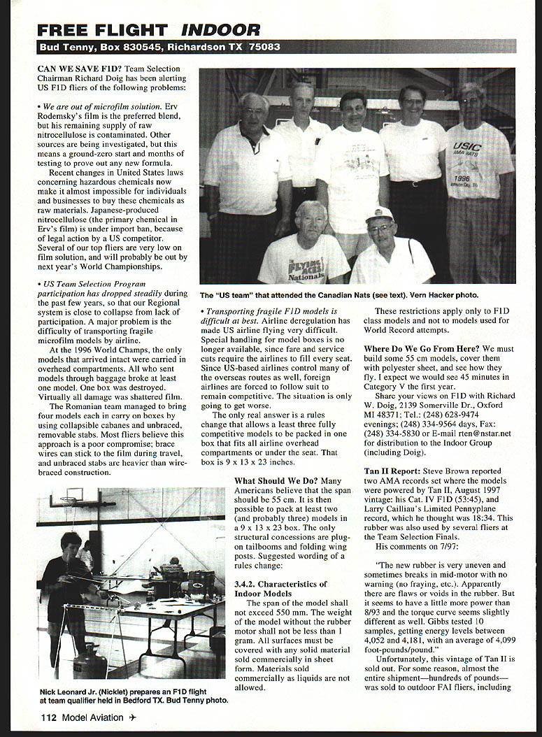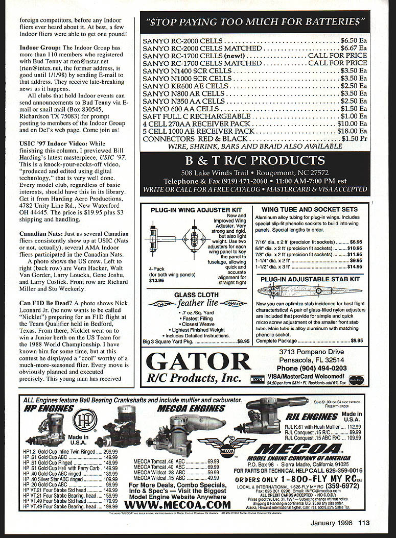 FREE FLIGHT INDOOR 1 r m rI rs1inuy CAN WE SAVE FiD Team Selection Chairman Richard Doig has alerting US FiD fliers following problems out microfilm solution Erv Rodemskys film preferred blend remaining supply raw nitrocellulose contaminated Other sources being investigated means ground-zero start months testing prove out new formula Recent changes United States laws concerning hazardous chemicals now make almost impossible individuals businesses buy chemicals raw materials Japanese-produced nitrocellulose primary chemical Ervs film under import ban because legal action US competitor Several top fliers very low film solution will probably out next years World Championships US Team Selection Program participation has dropped steadily during past few years Regional system close collapse lack participation major problem difficulty transporting fragile microfilm models airline 1996 World Champs models arrived intact carried overhead compartments sent models through baggage broke least model box destroyed Virtually damage shattered film Romanian team managed bring four models carry boxes using collapsible cabanes unbraced removable stabs Most fliers believe approach poor compromise brace wires can stick film during travel unbraced stabs heavier wirebraced construction Transporting fragile FID models difficult best Airline deregulation has made US airline flying very difficult Special handling model boxes no longer available since fare service cuts require airlines fill seat Since US-based airlines control overseas routes well foreign airlines forced follow suit remain competitive situation going get worse real answer rules change allows least three fully competitive models packed box fits airline overhead compartments under seat box 9 x 13 x 23 inches What Should Americans believe span should 55 cm possible pack least two probably three models 9 x 13 x 23 box structural concessions plugon tailbooms folding wing posts Suggested wording rules change 342 Characteristics Indoor Models span model shall exceed 550 mm weight model rubber motor shall less 1 gram surfaces must covered solid material sold commercially sheet form Materials sold commercially liquids allowed restrictions apply FiD class models models used World Record attempts Go must build some 55 cm models cover polyester sheet see fly expect would see 45 minutes Category V first year Share views FiD Richard W Doig 2139 Somerville Dr Oxford MI 48371 Tel 248 628-9474 evenings 248 334-9564 days Fax 248 334-5830 E-mail rten@nstarnet distribution Indoor Group including Doig Tan II Report Steve Brown reported two AMA records set models powered Tan II August 1997 vintage Cat IV FiD 5345 Larry Cailliau s Limited Pennyplane record thought 1834 rubber also used several fliers Team Selection Finals comments 7/97 new rubber very uneven sometimes breaks mid-motor no warning no fraying etc Apparently flaws voids rubber seems have little power 8/93 torque curve seems slightly different well Gibbs tested 10 samples getting energy levels between 4052 4181 average 4099 foot-pounds/pound Unfortunately vintage Tan II sold out some reason almost entire shipmenthundreds poundswas sold outdoor FAI fliers including 112 Model Aviation eam attended Canadian Nats see text Vein Hacker photo Nick Leonard Jr Nicklet prepares Fl D flight team qualifier held Bedford TX Bud Tenny photo foreign competitors before Indoor fliers ever heard about best few Indoor fliers able get pound Indoor Group Indoor Group has 110 members registered Bud Tenny rten@nstarnet rten@intexnet former address good until 1/1/98 sending E-mail address receive late-breaking news happens clubs hold Indoor events can send announcements Bud Tenny via E mail snail mail Box 830545 Richardson TX 75083 prompt posting members Indoor Group Dels web page Come join us USIC 97 Indoor Video finishing column previewed Bill Hardings latest masterpiece USJC 97 knock-your-socks-off video produced edited using digital technology very well done model club regardless basic interests should have its library Get Harding Aero Productions 4782 Unity Line Rd New Waterford OH 44445 price $1995 plus $3 shipping handling Canadian Nats Just several Canadian fliers consistently show up USIC Nats actually several AMA Indoor fliers participated Canadian Nats photo shows US crew Left right back row Vein Hacker Walt Van Gorder Larry Loucka Gene Joshu Larry Coslick Front row Richard Miller Stu Weckerly Can FiD Dead photo shows Nick Leonard Jr now wants called Nicklet preparing FlD flight Team Qualifier held Bedford Texas Nicklet went win Junior berth US Team 1988 World Championship have known him some time contest displayed cool worthy much-more-seasoned flier move obviously planned executed precisely young man has received SANYO RC-2000 CELLS$650 Ea SANYO RC-2000 CELLS MATCHED$667 Ea SANYO RC-1700 CELLS newCALL FOR PRICE SANYO RC-1700 CELLS MATCHEDCALL FOR PRICE SANYO N1400 SCR CELLS$350 Ea SANYO Ni 000 SCR CELLS$350 Ea SANYO KR600 AE CELLS$250 Ea SANYO N800 AR CELLS$350 Ea SANYO N350 AA CELLS$250 Ea SANYO 600 AA CELLS$150 Ea SAFT FULL C RECHARGEABLE$100 Ea 4 CELL 270AA RECEIVER PACK$1000 Ea 5 CELL 1000 AE RECEIVER PACK$1800 Ea CONNECTORS RED & BLACK$150 Pr WIRE SHRINK BARS AND BRAID ALSO AVAIMBLE PLUG-IN WING ADJUSTER KIT New iiImproved Wing Adjuster Very strong rigid also light weight Use two adjusters wing panel key panel fuselage allowing quick accurate alignment straight flight 4-Pack tor both wing panels $1295 GLASS CLOTH 7 oziSq Yard Fastest Filling Closest Weave Lightest Finished Weight Includes Detailed Instructions Big 3 Square Yard Pkg$895 GATOR WING TUBE AND SOCKET SETS Aluminum alloy tubing plug-in wings Includes special slip-fit phenolic sockets build wing panels Special lengths order 7/16 die x 2 ft precision fit sockets$895 5/8 dia x 2 ft precision fit sockets$1095 7/8 dia x 2 ft precision fit sockets$1195 1-1/4diax2fV$995 1-1/2diax3ft$1495 PLUG-IN ADJUSTABLE STAB KIT Now can optimize stab incidence best flight ch