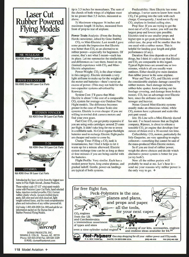 FREE FLIGHT INDOOR fW A-6 FOLLOW-UP has lot activity Internet regarding International E-Mail A-6 Indoor Contest announced November 1997 column Special note request A-6 plan mentioned please send requests R Schroeder 4111 West 98 St Overland Park KS 66207 Any other address will delay receipt plan Access web site http/n lemmacomla6/ap6/theap6html step-bystep text-and-picture guide building A-6 Del Ogren has done excellent job familiar what possible Internet will surprised Addendum A-6 Rules left out rules given column A-6 propeller blades flat pieces cut A2 sheet cannot cambered twisted total diameter can exceed six inches makes easy prop beginners make Despite crude arrangement A-6 props appear reasonably efficient Indoor RC Electric Duration Follow-up Bob Wilder has done againtwo ways First has flown Electric FF model no radio powered two 50 mA cells 10 minutes Bedford TX site Note currently no AMA class model follows guidelines developed Ken Johnson others flying Tustin hangars Santa Ana preliminary submitting rules proposal class Second has drastically redesigned RC Duration model airplane Indoor RC Electric AMA event #627 flown 4119 Bedford Boys Ranch Cat site Although Bob has become fairly good RC pilot model flown Ernie Harwood previous model during its record flight model weighed 114 grams wing area 248 square inches motor German coreless driving carbon-fiber propeller through handmade 81 ratio gear box power four 350-tnAh cells Indoor Group now has 130 members Join us sending request Bud Tenny rten@nstarnet Note change address time issue arrives previous address may phased out Current members please update address lists Prop Testing via Video previous column mentioned Jim Clems prop testing basic technique entails using small electric motor drive prop under test photo shows close-up mechanism motor gear mechanism mounted pivoted bar drives torque scale shown Jim records voltage current required drive prop some given torque level rpm measured present using mechanical tachometer loads system somewhat An electronic tachometer planned will remove load greater accuracy After props input parameters torque vs rpm measured moved pendulumtype thrust stand driven same test power photo shows thrust stand second test measures thrust developed test prop test power input adding video camera mix Jim can record props performance torque stand play hack slow motion single-frame stop-frame Photos show playback session Before test recorded Jim made sure prop tracking botb blades rotating same plane Under 4 inch-ounces torque photos show blade flaring other white rectangle front prop sets reference point visual distance between prop leading edge photos shows amount unequal flare Before used video camera Jim used StrobotacrM watch prop under test StrobotnerM bright strobe light driven calibrated oscillator oscillator set correct frequency prop illuminated same position revolution appears stand still Reading oscillator frequency gives revolutions/second multiply 60 get rpm instrument synchronized prop possible view distortion prop applied torque No-Cal Scale Events As someone dedicated duration events am both amazed bewildered possible variety No-Cal class well models fly item came Oklahoma City group OKC Rules Civilian No-Cal Mass Launch 1 Model must reasonable representation civilian aircraft produced after 1920 have unusual project bring documentation 2 Minimum weight 62 grams 3 Maximum prop diameter seven inches 4 Maximum wing chord measured halfway between center wing March1998 117 Jim Clems prop torque stand see text Tenny photo Rpm measured mechanical tachometer Torque scale rear Clems thrust stand prop driven predetermined torque resulting thrust measured Clem photo Replay video record torque standReplay video record torque stand first blade White rectangle used asecond blade Note change flare reference Tenny photocompared first blade Tenny photo Laser Cut Rubber Powered Flying Models Kit #201 Over 70 Laser Cut Parts Kit #202 Over 60 Laser Cut Parts Kit #203 Over 50 Laser Cut Parts #204 Over 50 Laser Cut Parts Kit #205 Over 50 Laser Cut Parts Introducing five laser cut kits biggest new name Free Flight Aircraft.Dumas Products walnut scale 17-1/2 wing span models come Precision Laser Cut Parts hand selected balsa injection molded propeller FAl Contest rubber plastic wheels vacuum molded plastic parts full color peel stick decal set light weight colored tissue comprehensive plans instructions rubber powered kit Call today 1-800-458-2828 Ext 800 ask information packet Dumas line Rubber Powered Flying Models dumas aircraft DUMAS PRODUCTS INC 9O9AMA E 17th St Tucson AZ 85719 Phone 520-623-3742 Fax 520-620-1329 E-MAtL dumas@azstametcom tip 35 inches monoplanes sum chords both wings biplane must no greater 55 inches measured above 5 Maximum wingspan 16 inches maximum length 16 inches measured front prop rear airplane Power Train Analysis Boeing Hawks newsletter edited Gene Stubbs CO2 vs Mini-Electric Last month gave some people impression Electric better CO2 alternative rubber powerespecially beginners course thats what meanteach has its place Let summarize similarities differences see based limited experience CO2 MiniElectric adaptations Power Weight CO2 clear winner category Electric demands very light airframe make up weight motor batteriestheres never excess power may hold two-capacitor systems advertised Kenway System Cost Ill guess MiniElectric about 1/3 cost comparable CO2 system average-size Outdoor Free Flight models difference becomes greater case Peanut Scale-size systems Electric cheaper willing rewind disk camera motors find own gears Fuel Cost CO2 can get pretty expensive using soda cartridges around 25 cents per flight didnt take long invest refillable tank Ni-Cd regular flashlight batteries used recharge Electric flight packs cheaper easier come Charge Time Filling CO2 tank instantaneous find helps let warm up minute afterward Electric system recharge time can long three four minutes be