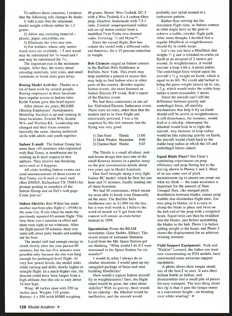 FREE FLIGHT INDOOR jT E i ii ABOUT EIGHT MONTHS AGO chit-chat between Del Ogren Roger Schroeder developed concept Internet-based postal contest A-6 class A-6 class proposed Clarence Mather San Diego Orbiteers club published rules began promoting event first such contest history excellent results including imposing international entry Hats off Del Roger data below taken Internet Complete results available http/n-lemmacom/indoor/ ContestantTime Andrew Tagliafico 640 John Lenderman636 Akihiro Danjo626 Mark Allison623 Lew Gitlow603 Emil Schutzel505 Adj Time see 415 441 400 398 378 334 Hi 47 47 483 47 47 265 Bill Shailor504333266 six highest adjusted times Note time Andrew Tagliafico 640 fudge factor 2/3 sec per foot ceiling height difference 70 feet following have abstracted Roger Schroeders comments also posted Internet http/n lemma com/indoor has pleasure Contest Director first A-6 International E-mail contest made possible generosity Del Ogren maintained web site regularly posted new results international event entries England Australia Finland Argentina Japan US winners participating believe between eight 10 fliers never built Indoor model before lot never built A-6 model participation beginners especially good due mostly efforts Don Park teacher Piper Middle School Kansas City Kansas believe A-6 now established low-cost lowtech fun-type competitive Indoor event can find airplanes cost less admission show still fly indoors times four seven minutes Del hope some large club will adopt A-6 event encourage competition maintain consistent set rules have kindly offered suggestions about rule changes Most concerned tissue covering rule Gampi paper lightest tissue A-6 available two sources US relatively expensive Other comments concerned /32 diameter wire size Akihiro pointed out outside US wood metric sizes 1 15 23 etc 1/16 square 1/32 sheet available sanding size blade mounted weight applies twist prop blade test Torque stand used Leonard father-son team modular torsional strength see text Jim Clem photos disassembles easy packing allows stand-up winding September 1998 127 Simple addition prop pitch gauge allows torsional testing prop bladeslspars works plug-in blades address concerns propose following rule changes made 1 Add rule minimum model weight rubber 13 grams 2 Allow covering material plastic paper microfilm etc 3 Eliminate wire-size rule 4 builders metric wood sizes available 15 mm wood may substituted /16 wood 1 mm may substituted 1/32 important rule minimum weight After worry about covering materials wire sizes small variations wood sizes goes away Boeing Model Activity Thanks lot hard work several people Boeing employees three locations have regular access Indoor sites Keith Varnau gave brief report After almost six years BEAMS Boeing Employees Aerodynamic Modeling Society up running three locations Everett WA Seattle WA Wichita KS Leadership has changed focus remains basically same sharing technical skills adults youth together Indoor E-mail Indoor Group has 145 members registered Bud Tenny rten@nstarnet sending E-mail request address receive late-breaking news such happens clubs holding Indoor events can send announcements events Bud Tenny via E-mail snail mail Box 830545 Richardson TX 75083 prompt posting members Indoor Group Dels web page Come join us Indoor Electric Bob Wilder has made another one-hour-plus flight 1:1908 same Cat II site made previously reported 63-minute flight time sanction effect eight ten witnesses After flight passed 50 minutes some talk about potty breaks sending out food model still enough energy climb slowly after time passed 60 minutes last five minutes possible because site long enough prolonged level flight very low power levels model sinks turning drifts slowly higher straight flight much-higher site descent could have longer high altitude site about 34 feet high Wing 40 inches span 250 sq inches area Weight 110 grams Battery 4 x 550 mAh NiMH weighing 48 grams Motor Wes-Technik DC-S Wes-Technik 8 x 4 carbon-fiber prop Gearbox homemade 751 ratio Control nonproportional rudder on-off motor control modified Twin Turbo two-channel radio Covering 1/2 mil MylarTM Since record flight Bob has redone model different radio batteries 15 percent reduction weight Bob Clemens staged Indoor contest Buffalo Bills fieldhouse Buffalo New York event may help establish pattern access may help us find Indoor sites other parts country Besides regular Indoor events meet featured Indoor Electric FF event Bobs report Electric event three contestants ad hoc Unlimited Electric Endurance event no rules other models Free Flight electrically powered bit surprised low turnout flying very good 1 Dan Hurd Thistle 2 Mark Whalen Mastodon 3 Clarence Hurd Thistle 1100 906 547 Thistle small all-sheet podand-boom design uses small Kenway motors pusher setup pod construction article about two years ago Model Aviation Don Srull brought along very light Indoor RC model flew hour 31 minutes finally landing out sheer boredom 50 contestants meant able break financially meet Buffalo Bills fieldhouse cost us $1000 day well worth believe word-of-mouth well get contest will ensure better turnout 1999 Speculation BEAM newsletter Gene Stubbs Editor recent return astronaut Shannon Lucid Mir Space Station got thinking What would marooned Space Station six months would what always similar situations would open up smuggled package balsa start building MiniSticks would typical Indoor aircraft fly weightlessness Sure flight times would great what about stability no gravity would no sideslipthe dihedral would ineffective aircraft would probably just spiral around corkscrew pattern Rather striving maximum flight time Indoor contest orbit might have goal achieve stable circular flight path After some thought decided regular MiniStick weightlessness should fly stable loops Lets say have MiniStick weighs 1/2 g trimmed cruise Earth airspeed 2 meters per second weightlessness would execute loop 4 meter radius c