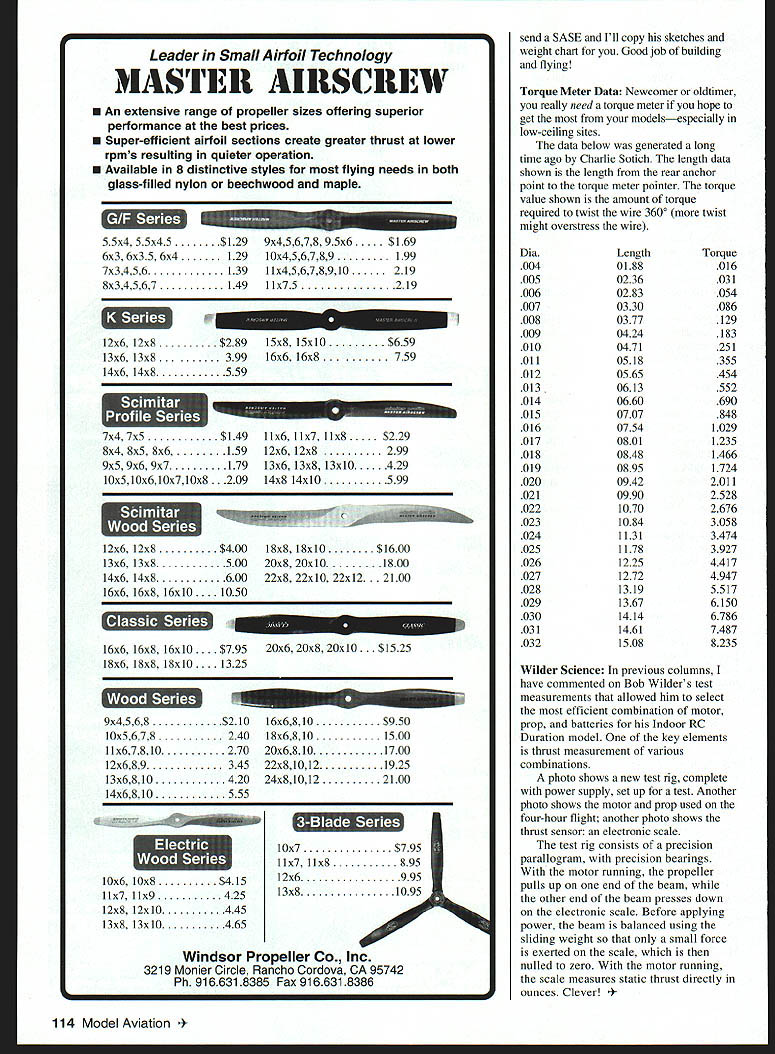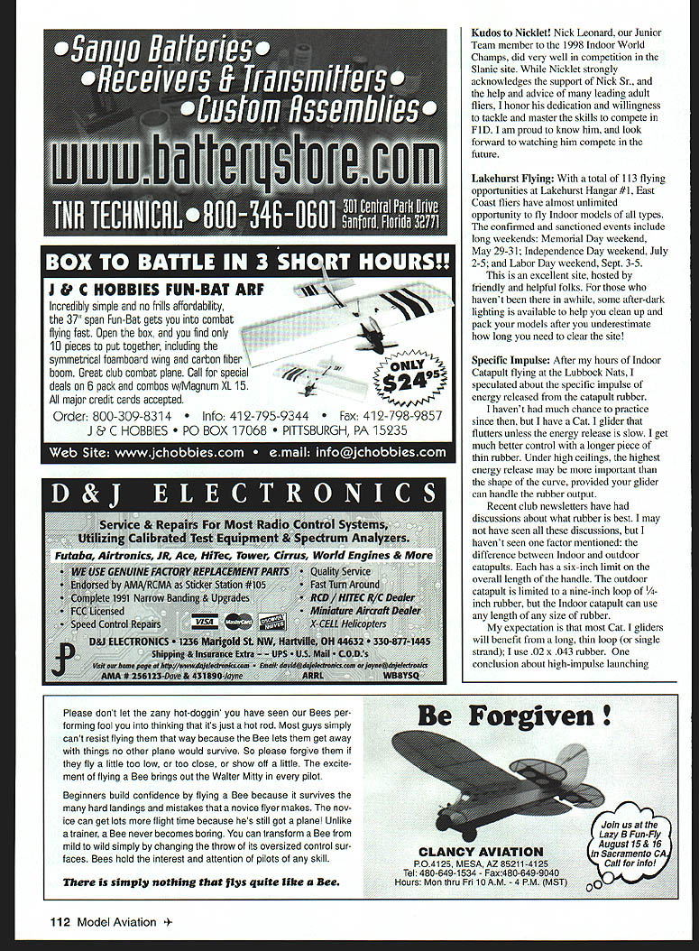 FREE FLIGHT INDOOR RY JENKINS Ontario Canada wrote mildly chastise promoting Radio Controlled Indoor Flying well-taken point RC interests may well overwhelm available Indoor sites exclusion true Indoor flying troubling possibility reporting activity surely would have little impact site problem no doubt Indoor RC ilk compatible other Indoor types However Indoor Electric FF CO2 FF Scale other Indoor Scale models except perhaps Lo-Cal P-24 models equally incompatible what call true Indoor models As fliers duration models covered microfilm plastic Jim Clem pay pro rata share site rental get average 50 minutes flying time return 70 mile round trip real love FID good year pay travel 1000 miles direction gain access site worthy class havent built new FlD years care count As Jim Clem says Sooner later agony exceeds ecstasy Jim lives about six blocks PIano TX YMCA flies part membership several times month course requires advance planning since air-conditioning computercontrolled someplace Oklahoma live closer Richardson TX YMCA building has humidity problem mandates constant operation air handlers Fortunately membership also good Plano YMCA can fly Jim often make time Jim can probably still get access local church gym $50 pop half length small gym realistically take turns flying feel sure cost per minute flight time higher Bedford Euless Ft Worth suburbs sites currently available twice month bottom line seems Indoor fliers can have much exclusive site access can afford Are reasons modeling seek corporate sponsors understanding correct type access enjoyed Indoor fliers Japan Ornithopters Anyone Omithopter Society formerly Omithopters Society Box 376 Arkville NY 12406 circulating Membership Directory Survey information see Web site wwwcatskillnetlevolutionlflight survey can completed line July1999 111 Bob Wilders Indoor RC Electric motor thrust test stand see text set up test Photos Bud Ten fly Multipurpose fixture allows wide variety motors Force measurement used electronic scale see text mounted quickly Power applied motor using test clips measure motor static thrust directly ounces Kudos Nicklet Nick Leonard Junior Team member 1998 Indoor World Champs did very well competition Slanic site Nicklet strongly acknowledges support Nick Sr help advice leading adult fliers honor dedication willingness tackle master skills compete FID lam proud know him look forward watching him compete future Lakehurst Flying total 113 flying opportunities Lakehurst Hangar #1 East Coast fliers have almost unlimited opportunity fly Indoor models types confirmed sanctioned events include long weekends Memorial Day weekend May 29-31 Independence Day weekend July 2-5 Labor Day weekend Sept 3-5 excellent site hosted friendly helpful folks havent awhile some after-dark lighting available help clean up pack models after underestimate long need clear site Specific Impulse After hours Indoor Catapult flying Lubbock Nats speculated about specific impulse energy released catapult rubber havent much chance practice since have Cat glider flutters unless energy release slow get much better control longer piece thin rubber Under high ceilings highest energy release may important shape curve provided glider can handle rubber output Recent club newsletters have discussions about what rubber best may have seen discussions havent seen factor mentioned difference between Indoor outdoor catapults has six-inch limit overall length handle outdoor catapult limited nine-inch loop inch rubber Indoor catapult can use length size rubber expectation Cat gliders will benefit long thin loop single strand use 02 x 043 rubber conclusion about high-impulse launching Please dont let zany hot-doggin have seen Bees per forming fool thinking its just hot rod Most guys simply cant resist flying way because Bee lets get away things no other plane would survive So please forgive fly little too low too close show oft little excite ment flying Bee brings out Walter Mitty pilot Beginners build confidence tlying Bee because survives hard landings mistakes novice flyer makes nov ice can get lots flight time because hes still got plane Unlike trainer Bee never becomes boring can transtorm Bee mild wild simply changing throw its oversized control sur faces Bees hold interest attention pilots ot skill simply nothing Ilys quite like Bee us Lazy B Fun-Fly August 15 & 16 CLANCY AVIATION Sacramento CA P041 25 MESA AZ 85211-41 25 Call info Tel 480-649-1534 Fax480-649-9040 Hours Mon thru Fri 10AM -4 PM MST 112 Model Aviation J r J L# C HOBBIES FUN-BAT ARFx4\ Incredibly simple no frills affordability 37 span Fun-Bat gets combatflying fast Open box find 10 pieces put together including symmetrical foamboard wing carbon fiber boom Great club combat plane Call specialONLY deals 6 pack combos w/Magnum XL 15$24 major credit cards accepted Order 800-309-8314 41 2-795-9344 41 2-798-9857 J & C HOBBIES OX 17068 SBURGH PA 15235 Forgiven gleaned newsletters stretch limit 9x- lOx Tan II makes less suitable rubber has lower stretch limit unless perhaps arms four feet long Turbulator Bob Klipp 53 tall says can stretch rubber hooked glider about 48 inches Covering UHU Stick condensed Win govers Walibangers newsletter Norwich flying Aces Have covered using Tom Hallman UHU method yet covering method uses UHU brand glue stick rubbing alcohol Coat structure UHU stick allow dry dry color turns purple clear still may bit tacky helps position tissue tackiness holds place Apply rubbing alcohol through tissue alcohol softens glue can work out wrinkles Apply alcohol needed Preshrink tissue light structures otherwise shrink tissue after UHU has cured method allowed complete covering jobs record time beautiful results also allowed uncover half wing repair recover record time works great round fuselages because smaller sections can done quickly edges between pieces tissue seem disappear Other advantages include no dope fumes can work almost anywhere Both ingredients inexpensive glue stick should last 