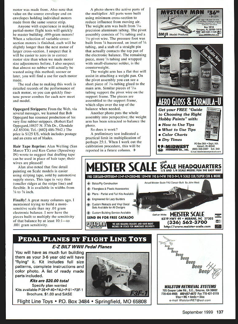 FREE FLIGHT INDOOR NEW FlU RULES Some drastic changes made FiD event rules effective after 2000 Indoor World Championships havent heard minimum model weight increased 12 grams maximum span reduced 55cm rubber limited 5 gram proposal generated Andras Ree prominent Indoor flier Hungary cited concerns over worldwide decline FID participation stating Some us talking about freedom present rules look successful designs nearly within lets say 10% tolerances Andras realized weight span limitations proposal dramatic concentrated rubber limitation have spent lot time work possible changes making test flights half-gram rubber present models fixed prop VP [variable pitch] Although fliers worldwide startled proposal attendees 1998 Indoor WCh opportunity see Andras make half-gram demonstration flights during international Indoor meet following WCh flight record best 26 minutes demonstration flight done Slanic following Model present FlD except prop 500/800 fixed have used two 03 wire spacers 60mm front rubber 145mm behind Rubber Tan 1110/97 batch 170mm original length about 1 47 g/m loop used fourth time Max turns 1170 launch after 110 backoff 40 turns left landing Flight very slow speed nice climbing 30-32m 394 average rpm Reactions US fliers range extreme pessimism immediately beginning build test models Some comments stick prop will have stronger able take fully wound motor will lots good rubber wasted too long too short trying hit 5 gram Broken gumbands will abound trying last turn fail see new rules will spur interest FlD feelings also extreme change needed reduce need extremely high-quality wood other materials make models much easier build fly attract new fliers sport new rules may well unsuccessful what see now new designs will rather extreme easier build present models advantage smallersize models will easier transport models easier build necessarily easier fly will come underweight normal 65cm wood sizesmine required 003 ounce ballast wasnt built lightly Some fliers expressed opinion lighter wing loading would make new models sensitive drift didnt feel right discussed Hermann Andresen BT opinion experience Indoor models wing loading has little effect drift rate model Jim Clem have done extensive flight testing models rubber weighing much less airframe noted poorer response turbulence What think HA have agree models just go along ride air said upset seems function wing loading size EZ6O large-model elegance due averaging turbulence over span length Building Half-Gram Motors can strip uniform cuts weigh selection example 10-foot-long strips making different previous cut 001 inch Compute weight/length strip record number storage envelope Dont mix precut strips between envelopes Compute length particular strip needed make 5 gram allowance knot have reliable max turns chart particular batch rubber record best guess max turns motor envelope motor break particular motor try remember breaking torque record value envelope holding source strip broken 136 Model Aviation itivity multiplier gram scale Parts have minimum cross-section reduce influence moving air Assembled sensitivity multiplier see text Support frame slips Perspective view removable multiplier place electronic over top balance needed Tenny photos balance Weight arm has retracted view motor made Also note value source envelope envelopes holding individual motors made same source strip Anyone experience making partial-motor flight tests will quickly master building 499-gram motors selection variable-crosssection motors finished will slightly longer next motor larger cross-section suspect will easier zero correct motor size made motor size adjustments before also suspect almost no rubber will actually wasted using method sooner later will find use motor made real clue making work detailed records performance motor can quickly finetune power combos new meet model Oppegard Strippers Web via several messages learned Bob Oppegard has resumed production very fine rubber strippers Robert Earl Oppegard10837 N 57th Dr Glendale AZ 85304 Tel [602] 486-7942 price $125 US includes postage extra set blades Hair Tape Reprise Alan Welling San Marco TX Ken Carter Speedway IN wrote suggest drafting tape can used place hair tape wives arc pleased Alan also noted fine detail painting Scale models easier using striping tape sold automotive supply stores tape very thin smaller ridges stripe line flexible available widths /s 3/ inch Finally great columns ago mentioned trying build sensitive scale 01 gram electronic balance now have pieces built multiply sensitivity balance least 10 1to 001 gram sensitivity photo shows active parts multiplier parts built using minimum cross-section reduce influence moving air weight arm built /16 precision aluminum tubing pivot assembly consists 3/33 tubing 1/32 pivot wire pressure foot built /n basswood inset /8 tubing stub straight pin actually contacts top pan electronic balance remaining piece I/u tubing wrapped small-diameter solder counterweight weight arm has flat will assist attaching weight pan pivot assembly can see short piece /16 tubing glued main arm Similar pieces /ts tubing support pivot wire support frame pieces assembled support frame slips over top balance needed Another photo puts whole assembly perspective weight arm has retracted balance photo So does work preliminary test indicated practical limit multiplication perhaps 251 work out calibration procedure will reported future column E-Z BILT WWII Pedal Planes will have much fun building 3-6 year old will have flying Kit includes full size patterns complete instructions color photo list ready made parts included Kits $2000 total Specify plan wanted Kits available-P-38 P-40 F4U 1 Brochure $100 SASE Flight Line Toys ox 3484 ngfield MO 65808 Get FREE Guide Choosing Right Hobby Paints Use Tips What Use Tips Color Charts Dry Times P0 Box 564 MA Hobart IN 46342 BOO 34&3497 Ext 340 PINC E-sat kts idweatprodactacom MUISTUR SCALU SCALE HEADQUARTERS 1/5 AND 1/4 SCALE MOD