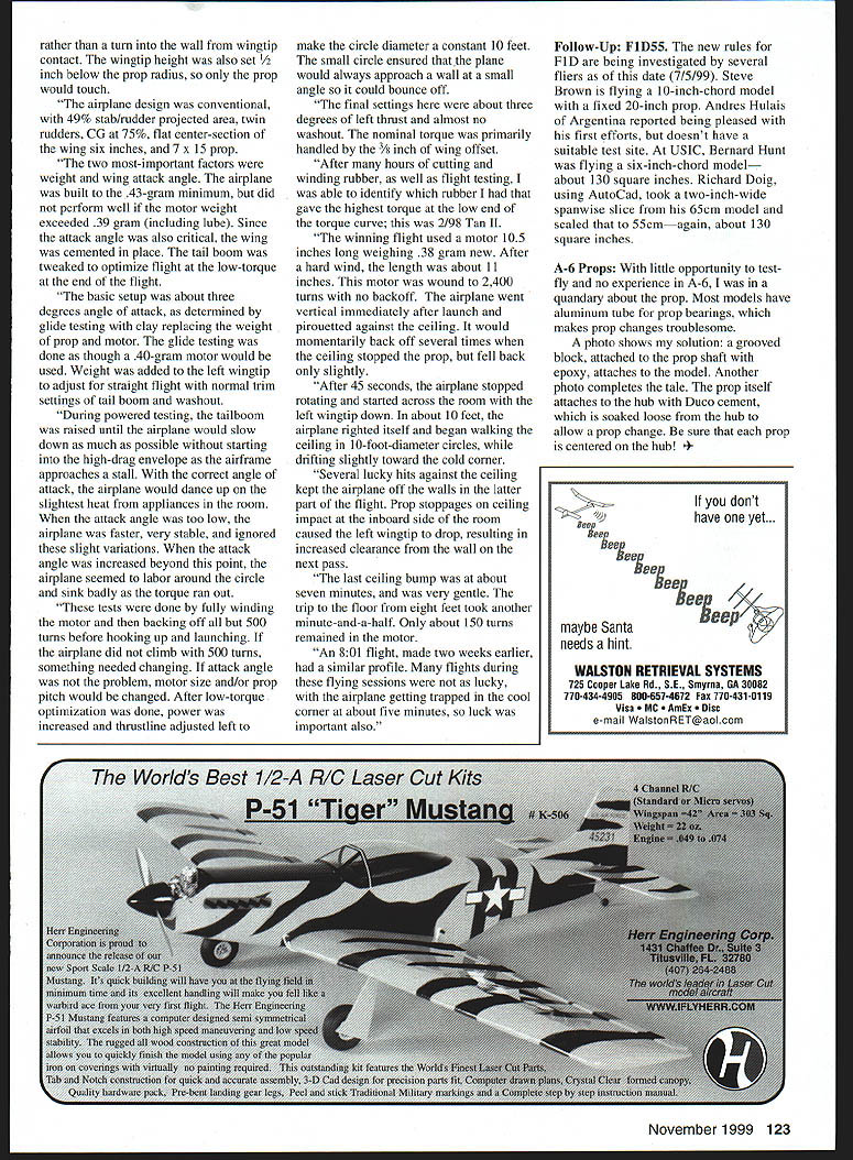 FREE FLIGHT INDOOR OLD BUSINESS previous column presented mystery photo taken Slanic Only Robert Dunham Tulsa Oklahoma correctly identified Erv Rodemsky Health Watch USIC As expected Jim Grant made back looking well always has also good see Jim Buxton flying HLG almost well before accident Before competition Jim expressed some doubt about well would working out consulted physical therapist about specific training As turned out very nearly won HLGonly fraction second behind Bernie Boehm longtime mentor Although Bob Champine hasnt flown Indoor several years returned year Bob long recovery serious stroke able fly several events Welcome back Bob Dick Hardcastle learned early year melanoma back cancer lung dual operation melanoma removed exploratory surgery done lung Dick said doctors cheered lung cancer wasnt melanoma removed lung Dick upbeat USIC flying several events getting stronger day very good prognosis Throw Age Bernie Boehm has obstacle want win Indoor HLG Nats year said needed get least 64 seconds match age started throwing some muscle pain worked through got 653 fourth toss arm back its top form went post top time 711 enough just beat Jim Buxton 4 second Nats win Site Records some speculation 50-minute flight might made years Nats almost happenedtwice John Kagan posted 4848 FID Larry Coslick posted 4848 Indoor Stick Steve Gardiner won Limited Pennyplane 1634 RepriseSpecific Impulse Previous columns have commented specific impulse rubber used Catapult gliders Specific impulse rate energy release coupled total energy release Some fliers have noted Tan II may best rubber use highest-energy rubber available because its very high stretch ratio up 101 has arms long enough Has anyone conducted specific instrumented tests various rubber batches measure specific impulse What constitutes good test specific impulse rubber HLG/Catapult Consistency several years have analyzed performance HLG Catapult fliers Indoor Nats trying better understand dynamics events analysis fliers performance consists dropping two lowest times averaging remaining scores flier has posted fewer five flights analysis gets pretty shaky use three best flights concept simple flier consistency score 98 higher getting model can deliver times dont win new glider needed year consistency lower recent studies year HLG Bernie Boehm 939 Jim Buxton 955 Robert Romash 589 Standard Catapult Ralph Schlarb 905 Bill Schlarb 977 Robert Romash 954 John Marett 898 Tem Johnson 951 Unlimited Catapult Bernie Boehm 988 Ralph Schlarb 973 Bill Schlarb 963 John Marett 884 Tem Johnson 90 MiniStick Postal Winner Walt Collins won 1999 MiniStick Postal event flights 801 829 good enough share details model flight strategies fit eightfoot-ceiling site Walts report details methodical test adjustment scheme can adapted Indoor models flew large meeting room St Joan Arc Catholic Church Yorktown Virginia Brainbusters have used site several years compete MiniStick Postal contest room about 25 feet wide 40 feet long dropped-tile ceiling flush lighting panels Most time during winter drift northwest corner southeast corner southeast corner exterior both walls allow steering site because its relatively large length width compared height approach try keep airplane ceiling long possible small circle avoiding walls much possible wing offset /8 inch combined seven-inch prop usually caused bounce off wall back room 122 Model Aviation other cellulose cement attaches prop hub Removable A-6 prop hub attaches shaft epoxy see text rather turn wall wingtip contact wingtip height also set 1/2 inch below prop radius prop would touch airplane design conventional 49% stab/rudder projected area twin rudders CG 75% flat center-section wing six inches 7 x 15 prop two most-important factors weight wing attack angle airplane built 43-gram minimum did perform well motor weight exceeded 39 gram including lube Since attack angle also critical wing cemented place tail boom tweaked optimize flight low-torque end flight basic setup about three degrees angle attack determined glide testing clay replacing weight prop motor glide testing done though 40-gram motor would used Weight added left wingtip adjust straight flight normal trim settings tail boom washout During powered testing tailboom raised until airplane would slow down much possible starting high-drag envelope airframe approaches stall correct angle attack airplane would dance up slightest heat appliances room attack angle too low airplane faster very stable ignored slight variations attack angle increased beyond point airplane seemed labor around circle sink badly torque ran out tests done fully winding motor backing off 500 turns before booking up launching airplane did climb 500 turns something needed changing attack angle problem motor size and/or prop pitch would changed After low-torque optimization done power increased thrustline adjusted left make circle diameter constant 10 feet small circle ensured plane would always approach wall small angle could bounce off final settings about three degrees left thrust almost no washout nominal torque primarily handled 3/ inch wing offset After hours cutting winding rubber well flight testing able identify rubber gave highest torque low end torque curve 2/98 Tan II winning flight used motor 105 inches long weighing 38 gram new After hard wind length about 11 inches motor wound 2400 turns no backoff airplane went vertical immediately after launch pirnuetted against ceiling would momentarily back off several times ceiling stopped prop fell back slightly After 45 seconds airplane stopped rotating started across room left wingtip down about 10 feet airplane righted itself began walking ceiling 10-foot-diameter circles drifting slightly toward cold corner Several lucky hits against ceiling kept airplane off walls latter part flight Prop stoppages ceiling impact inboard side room caused left wingtip drop resulting increased clearance wall next pass last ceiling bump about seven minutes very 