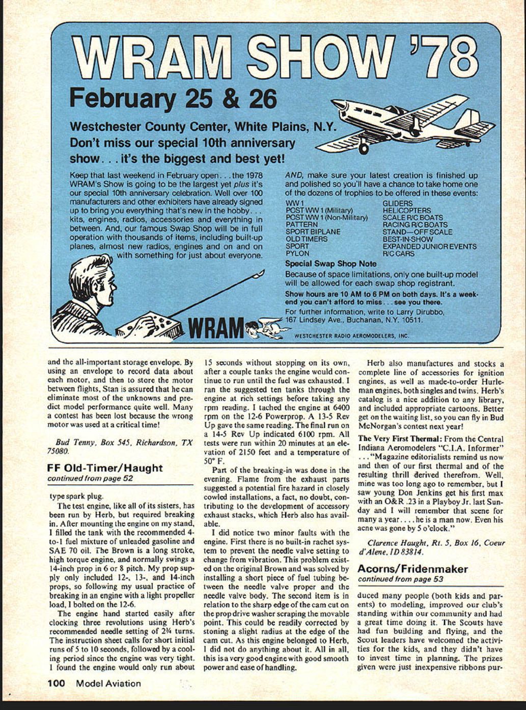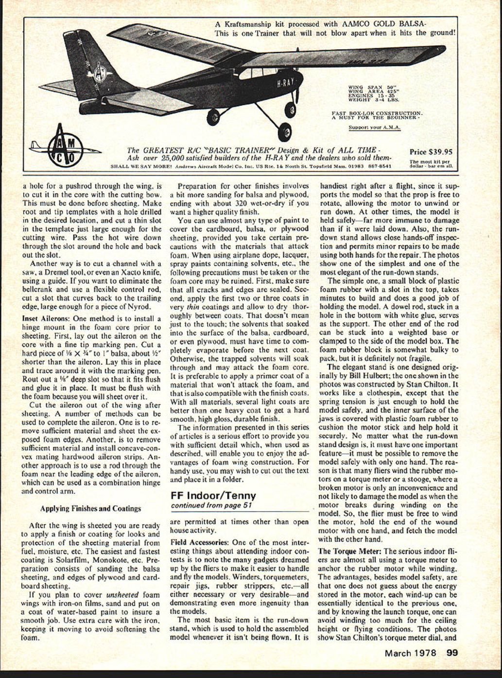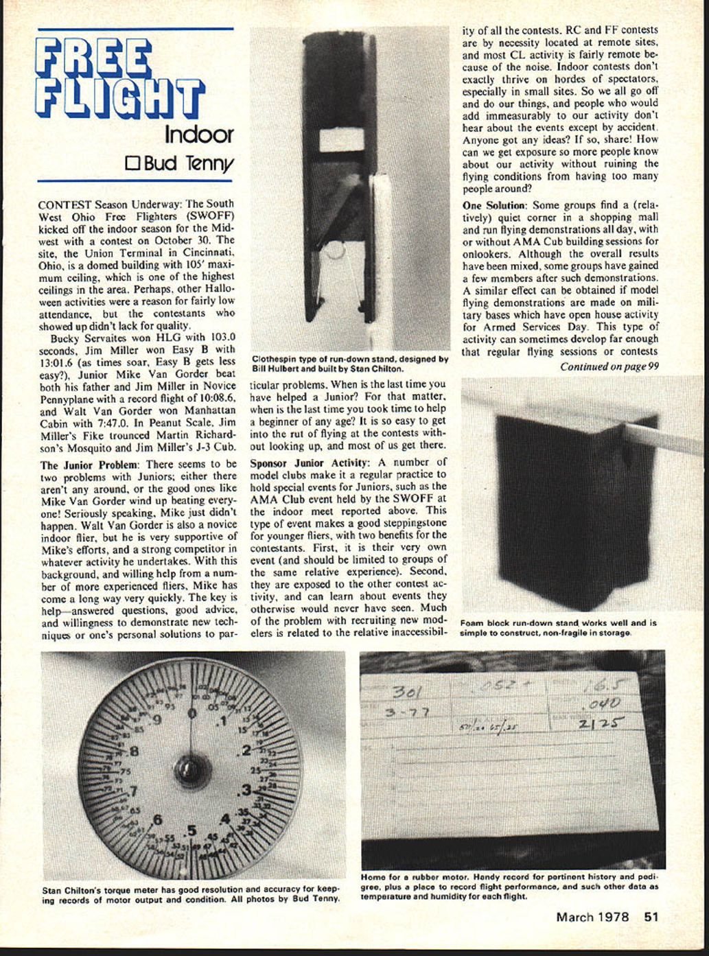 Indoor 0 Bud Tenny CONTEST Season Underway South West Ohio Free Flighters SWOFF kicked off indoor season Mid west contest October 30 site Union Terminal Cincinnati Ohio domed building 105 maxi mum ceiling highest ceilings area Perhaps other Hallo ween activities reason fairly low attendance contestants showed up didnt lack quality Bucky Servaites won HLG 1030 seconds Jim Miller won Easy B 13016 times soar Easy B gets less easy Junior Mike Van Gorder beat both father Jim Miller Novice Pennyplane record flight 10086 Walt Van Gorder won Manhattan Cabin 7470 Peanut Scale Jim Millers Fike trounced Martin Richard sons Mosquito Jim Millers J-3 Cub Junior Problem seems two problems Juniors either arent around good ones like Mike Van Gorder wind up beating Seriously speaking Mike just didnt happen Walt Van Gorder also novice indoor flier very supportive Mikes efforts strong competitor whatever activity undertakes background willing help num ber experienced fliers Mike has come long way very quickly key helpanswered questions good advice willingness demonstrate new tech niques ones personal solutions particular problems last time have helped Junior matter last time took time help beginner age easy get rut flying contests out looking up us get Sponsor Junior Activity number model clubs make regular practice hold special events Juniors such AMA Club event held SWOFF indoor meet reported above type event makes good steppingstone younger fliers two benefits contestants First very own event should limited groups same relative experience Second exposed other contest ac tivity can learn about events otherwise would never have seen Much problem recruiting new mod elers related relative inaccessibil ity contests RC FF contests necessity located remote sites CL activity fairly remote cause noise Indoor contests dont exactly thrive hordes spectators especially small sites So go off things people would add immeasurably activity dont hear about events except accident Anyone got ideas share can get exposure people know about activity ruining flying conditions having too people around Solution Some groups find rela tively quiet corner shopping mall run flying demonstrations day AMA Cub building sessions onlookers Although overall results have mixed some groups have gained few members after such demonstrations similar effect can obtained model flying demonstrations made mili tary bases have open house activity Armed Services Day type activity can sometimes develop far enough regular flying sessions contests March 1978 51 Clothespin type run-down stand designed Bill Hulbert built Stan Chilton Continued page 99 Foam block run-down stand works well simple construct non-fragile storage Stan Chiltons torque meter has good resolution accuracy keep ing records motor output condition photos Bud Tenny Home tor ruDDer motor Hanay recora tor pertinent nisiory ana peal gree plus place record flight performance such other data temperature humidity flight hole pushrod through wing cut core cutting bow must done before sheeting Make root tip templates hole drilled desired location cut thin slot template just large enough cutting wire Pass hot wire down through slot around hole back out slot Another way cut channel saw Dremel tool Xacto knife using guide want eliminate bellcrank use flexible control rod cut slot curves back trailing edge large enough piece Nyrod Inset Ailerons method install hinge mount foam core prior sheeting First lay out aileron core fine tip marking pen Cut hard piece /s X lsa about /2 shorter aileron Lay place trace around marking pen Rout out slot fits flush glue place must flush foam because will sheet over Cut aileron out wing after sheeting number methods can used complete aileron re move sufficient material sheet ex posed foam edges Another remove sufficient material install concave-con vex mating hardwood aileron strips An other approach use rod through foam near leading edge aileron can used combination hinge control arm Applying Finishes Coatings After wing sheeted ready apply finish coating looks protection sheeting material fuel moisture etc easiest fastest coating Solarfilm Monokote etc Pre paration consists sanding balsa sheeting edges plywood card board sheeting plan cover unsheeted foam wings iron-on films sand put coat water-based paint insure smooth job Use extra care iron keeping moving avoid softening foam Preparation other finishes involves bit sanding balsa plywood ending about 320 wet-or-dry want higher quality finish can use almost type paint cover cardboard balsa plywood sheeting provided take certain pre cautions materials attack foam using airplane dope lacquer spray paints containing solvents etc following precautions must taken foam core may ruined First make sure cracks edges sealed Sec ond apply first two three coats very thin coatings allow dry thor oughly between coats doesnt mean just touch solvents soaked surface balsa cardboard plywood must have time com pletely evaporate before next coat Otherwise trapped solvents will soak through may attack foam core preferable apply primer coat material wont attack foam also compatible finish coats materials several light coats better heavy coat get hard smooth high gloss durable finish information presented series articles serious effort provide sufficient detail used described will enable enjoy ad vantages foam wing construction handy use may wish cut out text place folder FF Indoor/Tenny continued page 51 permitted times other open house activity Field Accessories inter esting things about attending indoor con tests note gadgets dreamed up fliers make easier handle fly models Winders torquemeters repair jigs rubber strippers etcall either necessary very desirableand demonstrating ingenuity models basic item run-down stand used hold assembled model whenever isnt being flown handiest right after flight since sup ports model prop free rotate allowing motor unwind run down other times model held safelyfar immune damage laid down Also ru