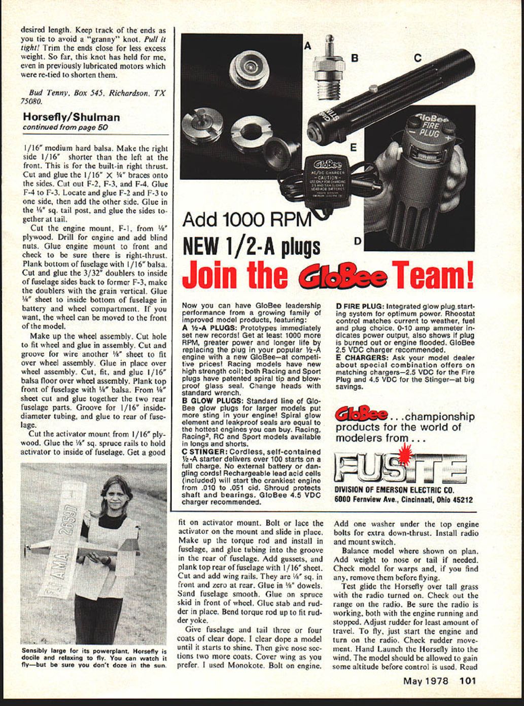 ~Th1 Indoor 0 Bud Tenny FOLLOW-UP A couple columns back Stan Stoys controversial HLG flights very high turbulence reported time issue hit stands number things happened First some HLG fliers protested flights FF Contest Board Chairman Joe Boyle expressed opinion flights illegal spite careful supervision number AMA officials Ultimately matter referred Contest Board vote upheld record early December 1977 Stans new slightly lar ger Coot set two-flight total 79 4/5 seconds exceed same record controversial flights beat new mark set dead calm air St Louis Mo site high temperature day 500F Outside weather cloudy 300 F Later January 1978 Stan requested turbulent air record withdrawn reasons quoted Stans letter Frank Ehling Technical Director AMA 1 feel its continued presence will serve irritate some competitive fliers will provide constructive goal competitors better Isnt real purpose keeping records 2 Modelers have decided tactic turbulence rectification option want available indoor flier least purpose estab lishing records 3 has served its purpose bringing up discussion rather vague rules indoor competition record establish ment Its continued presence books will further goal first glance Stans record withdrawal would seem negate went before However consider perceived weakness existing rules no amount rhetoric would have exposed half well Until demonstrated effect proper use misuse loophole rules no would have paid ser ious attention Stan congratulated effective use rules AMA machinery rules verification review stature much greater after highly sportsmanlike withdrawal record New Technology application styrofoam model airplane structures new particularly control-line stunt models RC models has un heard indoor HLG models either L Vaughn pioneers styrofoam HLG model dominating competition Oklahoma City OkIa contests model Bikini shown two photos appears follow fairly normal design layout Aside al all-foam construction two notable design features two-piece fuselage high aspect ratio rudder Al has information-packed plan model notes unusual rudder con figuration helps launch transition effective glidekeeps circle large better time Presumably twopiece fuselage saves weight fingerhole wing bellybutton used inContinued page 100 May1978 49 Bikini indoor HIG 1 vaughn has styrofoam flying surfaces balsa fuselage Meat trays good source supply pix Bud Tenny Note two-piece tuselage high aspect ratio rudaer vaugnn 5 HIG Theres method madnesssee text model long series development effort HLG gliders much news lately Styrofoam Pennyplane propeller blades made free-fighter Jim Clem Dallas Jim Note use molded stiffener prop ribs tie reliable knot indoor rubber motors See text details Getting ordinary knot hold lubricated rubber murder idea expressed preamble also great insight creation special event people just have design own Basically event original de signs built 1941 AMA rules means fuselage must have minimum cross sectional area equal fuselage length times 2 divided 100 have wing loading 8 oz/sq ft power load ing 80 oz/cu engine displace ment Some contest directors will let Old Rulers fly regular categories others allow Old Rulers fly special events rate event does allow creative urge prevail Most us couldnt build models construction list live 100 years old own Odds Ends After reading idea joining booster batteries plastic six-pack beverage binders Don Jenkins Indianapolis sent actual example solution problem Don solders two pork bean cans soup can gether triangle fashion soldered wire carrying handle Just drop booster pork bean can fuel spare prop etc soup can head launch area Clarence Haught Rt 5 Box 16 Coeur dAlene ID 83814 FF Indoor/Tenny continued page 49 stead traditional reinforced trailing edge apply launching force ahead models center gravity source styrofoam wings tail surfaces styrofoam meat trays Al cites high price good balsa get ting him started foam can afford meat days flying sur faces shaped razor plane garnet paper surfaces balsa cluded coated mixture 50% water 50% white glue After paint has dried surfaces pol ished #600 wet dry paper Wing reinforcement two formsTissue hat shoe boxes applied tri angular pieces triangles base along leading edge area im mediately ahead bellybutton re inforced typing paper applied wet white glue about props Jim Clem Dallas Oklahoma Clem fired up Al Vaughns success styrofoam has replica Cezar Banks Nats winning Novice Pennyplane prop under construction see photo blades began cutting meat-tray foam white trays seem have density about 2 pounds per cu ft proper blade shape formed blades over metal can just countless Easy B Pennyplane blades have Now serendipity reared its head As can seen photos ribs can transferred blades blades warmed few minutes warm oven implication seems blade could formed regular prop block spar ribs carved surface resulting blades can much thinner lighter blades made good balsa yet molded-in spar ribs would materially stiffen strengthen Plumb Crazy Styled after full-size Formula planes 049-powered 17%-in span Plumb Crazy first series De signed Russ Sandusky Jerry Kramer can compete AMA Mouse Racer Class Bal sa parts machine die cut Kit includes bellcrank lead-out wire wheels formed alu minum landing gear etc Midwest Products Co 400 S Indiana Ave Hobart IN 46342 product review product review product review blades seems worth tryif does share results major area application may Pennyplane props always too small seems handle large amounts rubber needed top times blade area weight penalty may payoff Rubber Knots Perhaps often asked question about indoor model tech niques get knot hold rubber Although seems Ive al ways used memory seems tell Charlie Sotich Chicago Aero nuts shared knot years ago photo shows elements really good knot except parts havent pulled tight Both knot structure method importanteach segment knot should lubricated saliva before pulling tight Tying rubber dry will cause surface rubber scuff up cause weak spot saliva seems idea