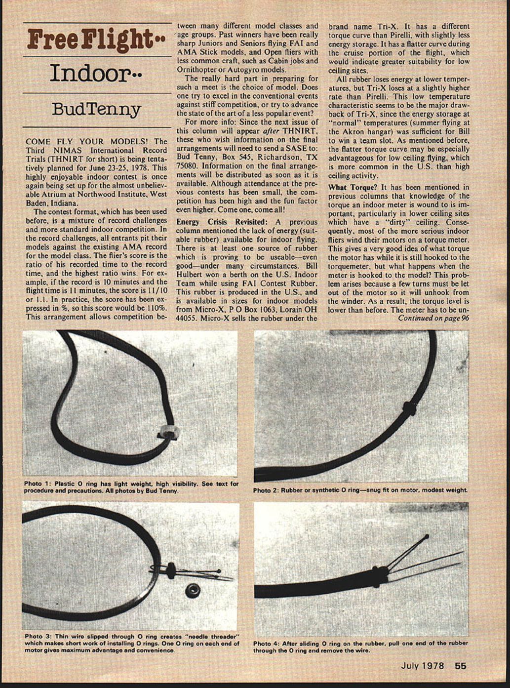 it m ncrs rnon ed Lck source beuse 1114 Co F indoi 1063 rubber forcettoicly shey should hoow products ore worth because little historic researching fot Sowetiwes other plors ore prettier hut bosic ourheoticity detoiliog oed prototype inforwetioc glue rho t coonts whse its eufhertis wodeliog youre ofter Theres o world costly diPerenee wheo hcy CDs ecee otseoerol tiwen rho price hot os serious wodelerseod eciosion persoocol soy Nore hut CDs gioe yoc oppeoroncethe feel oldtiwers sowehew hoild thew FOR YOUR HOBBY AT R R M N M SENO St OR CATALOG SE 2 YRS SUBS St ADO tOe 1100 PLANS _________________________________ AVAILABLE 1931 Gee Bee Super Sportster 1 eeSle General Arrange ment Drawing Catalog 25c W T Bill Given MODERNISTIC MODELS PO BOX 6974 ALBUG NM 87197 adjusting engines barely ac complish required ROG maintain shallow cruising climb Engine runs over ten minutes common often attain good altitude thermal exten sion flight As can imagine large site minimal drift required event qualify event model de sign must 1938 earlier Wing span must six feet greater orig nal ignition engines allowed clas sic old birds cruising slowly overhead make excellent targets camera buff takeoff runs long slow few feet altitude gained per circle can manage several good shots Clarence Haught Rt 5 Box 16 Coeur dAlene ID 83614 FF Indoor/Tenny continued page 55 hooked twiceonce winder rubber can hooked prop shaft once unhook torquemeter easy enough hook meter prop re-check torque much lost moving motor torquemeter models rear hook Use 0 Ring purist stand point 0 ring rubber synthetic circle rubbera doughnut shape used gasket between metal fittings pressure vacuum systems indoor models 0 ring something slipped meter allows mo tor unhooked removing turns past 0 rings have made small diameter music wire bent circle hooked itself re cently either plastic rings real 0 ringsvery tiny ones-have used Photo shows plastic 0 ring motor Photo 2 shows rubber 0 ring same size motor Note rubber 0 ring fits very closely motor can advantage Because 0 ring fits snugly helps hold motor rear hook motor unwinds completely plastic 0 rings made slicing off end piece Nyrod particular brand pushrod radio con trol models After rings cut sharp edges removed boiling water 0 rings very light flier should experimentally test strength 0 rings winding motors destruction model rubber 0 rings available Ron Plotzke Aorolite 36659 Ledgestone Mt Clem ens Ml 48043 Ray Harlan 15 Happy Hollow Rd. Wayland MA 01778 As mentioned before rubber 0 rings fit rather snugly rubber motor enough difficult get 0 ring slide rubber answer shown Photos 3 4 small diameter wire insect mounting pin shown bent double pushed through 0 ring 0 ring pushed over rubber end rubber pulled through Whether use extra 0 ring question since no doubt mind about using least After experience using 0 rings difficult accept inconvenience uncertainty involved having least 0 ring factors weighing decision model size ceiling height weight 0 ring some cases factors like fail ing eyesight poor lighting contest site enter picture simply easier see hook up 0 ring particularly plastic ones weight 0 ring typically less 0005 oz certainly minor factor FAI Stick model must weigh 0354 oz espe cially since precise control models trajectory possible other factors unchanged altitude model attains directly proportional launch torque too small model such ROG 0 ring higher proportion models fly ing weight loss few turns tiny rubber has almost negligible effect launch torque heavier indoor model power proportionally needs given model size leads problems bunching rubber knots rubbing fuselage usually effects detrimental long flights Pennyplane models com pound problem having high required weight requiring very short fuselages Although rubber model ap proaches its maximum duration rub ber weight approaches 1 s air plane weight short Pennyplane fuse lage poses such rubber handling problems few fliers manage use 80% much rubber weight airplane weight Thus rubber handling problems can solved Pennyplane times bound go up 0 rings tend help pre vent rubber bunching prep no has reported 0 ring really strong enough rubber weight already short improvement helps should o rings Pennyplane Bud Tennv Box 545 Richardson TX 75080 FF Duration/Meuser continued page 53 used several models An added feature fuse easy light check compared uusual tail mount use aluminum tubing curved parts line path plastic tubing could used Metal tubing will easily kink bent sharply use end finger thumb form bend slowly carefully radius inch less can achieved method 3/32 aluminum tubing Metal tubes should flared out bit end line will cut Twenty-pound test Da cron line works well line Other sizes types can used front tube must placed far enough rearward stab will pop up desired angle Check before mounting front hook will catch tube act limiter bend hooks out pins plenty strong enough gas model piece 1/32 ply glued around stab hole adds needed strength point rear wire will slide through hole stab placed parallel string sketch shows typical set-up large model tail-mounted fuse beyond convenient reach flier makes launching two man job small light models CG shift due burn ing fuse can change glide pattern sig nificantly aside fire hazard tail-mounted fuse makes little sense Clarences idea mounting fuse top seems like winner However internal dethermalizer strings plastic tubing running clear inlet outlet often preferred over alu minum tubing original string gets pulled out can easily replaced Twenty-pound woven Dacron Nylon line can pushed through end bends gentle monofilament line can pushed through series se vere bends extremely lightweight models weight plastic tubing might factor external DT string seems like best bet Plastic tubing selected purpose well proved can obtained NFFS Supplies 9525 Achates Cl Sacra mento CA 95826 send SASE complete price list Top following incident will undoubtedly nominated Best Grandstand Act 1978 took place recent Max-M