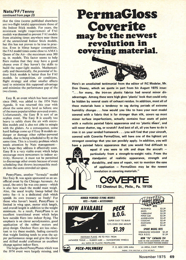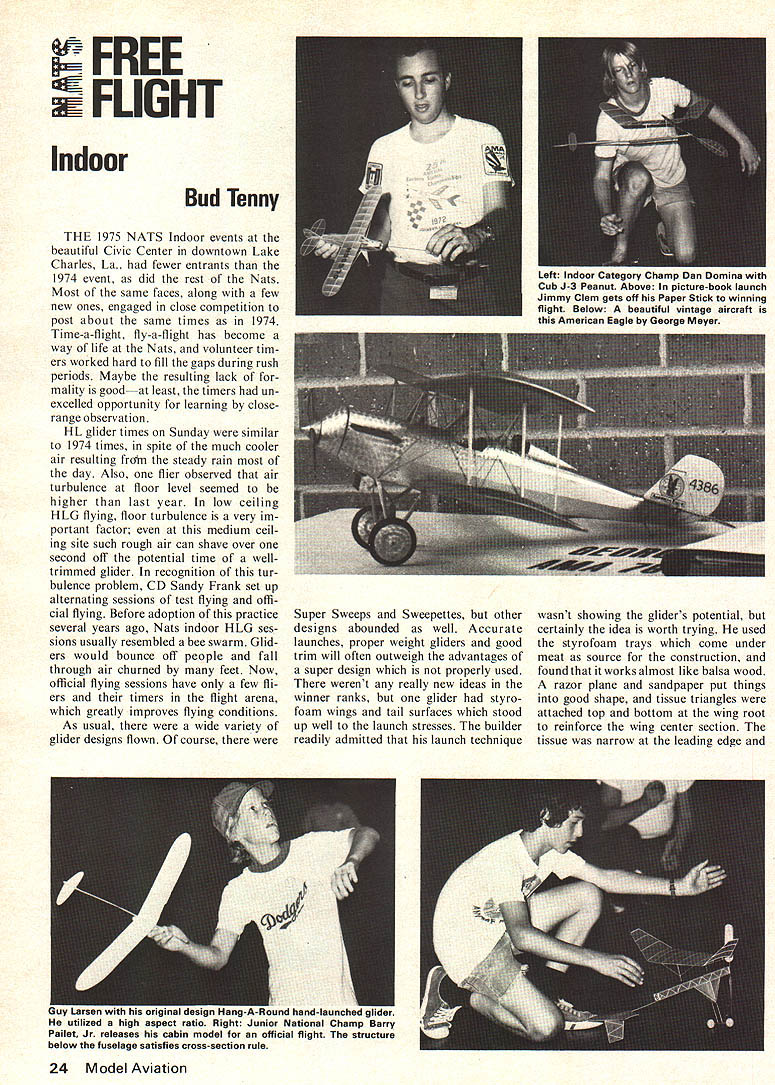 I FREE HT Indoor Bud Tenny THE 1975 NATS Indoor events beautiful Civic Center downtown Lake Charles La fewer entrants 1974 event did rest Nats Most same faces along few new ones engaged close competition post about same times 1974 Time-a-flight fly-a-flight has become way life Nats volunteer tim ers worked hard fill gaps during rush periods Maybe resulting lack mality goodat least timers un excelled opportunity learning closerange observation HL glider times Sunday similar 1974 times spite much cooler air resulting froin steady rain day Also flier observed air turbulence floor level seemed higher last year low ceiling HLG flying floor turbulence very im portant factor medium ceil ing site such rough air can shave over second off potential time welltrimmed glider recognition tur bulence problem CD Sandy Frank set up alternating sessions test flying offi cial flying Before adoption practice several years ago Nats indoor HLG ses sions usually resembled bee swarm Glid ers would bounce off people fall through air churned feet Now official flying sessions have few fli ers timers flight arena greatly improves flying conditions As usual wide variety glider designs flown course Super Sweeps Sweepettes other designs abounded well Accurate launches proper weight gliders good trim will often outweigh advantages super design properly used werent really new ideas winner ranks glider styro foam wings tail surfaces stood up well launch stresses builder readily admitted launch technique wasnt showing gliders potential certainly idea worth trying used styrofoam trays come under meat source construction found works almost like balsa wood razor plane sandpaper put things good shape tissue triangles attached top bottom wing root reinforce wing center section tissue narrow leading edge 24 Model Aviation Left iuuuur aiegury nemp uan uunine wiin Cub J-3 Peanut Above picture-book launch Jimmy Clem gets off Paper Stick winning flight Below beautiful vintage aircraft American Eagle George Meyer uy LC3UI vymiri ru urna uuIgru narg-n-nuund hand-launcheu gi utilized high aspect ratio Right Junior National Champ Barry et Jr releases cabin model official flight structure below fuselage satisfies cross-section rule perhaps three inches wide trailing edge Water-thinned white glue used attach tissue no type polish used smooth surface beyond finish attainable very fine sandpaper Indoor Scale entrants usual op portunity fly AMA Scale plus two other unofficial events Navy Scale Peanut Scale last two events sponsored Miami Indoor Aircraft Model Assoc complete unique wall plaques large framed pictures Navy aircraft offered prizes MIAMA based Miami Fla course Peanut event drew 33 entries Indoor Scale first added Nats some years ago Peanut Scale has offered unofficial event different sponsoring groups Scale excellence AMA Scale mod els encouraged rules flight points cannot exceed scale points minimum 5-second flight must achieved order model qualify scale points awarded Peanut Scale models limited 13 span scale points limited 15 encourages models capable long flights poor replicas can awarded negative scale points effectively reduce flight points en courage some greater adherence scale appearance Navy Scale event held models either Peanut AMA Scale events models must rep licas aircraft served Navy nation Navy Scale Results MikeArlingtonSE-SA Fedor Tex 2RolfePotomacStinson Gregory Md SR-S 3JohnMiamiMartin Martin Fla MO-I Peanut Scale Results 1 JohnMiamiLacey M-lO Martin 2 ButchGreatLacey M-lO Hadland ain 3 ButchGreatWittman Hadland* ain Tailwind 4 ButchGreat1911 Hadland* ain Cessna 5 GeorgeCorpus Christi Lacey M-lO Meyer Texas * Unlimited entry permitted best ef fort counts Best looking plane Hadlands 1911 Cessna purist microfilm fliers real test indoor site much time models will whether models will hang up land bleachers Due cold air Monday rained again best times microfilm models fell about two minutes short 1974 times massive scoreboard its large open top caught models last year lowered once hour permit re trieval models year Civic Center personnel went extra mile hospitality shrouded jaws doom plastic small gap remained trapped unlucky model Also strip masking tape worked loose just enough catch occasional model otherwise hangups almost nonex istent course building has its own pecularities best times fly predicated outside weather condi tions Sports Arena Civic Center surrounded rest Center except north side has occasional persistent drift Large changes outside weather such sunshine rain will trigger drift takes hours settle out Quite often winners have recognized building peculiarities made flights ap propriate times way knowledge able fliers avoid drift minimize its effect models land floor instead bleachers Quite often such flight strategy will gain flier repu tation unbeatable certainly 1975 Nats winners listed elsewhere have such experience Declining entry Indoor Cabin event has caused concern several years resulted some unclaimed trophies year event flown all-age combined event championship points awarded Juniors Seniors according totheirrankingwithintheir own age group Two groups mainly entered Juniors Seniors seeking championship points few dedicated indoor fliers trying win prestigious Stout Perpetual trophy FAI Indoor Stick first flown 1974 Nats year also agecombined event interesting note continued page 69 November1975 25 John McCully adjusts condenser-paper coy- Wide-chord Pennyplane Richard Doig ered Easy B entry took second place covered Microlitethin light plastic Releasing Stinson SR-5 AMA Indoor Scale entry Rolfe Gregory also sported impressive flying Cessna C-37 Aeronca K August 1975 issue Mode/Aviation Nats/FF/Tenny continued page 25 time scores published elsewhere two-flight totals approximate Indoor Stick models years minimum weight requirement FAI models deemed prevent FAI models attaining times anywhere near unrestricted Indoor Stick models has proven true prac tice blimp hangar competition FAL model ti