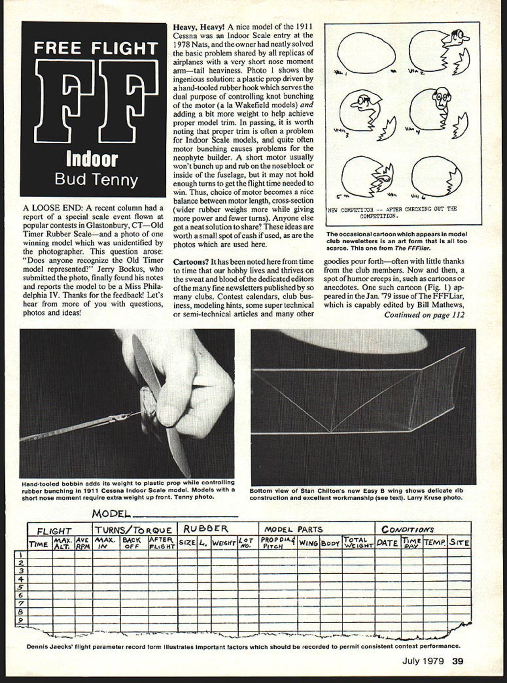 A LOOSE END recent column report special scale event flown popular contests Glastonbury CTOld Timer Rubber Scaleand photo winning model unidentified photographer question arose Does anyone recognize Old Timer model represented Jerry Bockus submitted photo finally found notes reports model Miss Phila delphia IV Thanks feedback Lets hear questions photos ideas Heavy Heavy nice model 1911 Cessna Indoor Scale entry 1978 Nats owner neatly solved basic problem shared replicas airplanes very short nose moment armtail heaviness Photo 1 shows ingenious solution plastic prop driven hand-tooled rubber hook serves dual purpose controlling knot bunching motor Ia Wakefield models adding bit weight help achieve proper model trim passing worth noting proper trim often problem Indoor Scale models quite often motor bunching causes problems neophyte builder short motor usually wont bunch up rub noseblock inside fuselage may hold enough turns get flight time needed win Thus choice motor becomes nice balance between motor length cross-section wider rubber weighs giving power fewer turns Anyone else got neat solution share ideas worth small spot cash used photos used Cartoons has noted time time hobby lives thrives sweat blood dedicated editors fine newsletters published clubs Contest calendars club bus iness modeling hints some super technical semi-technical articles other occasional cartoon appears model club newsletters art form too scarce FFFIiar goodies pour forthoften little thanks club members Now spot humor creeps such cartoons anecdotes such cartoon Fig 1 ap peared Jan 79 issue FFFLiar capably edited Bill Mathews Continued page 112 MODEL z 3 4 5 6 7 ___ FLIGHTTURNS/TORQUE RU BBERMODEL PARTSCoMroAs MAX AVE MAK BACK AFTER or PROP PiA AL TE F~ TEMP SrrE ALTPM INOFF FLiGHT#0PITCH Dennis Jaecks flight parameter record form illustrates important factors should recorded permit consistent contest performance July1979 39 U NEW COMPETITOR -- AFTER CHECKING OUT TIlE COMPETITION llana-TooieU ogrnn egos mis weru u ber bunching 1911 Cessna Indoor Scale model Models short nose moment require extra weight up front Tenny photo ouom view bran niirons new Lasy u wing snows aeiicare riD construction excellent workmanship see text Larry Kruse photo Quiet Power -Tatone Makes Easy new super quiet K&B 40 R/C muffler requires no exhaust plugs fittings adaptors Muffler machined fit exhaust stack cover exposed holes Just bolt on.thats Will reduce noise 10 12 decibels little no loss rpms Noise cancelled interposing sound waves eRadi cal free flow expansion chamber angled blow exhaust away fuselage attach provision pressure fitting Also available ENVA 29 35 40 45 OS MAX 30 35 40 SUPER TIGRE G21 35 46 Add $100 extra above engines specify type pie four different weights placed long board would push down different amount different place total forces downward could considered single force pushing down whatever point along board would necessary give ex actly same effect four differ ent weights resultant point called Center Gravity Therefore change weight location board will shift bal ance point original CU loca tion model nose-heavy balance point further forward rela tion designed Center Gravity Note 2 Baughmans Aviation Diction ary defines Decalage difference angles incidence wings bi plane multiplane measured acute angle between chords plane parallel plane symmetry Rightly wrongly modelers cluding author have expanded term include monoplanes refer ring difference angles inci dence wing stabilizer FF Indoor/Tenny continued page 39 311 Poinciana Dr Birmingham AL 35209 newsletter fairly new very regular usually very informative Bills labor love benefits Alabama FFFlyers group club usual sense Wood Cutting May 79 column carried comments balsa cutting some hints achieving accuracy strength seldom appreciated just what wonders achieved some better craftsmen build Indoor models Stan Chilton Wichita KS craftsmen recent Easy B models have turning times high 16 minutes Cat II sites ceiling heights between 35 100 Photo 2 shows some amazing balsa work Easy Bsand explains model well under 04-oz weight picture shows underside wing visibly tiny rib cross-sections Note main rib uses second balsa piece across bottom help hold curva ture diagonal rib pattern used stiffen wing ribs less 02 maximum dimension appear formidible cutting task Its Easyalmost Actually takes produce such part very sharp knife steady practiced hand very carefully selected wood Wood selection itself topic worthy several columns major ingredient separating top builders competition part must just strong enough carry its share load no excess balloon weight Much time spent choosing just right piece wood part needed actually build part Maxim Indoor models arent hard build just different paragraph above illustrates very well No other type model has applications different techniques Indoor models yet few basic techniques beyond skill model builders two other problems rear ugly headsa precon ceived notion what capable doingI could neverdothat becomes classic self-fulfilling prophesy lack information about some tasks accomplished experienced builder Hopefully what column about sharing various techniques aren t obvious thus encouraging interested persons try hand part model building inexpensive still challenging enough almost anyone Attention Details has noted occasionally small details make break Indoor modelers efforts Nowhere true model trim contest flying tiny shift location models CG center-of gravity wing incidence will rob seconds minutes models performance Changes humidity atmospheric pressure air temperature play part No except computer can remember details enough clarity duplicate previous successful flights make good guess about set up model fly contest inadequate time available make exhaustive test flights Dennis Jaecks really top Pennyplane fliers yet business prevents him doing much testing would comfortable keep track remember Dennis has won Pennyplane once Nats often has
