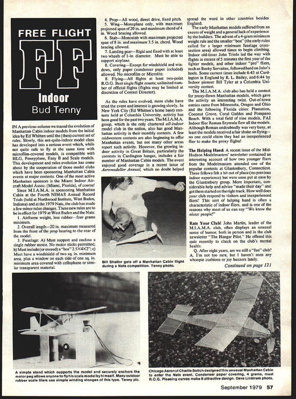 IN previous column traced evolution Manhattan Cabin indoor models initial idea Ed Whitten until current set rules Slowly not-quite-indoor model class has developed serious event quite safe fly same time microfilm-covered models compatible HLG Pennyplane Easy B Scale models development rules evolution has come about cooperation model clubs have sponsoring Manhattan Cabin events major contests active Manhattan sponsors Miami Indoor Air craft Model Assoc Miami Florida course Since MIAMA sponsoring Manhattan Cabin Fourth NIMAS Annual Record Trials held Northwood Institute West Baden Indiana 1979 Nats club has made few minor rules changes new rules effect 1979 West Baden Nats 1 Airframe weight less rubberfour grams minimum 2 Overall length20 maximum measured front prop bearing rear model 3 Fuselage Must support enclose single rubber motor No motor sticks permitted b Must include exceed abox 25X4X2 c Must have windshield two sq minimum area plus window side sq minimum area covered cellophane simi lar transparent material 4 PropAll wood direct drive fixed pitch 5 WingMonoplane maximum projected span 20 maximum chord 4 Wood bracing allowed 6 StabMonostab maximum projected span 8 maximum 35 chord Wood bracing allowed 7 Landing gearRigid fixed least two wheels 1-in diameter Must able support airplane 8 CoveringExcept windshield win dows paper condenser paper included allowed No microfilm Microlite 8 FlyingAll flights least two-point ROG Best single flight counts unlimited num ber official flights flights may limited discretion Contest Director As rules have evolved clubs have tried event interest growing slowly New York City Ed Whittens home base con tests held Columbia University activity has good past two years MLAMA group chartered all-indoor model club nation also has good Man hattan activity monthly contests few midwestern contests also beginning offer Manhattan events other areas report such activity However growing door activity Great Britain particularly contests Cardington hangar includes fair number Manhattan Cabin models event enjoyed good coverage recent issue Aeromodeller Annual no doubt helped spread word other countries besides England early Manhattan models suffered excess weight general lack experience builders advent ofa4-gram minimum weight rule smallerbox early rules called larger minimum fuselage crosssection area allowed times begin climbing Indoor old-timer John Triolo led way flights excess 5 minutes first year lighter models other indoor pro fliers such Bucky Servaites followed hard Johns heels Some current times include 643 Card ington England R L Bailey 644 Indoor pioneer Bill Tyler Columbia Uni versity contest MIAMA club also has held contest proxy-flown Manhattan models gave activity interesting twist Out-of-town entries came Minnesota Oregon Ohio following Florida cities Plantation Coconut Grove Coral Gables Pompano Beach total field nine models FAL Indoor flier Roman Szymula flew models Although Roman undoubtedly very busy least models received fair shake flying no could claim inexperienced flier make proxy flights Helping Hand recent issue MidHudson Modelmasters newsletter contained interesting account two younger fliers Modeimasters attended popular contests Glastonbury Connecticut fellows felt bit out place no previous indoor experience soon put ease Glastonbury group important con siderable help advice made day got started right track well does club respond visitors inexperienced fliers sort helping hand often characteristic indoor fliers reasons us can say know nicest people Rate Club John Martin leader MIAMA club often displays unusual sense humor both person club newsletter Hangar Pilot offered quiz recently check clubs mental health Q After eight years still fun club Im too sure havent seen whoopie cushions joy buzzers lately Continued page 121 simple stand supports model securely anchors motor peg allows anyone fly scale model himself Manyoutdoor rubber scale fliers use simple winding stooges type Tenny pic InIcago Aeronut Charlie Sotich designed unusual Manhattan Cabin enter Nats event Condenser paper covering 4 grams must ROG Pleasing curves make attractive design Dave Linstrum photo September 1979 57 Bill Shailor gets oft Manhattan Cabin flight during Nets competition Tenny photo proofer choice 1978 Indoor Record Recap takes awhile get data AMA sort out confirm some data seems questionable find hole column put So half-past 1978 Im just getting around reporting 1978 records Any goes indoor modeling far greatest activity took place Pennyplane Novice Pennyplane particularly latter since records set back zero first year Record setters include Ichiro Sugioka Bucky Jocy Servaites Kris Warmann Cezar Banks Richard Whitten Bob Marnie Meuser bulk records though went Walter VanGorder son Michael flying Banks design Meuser No Non-Cents respectively set records both Open Junior three ceiling-height categories biggie however went Manny Radoff set Category III Open Pennyplane record 1630 Lakehurst using version John Kukons biplane pair long-standing records yielded hand Master Jim Richmond Third NIMAS Indoor Record Trials West Baden Category II posted score 36 mm 214 sec Hand-Launch Stick 17 mm 342 sec Baby ROG event officially referred ROG Stick using un-traditionaJ high-aspect-ratio machine latter Dave Lindley set Cat II Junior record ROG Stick 9 mm 126 sec considerable activity weirdo events autogiro helicopter ornithopter Richard Obarski old Chicago Aeronut posted 8 mm 476 sec Open Cat II Copter record Dave Lindley established Junior Giro records three ceiling-height cate gories best being 3 mm 536 sec Cat II Several Ornithopter records set particularly significant compared scores set thirties forties contention because possible rules violations Paper Stick originally supposed simpler easier alternative microfilmcovered models often happens turned difficult Indoor events second perhaps Easy B Richard Obarski upped Category III Open record event unimaginable 27 mm 48