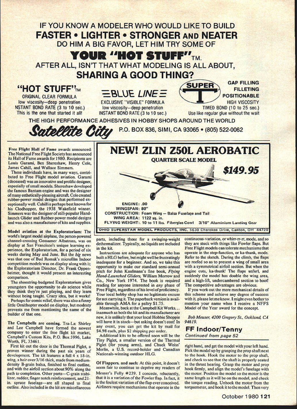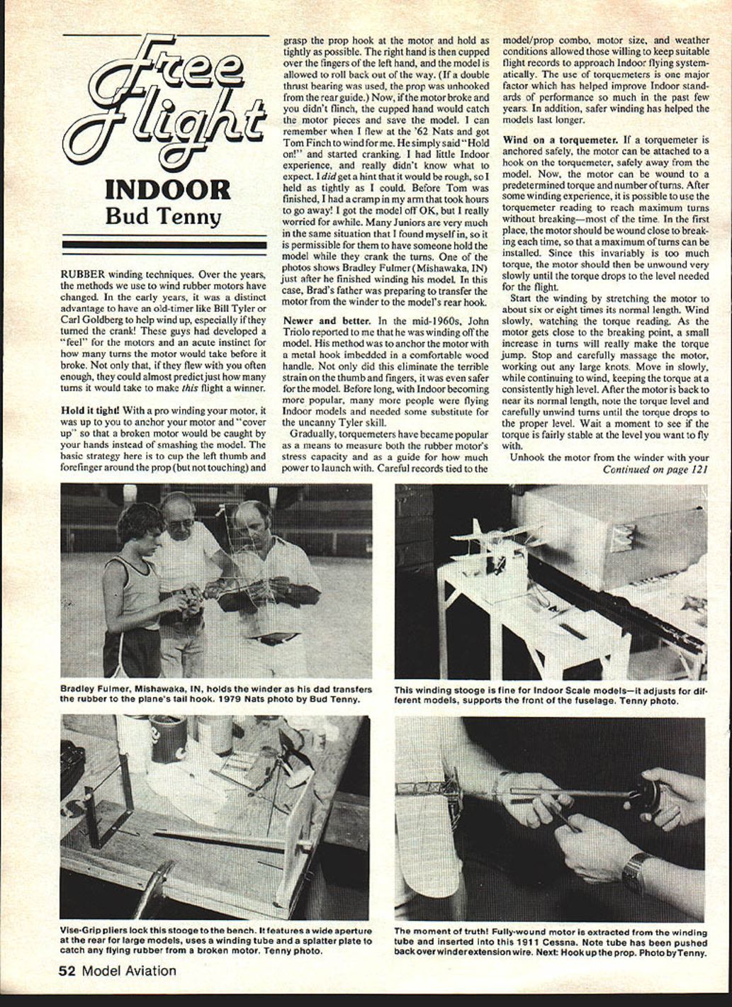 INDOOR Bud Tenny RUBBER winding techniques Over years methods use wind rubber motors have changed early years distinct advantage have old-timer like Bill Tyler Carl Goldberg help wind up especially turned crank guys developed feel motors acute instinct turns motor would take before broke flew often enough could almost predict just turns would take make flight winner Hold tight pro winding motor up anchor motor cover up broken motor would caught hands instead smashing model basic strategy cup left thumb forefinger around prop touching grasp prop hook motor hold tightly possible right hand cupped over fingers left hand model allowed roll back out way double thrust bearing used prop unhooked rear guide Now motor broke didnt flinch cupped hand would catch motor pieces save model can remember flew 62 Nats got Tom Finch wind simply said Hold started cranking little Indoor experience really didnt know what expect did get hint would rough held tightly could Before Tom finished cramp arm took hours go away got model off OK really worried awhile Juniors very much same situation found myself permissible have someone hold model crank turns photos shows Bradley Fulmer Mishawaka IN just after finished winding model case Brads father preparing transfer motor winder models rear hook Newer better mid-1960s John Triolo reported winding off model method anchor motor metal hook imbedded comfortable wood handle did eliminate terrible strain thumb fingers safer model Before long Indoor becoming popular people flying Indoor models needed some substitute uncanny Tyler skill Gradually torquemeters have became popular means measure both rubber motors stress capacity guide much power launch Careful records tied model/prop combo motor size weather conditions allowed willing keep suitable flight records approach Indoor flying system atically use torquemeters major factor has helped improve Indoor stand ards performance much past few years addition safer winding has helped models last longer Wind torquenseter torquemeter anchored safely motor can attached hook torquemeter safely away model Now motor can wound predetermined torque number turns After some winding experience possible use torquemeter reading reach maximum turns breakingmost time first place motor should wound close break ing time maximum turns can installed Since invariably too much torque motor should unwound very slowly until torque drops level needed flight Start winding stretching motor about six eight times its normal length Wind slowly watching torque reading As motor gets close breaking point small increase turns will really make torque jump Stop carefully massage motor working out large knots Move slowly continuing wind keeping torque consistently high level After motor back near its normal length note torque level carefully unwind turns until torque drops proper level Wait moment see torque fairly stable level want fly Unhook motor winder Continued page 121 52 Model Aviation Bradley Fulmer Mishawaka IN holds winder dad transfers rubber planes tail hook 1979 Nats photo Bud Tenny winding stooge fine Indoor Scale modelsit adjusts dif ferent models supports front fuselage Tenny photo Vise-Grip pliers lock stooge bench features wide aperture rear large models uses winding tube splatter plate catch flying rubber broken motor Tenny photo moment truth Fully-wound motor extracted winding tube inserted 1911 Cessna Note tube has pushed back overwinderextension wire Next Hook up prop Photo byTenny IF YOU KNOW MODELER WHO WOULD LIKE TO BUILD FASTER TER NGER AND NEATER DO HIM BIG FAVOR LET HIM TRY SOME OF YOUR HOT STUFFTM AFTER ALL ISNT THAT WHAT MODELING IS ALL ABOUT SHARING GOOD THING GAP FILLING EUE LINEEFILLETING POSITIONABLE HIGH VISCOSITY TIMED BOND 10 25 sec Use like regular glue wait HOT STUFFM ORIGINAL CLEAR FORMULA low viscositydeep penetration NSTANT BOND RATE 3 10 sec started EXCLUSIVE VISIBLE FORMULA low viscositydeep penetration INSTANT BOND RATE 3 10 sec THE HIGH PERFORMANCE ADHESIVES IN HOBBY SHOPS AROUND THE WORLD O4 PO BOX 836 SIMI CA 93065 522-0062 Free Flight Hall Fame awards announced National Free Flight Society has announced its Hall Fame awards 1980 Recipients Louis Garami Ben Shereshaw Henry Cole James Cahill Wallace Simmers individuals have ways contri buted Free Flight model aviation Garami deceased innovative prolific designer especially small models Shereshaw developed famous Bantam engine designer esthetically-pleasing aircraft Cole created rubber-power model designs performed ex ceptionally well Cahill perhaps best known Clodhopper 1938 Wakefield winner Simmers designer still-popular Handlaunch Glider Rubber-power model designs also manufacturer kits supplies Model aviation Exploratorium worlds largest model airplane person-powered channel-crossing Gossamer Albatross display San Franciscos unique learning ex perience Exploratorium period six weeks during May June big news Bud Romaks microfilm Indoor competition models display along Exploratorium Director Dr Frank Oppen heimer thought would present interesting companson shoestring-budgeted Exploratorium gives youngsters opportunity science think theyre just playing learn being taught Crazy idea works Perhaps comic relief also funny little Ornithopter model display modesty prevents mentioning name builder Campbells coming Tra-La Shirley Lee Campbell have formed newest company enter free flight kit market Campbells Custom Kits PO Box 5996 Lake Worth FL 33461 First kit Out door Thermal Piglet proven winner during past six years development kit features full 4 x 18-in wing hair over 3/16 thick made mediumdensity B-grain balsa finished final outline airfoil section about 90% along path completion Other partsC-grain stabi lizer rudder finger notch reinforcement 21in spruce fuselageare shaped final outline Also included kit miscellaneous OHIO SUrcAR MODEL PRODUCTS INC 5630 Cherokee urive canton Ut-I 4412U parts including swinging-weight dethermalizer Typically no liquids included kit In