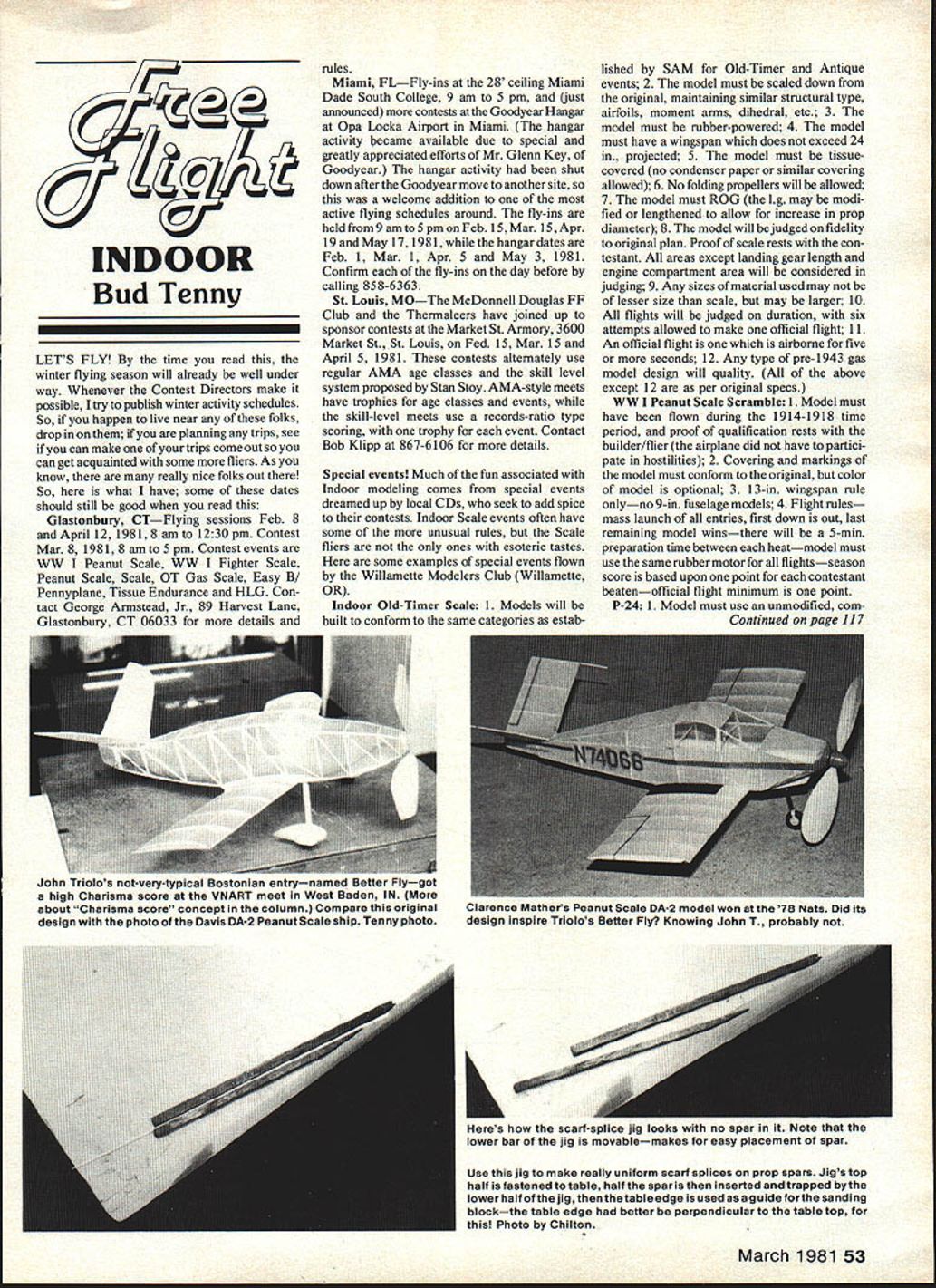 4I INDOOR Bud Tenny LETS FLY time read winter flying season will already well under way Whenever Contest Directors make possible try publish winter activity schedules So happen live near folks drop planning trips see can make trips come out can get acquainted some fliers As know really nice folks out So what have some dates should still good read Glastonbury CTFlying sessions Feb 8 April 12 19818 am 1230 pm Contest Mar 8 1981 8 am 5 pm Contest events WW Peanut Scale WW Fighter Scale Peanut Scale Scale OT Gas Scale Easy B Pennyplane Tissue Endurance HLG Con tact George Armstead Jr 89 Harvest Lane Glastonbury CT 06033 details rules Miami FLFly-ins 28 ceiling Miami Dade South College 9 am 5 pm just announced contests Goodyear Hangar Opa Locka Airport Miami hangar activity became available due special greatly appreciated efforts Mr Glenn Key Goodyear hangar activity shut down after Goodyear move another site welcome addition active flying schedules around fly-ins held 9am 5pm Feb 15 Mar 15 Apr 19 May 17 1981 hangar dates Feb 1 Mar 1 Apr 5 May 3 1981 Confirm fly-ins day before calling 858-6363 St Louis MOThe McDonnell Douglas FF Club Thermaleers have joined up sponsor contests Market St Armory 3600 Market St St Louis Fed 15 Mar 15 April 5 1981 contests alternately use regular AMA age classes skill level system proposed Stan Stoy AMA-style meets have trophies age classes events skill-level meets use records-ratio type scoring trophy event Contact Bob Klipp 867-6106 details Special events Much fun associated Indoor modeling comes special events dreamed up local CDs seek add spice contests Indoor Scale events often have some unusual rules Scale fliers ones esoteric tastes some examples special events flown Willamette Modelers Club Willamette OR Indoor Old-Timer Scale 1 Models will built conform same categories estab lished SAM Old-Timer Antique events 2 model must scaled down original maintaining similar structural type airfoils moment arms dihedral etc 3 model must rubber-powered 4 model must have wingspan does exceed 24 projected 5 model must tissuecovered no condenser paper similar covering allowed 6 No folding propellers will allowed 7 model must ROG lg may modi fied lengthened allow increase prop diameter 8 model will judged fidelity original plan Proof scale rests con testant areas except landing gear length engine compartment area will considered judging 9 Any sizes material used may lesser size scale may larger 10 flights will judged duration six attempts allowed make official flight 11 An official flight airborne five seconds 12 Any type pre-1943 gas model design will quality above except 12 per original specs WW Peanut Scale Scramble 1 Model must have flown during 1914-1918 time period proof qualification rests builder/flier airplane did have partici pate hostilities 2 Covering markings model must conform original color model optional 3 13-in wingspan rule onlyno 9-in fuselage models 4 Flight rules mass launch entries first down out last remaining model winsthere will 5-mm preparation time between heatmodel must use same rubber motor flightsseason score based upon point contestant beatenofficial flight minimum point P-24 1 Model must use unmodified com Continued page 117 Use jig make really uniform scarf splices prop spars Jigs top half fastened table half spar inserted trapped bythe lower half ofthejig thenthetableedge used asa guideforthe sanding blockthe table edge better perpendicular table top Photo Chilton March 1981 53 John Triolo .uL-vry-Lypiau cunuviaum u,t yuacu catty Charisma score VNART meet West Baden IN about Charisma score concept column Compare original design photo Davis DA-2 Peanut Scale ship Tenny photo Clarence Mathers Peanut Scale DA-2 model won 78 Nats Did its design inspire Triolos Better Fly Knowing John T probably L Heres scarf-splice jig iOOK5 wisn no spar NOTe maT Toe lower bar jig movablemakes easy placement spar area Try soldering up two holes using tubing smaller *-in feed vent lines also use smallest fuel tubing filter can find limit quantity fuel neither tank nor engine guys against change better stop right go build some tanks Also mail bag letter Dave Clarkson whos now living South Africa truly Knows has seen cycle FAT Combat Britain Europe go Oliver 15 diesel racing glow back again 10-sized diesel FAT going great guns USA land plenty nitro elsewhere things going downhill angry auto manufacturers seeing writing wall concerning conservation fuel resources go blindly flying disposable models built score using nitro-guzzling engines devour $30-a-gallon fuel alarming rates Lets look further ahead summers Nats see what store FAT Combat years down road Dave suggests rethinking rules some thing outside USA can live places nitro components diesel fuel hard come very expen sive Lets assume methanol castor oil will available reasonable prices buy alky $100 gallon castor oil about $900 same quantity suggests 10-size motor 165cc ideal using bushing models no ball-bearing racing engines Lines would 012s 45 ft 11 long 14 meters Im sending Dave Cipolla lOs advertised magazine him test plan pick up myself see what would like fly model such engine John Gladfelter neat Slow Combat ship Nats featured external controls very simple construction approach similar Phil Cartier replaceable-wing model will cost just much build models great thing will take much time Performance almost good top-line model good enough contests know several clubs using one-design concept promoting Slow Combat meets everyone uses ship similar Gladfelters no disadvantage because slightly heavier draggier plane Ill leave something want list AAC setup Rossi Yep chromed aluminum liner aluminum pistonall $60 Write Henry Nelson 729 Valemont Dr Verona PA 15147 sure include stamped self-addressed envelope Henry prob ably wont have time reply can write address end column wont much good because Ijust steam off stamps save up buy glow plugs props Charlie Johnson 3716 Ingraham St San Diego CA 92109 Contester/Dun