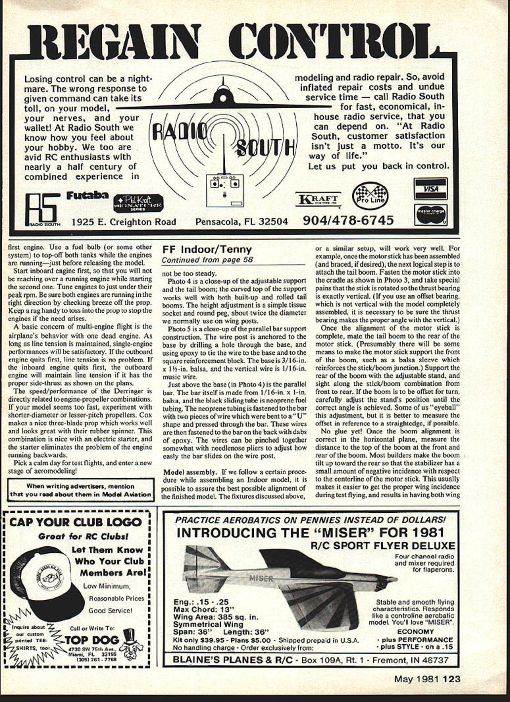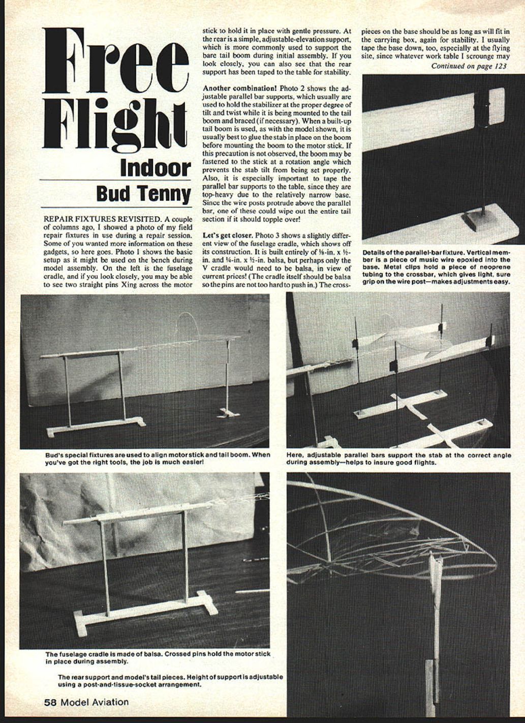 Fee Flight Indoor Bud Tenny REPAIR FIXTURES REVISITED couple columns ago showed photo field repair fixtures use during repair session Some wanted information gadgets goes Photo 1 shows basic setup might used bench during model assembly left fuselage cradle look closely may able see two straight pins Xing across motor stick bold place gentle pressure rear simple adjustable-elevation support commonly used support bare tail boom during initial assembly look closely can also see rear support has taped table stability Another combination Photo 2 shows ad justable parallel bar supports usually used hold stabilizer proper degree tilt twist being mounted tail boom bracedif necessary built-up tail boom used model shown usually best glue stab place boom before mounting boom motor stick precaution observed boom may fastened stick rotation angle prevents stab tilt being set properly Also especially important tape parallel bar supports table since top-heavy due relatively narrow base Since wire posts protrude above parallel bar could wipe out entire tail section should topple over Lets get closer Photo 3 shows slightly differ ent view fuselage cradle shows off its construction built entirely -in x -in x -in balsa perhaps V cradle would need balsa view current prices cradle itself should balsa pins too hard push crosspieces base should long will fit carrying box again stability usually tape base down too especially flying site since whatever work table scrounge may Continued paze 123 Details parallel-bar fixture Vertical mem ber piece music wire epoxied base Metal clips hold piece neoprene tubing crossbar gives light sure grip wire postmakes adjustments easy rear support models tail pieces Height support isadjustable using post-and-tissue-socket arrangement 58 Model Aviation uus bpII IlALures used align motor stick tail boom youve got right tools job much easier adjustable parallel bars support stab correct angle during assemblyhelps insure good flights ie made balsa Crossed pins hold motor stick place during assembly ILGAIN Losing control can night mare wrong response given command can take its toll model nerves wallet Radio South know feel about hobby too avid RC enthusiasts nearly half century combined experience EE Fu 1925 E Creighton Road NNIRJI modeling radio repair So avoid inflated repair costs undue service time Radio South fast economical inhouse radio service can depend Radio South customer satisfaction isnt just motto Its way life Let us put back control VISA Line Pensacola FL 32504 904/478-6745 first engine Use fuel bulb some other system top-off both tanks engines runningjust before releasing model Start inboard engine first will reaching over running engine starting second Tune engines just under peak rpm sure both engines running right direction checking breeze off prop Keep rag handy toss prop stop engines need arises basic concern multi-engine flight airplanes behavior dead engine As long line tension maintained single-engine performances will satisfactory outboard engine quits first line tension no problem inboard engine quits first outboard engine will maintain line tension has proper side-thrust shown plans speed/performance Derringer directly related engine-propeller combinations model seems too fast experiment shorter-diameter lesser-pitch propellers Cox makes nice three-blade prop works well looks great rubber spinner combination nice electric starter starter eliminates problem engine running backwards Pick calm day test flights enter new stage aeromodeling reed about Model ing advertisers mention FF Indoor/Tenny Continued page 58 too steady Photo 4 close-up adjustable support tail boom curved top support works well both built-up rolled tail booms height adjustment simple tissue socket round peg about twice diameter normally use wing posts Photo 5 close-up parallel bar support construction wire post anchored base drilling hole through base using epoxy tie wire base square reinforcement block base 3/16-in x 1 -in balsa vertical wire 1/16-in music wire Just above base Photo 4 parallel bar bar itself made 1/16-in x 1-in balsa black sliding tube neoprene fuel tubing neoprene tubing fastened bar two pieces wire bent U shape pressed through bar wires fastened bar back dabs epoxy wires can pinched together somewhat needlenose pliers adjust easly bar slides wire post Model assembly follow certain proce dure assembling Indoor model possible assure best possible alignment finished model fixtures discussed above similar setup will work very well example once motor stick has assembled braced desired next logical step attach tall boom Fasten motor stick cradle shown Photo 3 take special pains stick rotated thrust bearing exactly vertical use offset bearing vertical model completely assembled necessary sure thrust bearing makes proper angie vertical Once alignment motor stick complete mate tail boom rear motor stick Presumably will some means make motor stick support front boom such balsa sleeve reinforces stick/boom junction Support rear boom adjustable stand sight along stick/boom combination front rear boom offset torn carefully adjust stands position until correct angle achieved Some us eyeball adjustment better measure offset reference straightedge possible No glue yet Once boom alignment correct horizontal plane measure distance top boom front rear boom Most builders make boom tilt up toward rear stabilizer has small amount negative incidence respect centerline motor stick usually makes easier get proper wing incidence during test flying results having both wing r s CAP YOUR CLUB LOGO Great NC CIubsI I Low Minimum Reasonable Prices I I Good Service InquireCall Write cuatomEl printed TEE TOP DOG TS too 4730 SW 75th Ave 4jJyf Miami FL 33155 1305 261 7768 1 BLAINES PLANES & R/C Box 109A Rt 1 Fremont IN 46737 May 1981 123 Let Know Members Arel PRA CT/CE AEROBA TICS ON PENNIES INSTEAD OF DOLLARS INTRODUCING THE MISER FOR 1981 R/C SPORT FLYER DELUXE Four channel radio mixer required flaperon