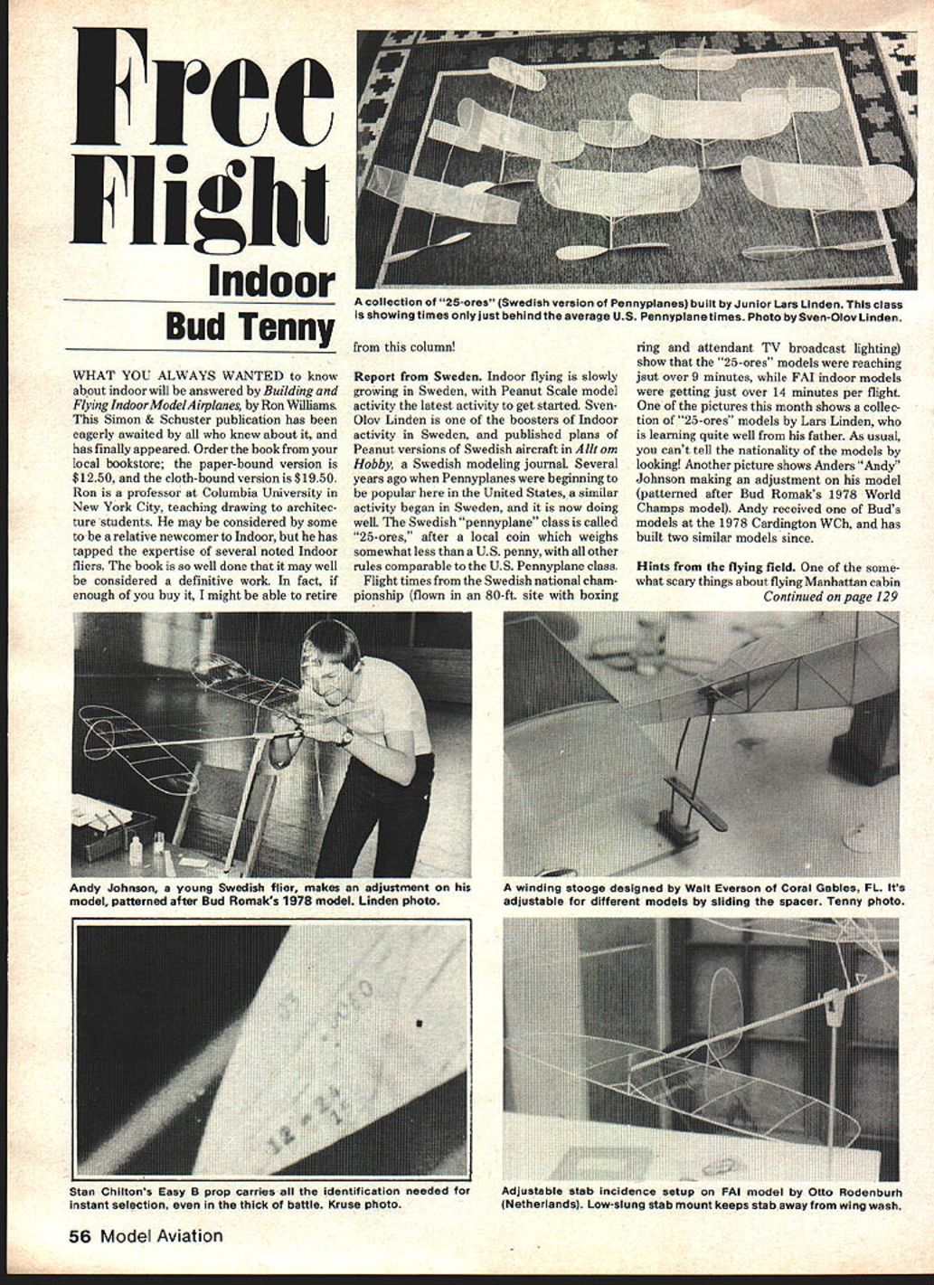 Fee Flight Indoor Bud Tenny WHAT YOU ALWAYS WANTED know about indoor will answered Building Flying Indoor ModelAirplane Ron Williams Simon & Schuster publication has eagerly awaited knew about has finally appeared Order book local bookstore paper-bound version $1250 cloth-bound version $1950 Ron professor Columbia University New York City teaching drawing architec ture students may considered some relative newcomer Indoor has tapped expertise several noted Indoor fliers book well done may well considered definitive work fact enough buy might ableto retire column Report Sweden Indoor flying slowly growing Sweden Peanut Scale model activity latest activity get started Sven Olov Linden boosters Indoor activity Sweden published plans Peanut versions Swedish aircraft Alit om Hobby Swedish modeling journaL Several years ago Pennyplanes beginning popular United States similar activity began Sweden now doing well Swedish pennyplane class called 25-ores after local coin weighs somewhat less US penny other rules comparable US Pennyplane class Flight times Swedish national cham pionship flown 80-ft site boxing ring attendant TV broadcast lighting show 25-ores models reaching jsut over 9 minutes FAI indoor models getting just over 14 minutes per flight pictures month shows collec tion 25-ores models Lars Linden learning quite well father As usual cant tell nationality models looking Another picture shows Anders Andy Johnson making adjustment model patterned after Bud Romaks 1978 World Champs model Andy received Buds models 1978 Cardington WCh has built two similar models since Hints flying field some what scary things about flying Manhattan cabin Continued page 129 56 Model Aviation collection 25-ores Swedish version Pennyplanes built Junior Lars Linden class showing times just behind average US Pennyplane times Photo Sven-Olov Linden Andy Johnson s young Swedish makes adjustment winding stooge designed Walt Everson Coral Gables FL Its model patterned after Bud Romaks 1978 model Linden photo adjustable different models sliding spacer Tenny photo Stan Chiltons Easy B prop carries identification needed Adjustaoie staD Incidence setup FAI model Otto ltodenburh instant selection thick battle Kruse photo Netherlands Low-slung stab mount keeps stab away wing wash ILGAIN Losing control can night mare wrong response given command can take its toll model nerves wallet Radio South know feel about hobby too avid RC enthusiasts nearly half century combined experience Futaba L0LJ 1925 E Creighton Road CONTROl modeling radio repair So avoid inflated repair costs undue service time Radio South fast economical inhouse radio service can depend Radio South customer satisfaction isnt just motto Its way life Let us put back n control U Pensacola FL 32504 i~j 904/47&6745 Earl Stahl plans Smithsonian can asking reports Allan Schanzle latest DC Maxecuters Max-Fax newsletter Specify desired aircraft publication source along large self-addressed stamped envelope limit set plans per request Smithsonian National Air Space Museum Attn Library Smithsonian Institution Wash ington DC 20560 have old maga zines willing help modelers out Sounds good might accept dona tions appreciate what doing Earl Stahl designs forthose arrived modeling scene recently fly beautifully simple build Thanks cards letters photos hints tips would like get touch FF Scale club eye receiving newsletter journal send self-addressed postcard along some info what looking club just may area edit club newsletter might interest Scale modelers send along may able help pick up Bill Warner 423-C San Vicente Blvd Santa Monico CA 90402 FF Indoor/Tenny Continued page 56 models lighter Scale models problem safely winding motors trusted helper experienced handling such models can hold model help task hooking loaded motor prop getting noseblock safely place fliers prefer use some sort stooge anchor model can wind motor fly depending someone else may need fly own models Walt Everson Coral Gables FL uses stooge special feature help wind Manhattan cabin model Walts stooge has two vertical wires hold rear motor peg have inward bend about half-way up base bend coupled [A li no une lug k W ph have setting ap production replacement canspanents such battery packs servos receivers switch harnesses chargers nrcall evisting PraLine will ready regular hasis As bob Curare Ace will pradace line radias asides PraLine label will casuhine oar 25 years vf experience PraLines dedication rv quality lv produce radia feel will carry tradition af anmatched perfarmance aed de pendabiily directed toward Imly dedicated SIC modeler transmitter will cansist basically af prasen PraLine gimbals exceptional Silver Sesen encoder has aniversally ac cepted will upgrade receiver serves far pasitive palse cawpntahility und maw efficient aperutian Oar gaul will ra re taut what made PraLine mast used mdiv campetision circlet several years ago add things necessary update curreel slateofthe-art make unce again Winners Edge mast certaitdy plan stand behind what manufacture stay 28 yeses w lhss bussness proof rbnt Pro Line Electronics Division ACE E/ Ifl would like info parts service cali write PRO LINE Box 735 E 203 W 19 th St HlgginsviiieMo 64037 Teiephone 816 584 7121 wood spacer slides up down wires allows jaws open close spacer moves Thus release model Walt slides spacer down forces top end wires apart enough model inserted removed bit advance planning during construction type stooge can built hold different models case height wires set match models landing gear height model approximately level set up wind word warning build kind September1981 129 Solar Challenger model made byE Fillon St Raphael France Ship spans meter weighs 150 grams powered solar cells just like full-sized plane Photo Fillon few new members NEW XHINGE$189/Pkg N EW EASY-MOUNT K&B 40 . Designed Manufactured I~ See Favorite Hobby Shop ER r~u MANUFACTURING Luke Preston Smith Dakota 57249 STOP- A- PROP BRAKES /2A ATD Brake Kit no 101 $275 FAI