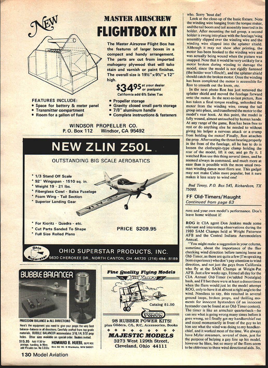 rcc FlighE Indoor Bud Tenny IMPORTANT PROPOSAL Erv Rodem sky current World Champion CD recent Team Selection Finals noted top fliers finals lost between six models during meet Although flying conditions really good felt weather Santa Ana hangar wasnt factor destruction derby since air wasnt turbulent just cool So did models go Erv felt models have evolved top level efficiency rules have necessitates extra push top fliers As result models spend more time near ceiling getting hung up worse Another factor costs models relatively large wing area long motor sticks two factors give model harder handle needs large box transport minimum six models should have top-level competition Whats solution After lot thought discussion other fliers following pro posal developed event called Santa Ana Stick 1 Wingspan60 cm 23622 2 Length excluding prop60 cm 3 Weight excluding rubberone gram 4 Projected area horizontal lifting surfaces 1200 sq cm 186 sq Biplanes must include area both wings 5 Motor weighth gram 6 No gears motors mechanical gadgets change prop pitch flying surfaces con figuration changes must aeroelastic Wow drastic Actually Continued page 129 62 Model Aviation special winding stooge built Ron Ganser Indoor Cabin models Note mounted tail group torque meter winding wire fuse has slipped over wire fits through splatter shluu u na motor being wound Look Ma no hands windings done rubber held torque meter winding wire winder model protected motor breakage splatter shield After taking torque reading Ron slips fuse forward off winding wire can unhook motor mount tail group motor has transferred rear hook tail boom seated rear fuse Motor still held winder rear hook model supported clamp rear Ron now hooks motor prop seats thrust bearing onto front fuselage releases model clamp flies stooge doesnt pick air him competition covered round-by-round account Fred Pearce analysis climb patterns Andrew Bauer observations Ralph Prey greatly expanded version story appeared Free Flight also dozens photographs around 30 drawings top models including some features can order report NFFS Publica tions 4858 Moorpark Ave San Jose CA 95129 price $750 NFFS members non-residents US $850 others Handling postage $2 number copies sent anywhere world 4th class airmail Americas $3 per copy airmail Europe $4 per copy Far East pacific air $5 per copy Bob Meuser 4200 Gregory St Oaklan4 CA 94619 FF Indoor/Tenny Continued page 62 drastic thing reduced rubber weight Erv feels current model size reduced motor weight should reduced arrived conclusion after several years test-flying models half-length motors Such testing has two major advantages models can flown full torquefully wound climbing top hangar staying up over half hour Thus both models time saved short-motor tests addition Erv forecasts slightly smaller wing probably much shorter motor stick will fit box can carried cabins airliners during trips contests model should much stronger about 5in wing chord smaller wing chord span wing loading should about samedue lighter motor about 7 grams lighter has said rule places higher premium having really good rubber true long run must admit winners both good luck good rubber retrospect must remember original reason change 65 cm models first try gram 65 cm models reduce flight timet organizers World Championships would have furnish both staff site relatively long time required fly off high-entry World Champion ship Neither approach has worked missing ingredient may well limit amount rubber thing surewe would have learn few things about handling rubber wound higher relative torque levels perhaps will need learn about picking certain kinds rubber other aspect Santa Ana Stick has mentioned model fits existing rule fact smaller stronger model might exactly what needed cool turbu lent days low ceilings mind can assume anyone built try rules change wouldnt really building orphan model could still quite useful Follow-up couple past issues discussed various field gadgets methods winding also requested Indoor Cabin fliers tell us pet methods safely winding special beasts series pictures column show elaborate scheme weve seen really works well spite apparent com plexity photos show fixture used Ron Ganser 1981 West Baden Indoor Nats NIMAS SNART event believe Ron said designed someone else forgot FAMOUS BRITISH DIESELS IAEROMODELLER PLANS M/E PAW C D/C 2nd EDITION CATALOG-DIESEL HMrI $350 pp HOBBY HIDEWAYDELAVANCIL 309 244-7389 61734 HSRBYHISEAWAYHOBBYH$SERWAYHOBBYIITSE4SIAYBOBBYHI$EAW January 1982 129 R0RBYHE$EAWAYH0BBYHI$EAWAYH$BBYHI$EAiJAYIBBYHISEAWAY AEDIATE SHIPMENT New ~UtEH UUADRA $8995 odS BRISIGHELLA FLYWHEEL $10695 QUADRA MARINE engine $12495 QUADRA REPAIR $1000 pine porte KIORITZ engine 244 co in $19995 Jin Meeter ERCOUPE PLANS 92395 KIT $22995 inn Menser TOMAHAWK PLANS $2395 KIT $24999 BALSA end BASSWOOII eli sizes 35% OFF Concept FLEETKIT 991 7995 FG Cowl -91995 QUADRA loel tenkelB ot. $699 32 oc. 5795 1/3 VICKERS LEWIS MACHINE GUN KITS91499 10 die COVERED WHEELS USA Pop52995 PLAN5 SUPER STEARMAN 1/4 Godfrey$2800 STAROUSTER TOO 1/4 Brieghnlle$2995 1/3 seem J-3 Cob NnIilz92995 VOLESPLANE 1/3 Chicken Cherlie$2195 FLY BABY 1/3 91895 SE-5 1/3RocecIr 92495 COCKPIT KITS Steerreen FInnI F4U191600 Ercoepn 91500 Tonrthewk $2150 Cilebrie92495 J3 Ceb 91650 ME1D9 $1950 Spilfirn92195 FIBERGLASS ARROW SHAFTS S/I B e 32 Ig6/91000 24-Hour Seice. Add $2SO postage Send Bank Check Money Order JIM MESSERS QUALITY MODEL PRODUCTS 106 Valley View DrAllegany NY 14706 FEATURES INCLUDE Space battery & meter panel Transmitter compartment Room gallon fuel MASTER AIRSCRIW FLIGHTBOX KIT Master Airscrew Flight Box has features larger boxes compact handy arrangement parts cut imported mahogany plywood will take stain varnish paint finishes overall size 19W x 9W x 12 high $3at dealer 495 postpaid California add 6% Sales Tax Propeller storage Gravity closed small parts storage 7/8 aluminum handle Complete instructions & fasteners WINDSOR PROPELLER CO PO Box 112 Windsor