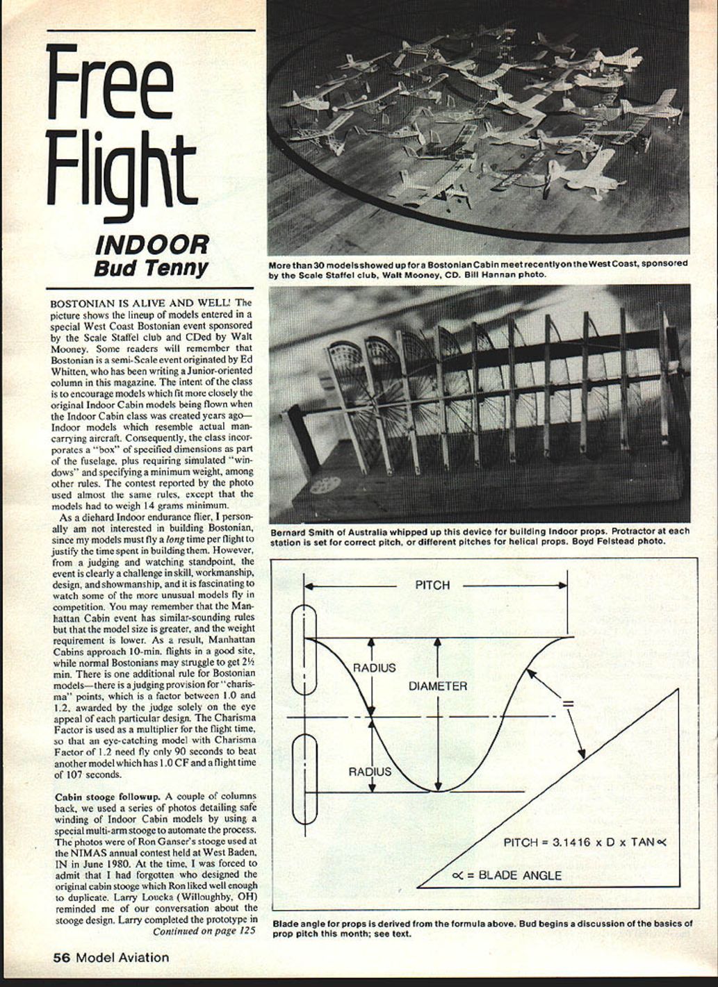 Free Flight INDOOR Bud Tenny BOSTONIAN IS ALIVE AND WELL picture shows lineup models entered special West Coast Bostonian event sponsored Scale Staflel club CDed Walt Mooney Some readers will remember Bostonian semi- Scale event originated Ed Whitten has writing Junior-oriented column magazine intent class encourage models fit closely original Indoor Cabin models being flown Indoor Cabin class created years ago Indoor models resemble actual mancarrying aircraft Consequently class incor porates box specified dimensions part fuselage plus requiring simulated win dows specifying minimum weight among other rules contest reported photo used almost same rules except models weigh 14 grams minimum As diehard Indoor endurance flier person ally am interested building Bostonian since models must fly long time per flight justify time spent building However judging watching standpoint event clearly challenge skill workmanship design showmanship fascinating watch some unusual models fly competition may remember Man hattan Cabin event has similar-sounding rules model size greater weight requirement lower As result Manhattan Cabins approach 10-mm flights good site normal Bostonians may struggle get 2 mm additional rule Bostonian modelsthere ajudging provision charis ma points factor between 10 12 awarded judge solely eye appeal particular design Charisma Factor used multiplier flight time eye-catching model Charisma Factor 12 need fly 90 seconds beat another model has 10 CF flight time 107 seconds Cabin stooge followup couple columns back used series photos detailing safe winding Indoor Cabin models using special multi-arm stooge automate process photos Ron Gansers stooge used NIMAS annual contest held West Baden IN June 1980 time forced admit forgotten designed original cabin stooge Ron liked well enough duplicate Larry Loucka Willoughby OH reminded conversation about stooge design Larry completed prototype Continued page 125 4 PITCH t RADIUS DIAMETER RADIUS PITCH 6 x D x TANO E ANGLE Blade angle props derived formula above Bud begins discussion basics prop pitch month see text 56 Model Aviation 30 models showed up Bostonian Cabin meet recentlyon West Coast sponsored Scale Staffel club Walt Mooney CD Bill Hannan photo Bernard Smith Australia whipped up device building Indoor props Protractor station set correct pitch different pitches helical props Boyd Felstead photo Edwin Heck CA Perry William S Camp bell Flying Eagles Club Penna Auburn Finger Lakes Radio Control Club Flying Aero Sport Team FAST Pensacola Aero modelers Charles Sotich Les Hard Arthur Gagnier Ronald Gooden Richard Everett RM Sherrod Edward McCarty RL Lainbe Albert R Gallik Gary Widmer Bob Brantley Jim Powers John Ferrer Lee Norcross Helena Flying Tigers Next month report successful fundraising efforts Aeronautics Division Hobby Industry Association America photos taken presentation made HIA AMA Dallas HIA Trade Show January FF Indoor/Tenny Continued page 56 time 1980 Midwest Indoor Champion ships Chicago later used 1980 Nats send off Cabin flights won Indoor Cabin 1980 NIMAS meet Tony Sutter Corpus Christi TX also similar stooge apparently designed about same time FAI rules followup Since last word Erv Rodemskys proposal drop FAI class Fl D model span 60 cm along limit rubber weight some other restrictions Ervs planned 60cm contest held Santa Ana hangar December 27 1981 course extremely competent FAI fliers California won right Wrong Eighteen-yearold Darryl Stevens son HLG whiz Curt Stevens won went set new Senior Indoor HLG record same day flight times came Out way high single flight used scoring 1 Darryl Stevens 2548 2 EN Rodemsky 2506 3 Cezar Banks 2227 4 Warren Williams 2006 5 Clarence Mather 2005 6 Andy Faykun 1700 should noted change rules originally proposed effect contest rubber weight increased maximum instead original l gram proposal EN noted basic goal rules proposal demonstratedno except Faykun hit ceiling no long periods time spent near ceiling has typical Fl D events recent years Now basic proposal has out discussed Indoor fliers over world inevitable rash counter-proposals has come about being aired Model Aviation other publications Erv has working number people trying deal Discriminate Scale Fliers Demand Dave Platt m perfectionist.my kits prove reputation finest models RC scale has founded upon careful attention detail period over twenty years fact Im particular about kits theyre available personally make each kit sign hold myself responsible reproductions genuine Dave Platt kit guarantee true outline combined force arrangement flies properly THE ULTIMATE legendary beauty efficiency Spitfire 1/5 scale Accurate last subtle curve Magnificient indeed lust sitting simply awe inspiring flight Powered 90 120 glo engine br Maximizer ultimate Spitfire will provide intense experience sophisticated R/C AflmodelerSpan 88Length 76Weight 1520 lbs er Jungmeister regular direct drive engines 60 go 65 span 11/4 scale ace aerobatic biplane timet Still fits car $129 4 New 1/4 Scale Pilot$119 Supplied unpaint-Coniing ed comes struction booklet 4 cale model QuadraRetracting o tie han saw enginesLanding Gear $30 5 e II figure WWII Fishier Patented Y-lock Also availP osystem tar 1/4 able 1/51/5 scale models scale $25 HOW TO ORDERDirect manufacturer no mark-upl Write calime accept check money order Master Charge Visa cards pay UPS anywhere USA Florida residents add 4% sales tax Yes accept foreign orders pay freight information model send sell addressed envelope nave Dlatt iviodels inc 6940 NW 15th Street Plantation Florida 33313 __ Phone 305 587-4861 Nor oIIIoied aih ohar Ca yany Looking Hard Find Soarinq Goodies 5/Awe c3ai/bkine f/aclory o has t complete comprehensive line RIO Soaring products toever exist North America o Our line products includesthosefrom some respected firms Europe well complete inventory own US manufacturers o We carry complete line Kits Hardware Accessories & Building Supplies have full inventory Launching Equipment & 