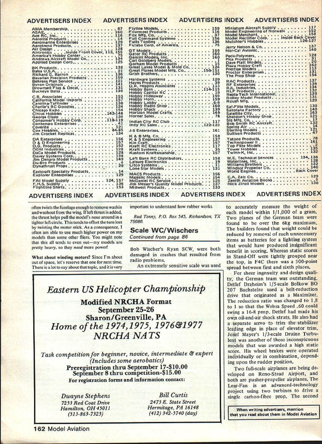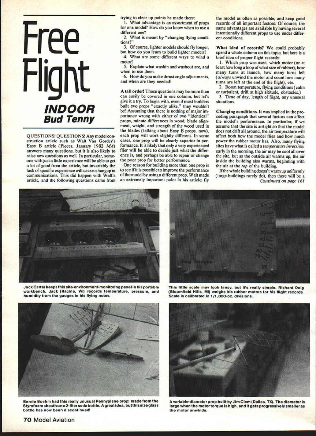 Free Flight INDOOR Bud Tenny QUESTIONS QUESTIONS Any model con struction article such Walt Van Gorders Easy B article Pieces January 1982 MA answers questions also likely raise new questions welL particular some just little experience will able get lot good article invariably lack specific experience will cause hangup communications did happen Walts article following questions came trying clear up points made 1 What advantage assortment props model know use different 2 What meant changing flying condi tions 3 Of course lighter models should fly longer learn build lighter models 4 What some different ways wind motor 5 Explain what washin washout use 6 How make thrust angle adjustments needed tall order questions may can easily covered column lets give try begin builders built two props exactly alike wouldnt Assuming nothing major im portance wrong either two identical props minute differences wood blade align ment weight strength wood used blades talking about Easy B props now prop will work slightly different some cases prop will clearly superior per formance likely very experienced flier will able decide just what differ ence perhaps able repair change poor prop better performance reason building prop see possible improve performance model using different prop Walt made extremely important point article fly model often possible keep good records important factors course same advantages available having several intentionally different props use under differ ent conditions What kind records could probably spend whole column topic brief idea proper flight records 1 Which prop used motor least long loop what size rubber turns launch turns left always unwind motor count turns left end flight etc 2 Room temperature flying conditions calm turbulent drift high altitude obstacles 3 Time day length flight unusual situations Changing conditions implied pre ceding paragraph several factors can affect models performance particular assume site airtight model does drift around air temperature will affect both model flies much power rubber motor has Also flying sites have what called temperature inversion early morning air may cool over site outside air warms up air inside building also warms beginning air top building whole building doesnt warm up uniformly large buildings rarely will Continued page 161 70 Model Aviation Jack Carter keepsthis site-environment-monitoring panel portable workbench Jack Racine WI records temperature pressure humidity gauges flying notes little scale may look fancy its really simple Richard Doig Bloomfield Hills Ml weighs rubber motors flight records Scale calibrated 1/1 OOO-oz divisions Bernie Boehm really unusual Pennyplane prop made Styrofoam sheath 2-litersoda bottle great idea butthis size glass bottle has now discontinued variable-diameter prop built Jim Clem Dallas TX diameter large motortorque high gets progressively smalleras motor unwinds George Myers refers old Austin-Craft timer common use both ignition cutoff dethermalizing slow-leak air timer Doug Dahlke Oshkosh pressed air-leak timer double service using time DT release also using spool weight itself Doug used 70-ft line attach well-wrapped padded timer wingtip Thanks input folks columnists thrive Clarence E Haugh4 3226 Honeysuckle Dr RL 5 Box 16 Coeur dAlene ID 83814 FF Indoor/Tenny Continued page 70 warm air layer top may take quite bit power model break out cooler air warm upper air As soon model gets warm air motor will absorb warmth surrounding air increase temperature will translated extra energy available motor addition air turbulent model will often upset will lose altitude flight time Building light models certain extent following remarks simplification ability build light models depends much tech nique does having super-light wood Briefly keep careful records weight part model various stages building After have flown first model see anything too weak can build part next model little bit lighter again keeping record weights After some part latest model will too light will break often point have discovered limits part model After have discovered light part models can resulting models will much lighter first models built After much practice limits likely outmoded since will have learned handle lighter models safely Washin washout two terms refer intentional wing twist warp Washin means leading edge half wing stab higher trailing edge surface twisted higher angle attack Washout just oppositewing twist reduces angle attack reasons having washin/washout adjust ments wing twofold control torque compensate turning flight think about model flying circle realize inboard wing tip traveling smaller circle outboard wing tip therefore actually flying slower Consequently derive same lift inboard wing necessary crease angle attack airfoil Washin will nicely same way can use reverse twist washout help reduce excess lift generated faster-flying outboard wing model designs minimize amount washin wash out required making inboard wing longer get extra lift having area inboard side model What about torque Torque reaction model twisting force applied propeller rubber motor STINS5~ VOYAGER Quarter Scale 2 oth Kits designed Quadra other 2 cycle engines Plywood & Softwood construction J $9950 Th BONZO Almost 1/3 Scale Sport Pylon Pattern Flying 60 Quadra Power Wing Span 54 1 Pc Shipping Charges Included US & Canada motor turns propeller clockwise also trying turn fuselage counterclockwise adds downward force inboard wing extra washin extra area combination two will help overcome force Thrust adjustments ability change angle thrust line line through prop shaft very useful adjusting Indoor models order able make adjust ment model must have double thrust bear ing prop shaft supported bearing front usually hook rear thrust bearing can bent otherwise adjusted prop shaft can made point some direction other straight forward Some fliers actually plan ahead build favorite thrust adjustments during construction distinctive sound air.