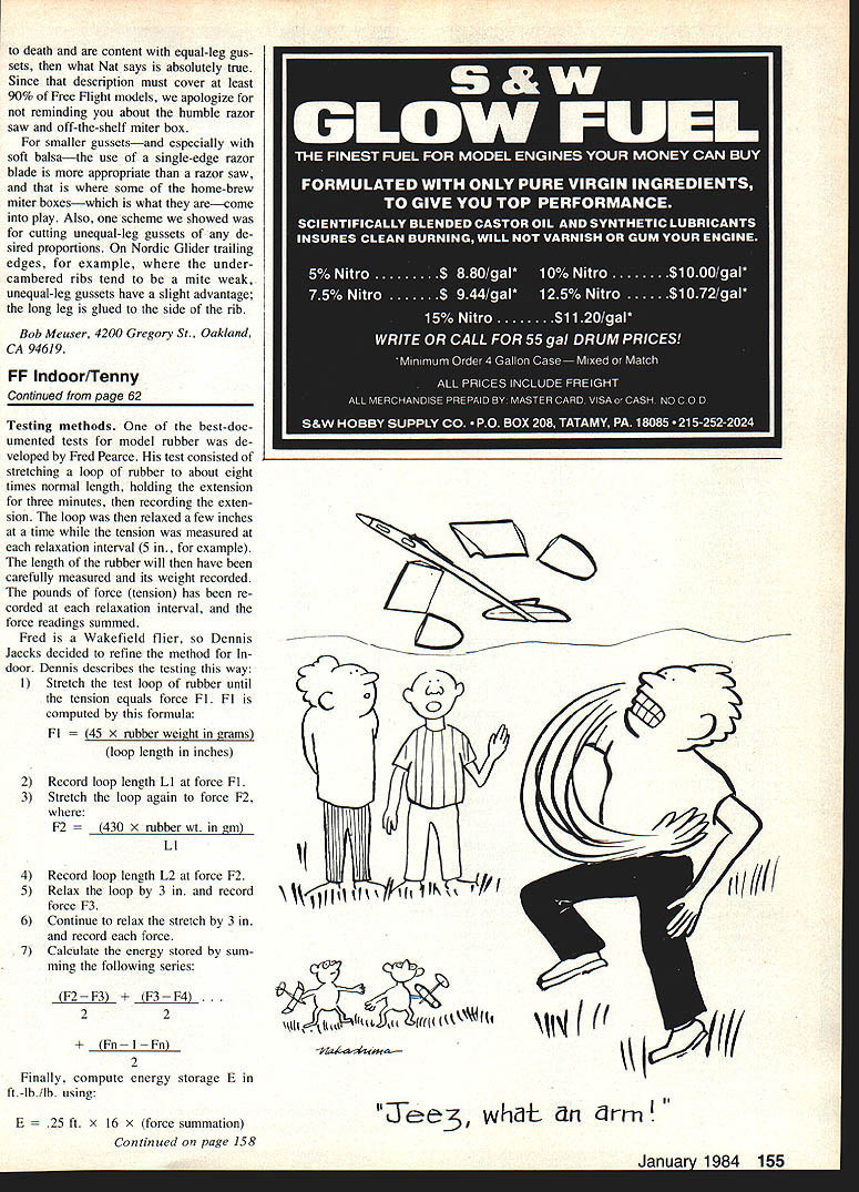 Free Flight INDOOR Bud Tenny MAKE READY time year Indoor fliers begin think about upcoming contest season Dont like doput off looking models until night before contest usually find out warps paper-covered models holes microfilm models rubber have stripped model destroyed last spring trying balloon down rafters Besides used last patch ing film last spring isnt single sheet film storage Wise up Check tool kit models ready about tool kit Have replenished pins cleaned out driedup glue gun bought some new CyA glue replaced X-Acto blade repaired run down stand replaced dirty wiping rags etc tools normally carned Indoor tool kit still Outdoor FF box Are made-up motors proper order Did clean up last spring store cool place about making sure flight log has enough fresh pages Times a-wastin Sad news bright lights Eastern Seaboard Ed Whittens New York Indoor Times newsletter bit darker issue seems able arrange Nassau County Arena Long Beach remain open seems almost certain Low Library Rotunda Columbia University will available year Ron Williams no longer staff University no has stepped forward sponsor activ ity So lets wish New York bunch well search place fly time also fliers acknowledge indebtedness Ed Whitten Ron Wil liams hard work leadership over past several years Rubber testing back remarked coming shortage good rubber once Pirelli source dried up also noted need definitive test rubber quality nondestructive yet tests Cezar Banks built nifty torquemeter hobby shop materials Construction details column Now hed tell us about winder background . rubber almost-breaking stress own tests rubber serve follow old maxim Wind until well enough really competitive breaks back off turn order far Ive heard test described truly define potential piece rub- meets goals described above ber number persons have developed Continued page 155 62 Model Aviation Tflls ultra-long Easy B typifies European experiments class ws flown West Baden Doug Barbour weighs 17 grams still turned times 15 minutes An experimental super-light-foam Bostonian Cabin Burr Stanton Seven grams column really legalit has no windshield windows death content equal-leg gus sets what Nat says absolutely true Since description must cover least 90% Free Flight models apologize reminding about humble razor saw off-the-shelf miter box smaller gussetsand especially soft balsathe use single-edge razor blade appropriate razor saw some home-brew miter boxeswhich what arecome play Also scheme showed cutting unequal-leg gussets de sired proportions Nordic Glider trailing edges example undercambered ribs tend mite weak unequal-leg gussets have slight advantage long leg glued side rib Bob Meuser 4200 Gregory St Oakland CA 94619 FF Indoor/Tenny Continued page 62 Testing methods best-doc umented tests model rubber de veloped Fred Pearce test consisted stretching loop rubber about eight times normal length holding extension three minutes recording exten sion loop relaxed few inches time tension measured relaxation interval 5 example length rubber will have carefully measured its weight recorded pounds force tension has re corded relaxation interval force readings summed Fred Wakefield flier Dennis Jaecks decided refine method door Dennis describes testing way I Stretch test loop rubber until tension equals force Fl Fl computed formula Fl rubber weight grams loop length inches 2 3 Record loop length LI force Fl Stretch loop again force F2 F2 430 X rubber wt gin Ll 4 Record loop length L2 force F2 5 Relax loop 3 record force F3 6 Continue relax stretch 3 record force 7 Calculate energy stored sum ming following series F2F3 . 2 2 FnlFn 2 Finally compute energy storage E ft-lb/lb using F t x 16 x force summation Continued page 158 L- C Jee3 what dri Jrni 5f January 1984 155 1eJU 5iisi ri e1uI1 N SI 23 New Standard Giant Models 28 HP bs Send $100 Catalog 995 1 4 Direct SIes Only Plus shippiug Work Horse95 KIORITZ 24 32 HP 6% Lbs 1 79Dealerand Direct Now DistributePlus shippiq Sachs-Dolmar Engines Yea ger Machines ALL TO RUN INCLUDING 6 BOLT PROP HUB MOUN MUI-ILHS AVAILABLE AT EXTRA CHARGE Rear 3405 Cleveland Ave. SW Canton OH 44707 Phnn, I21SI LRLARIA 484-4374] FF Indoor/Tenny Continued paqe 155 use result two ways use data generated test First Freds analysis included dividing L2/LI result 73 less rub ber too hard old effective use value elongation greater 82 rubber too soft effective use case high-elongation values rub ber may test better later stored care fully cool dark no chemical fumes time did some tests cluded alternate heating cooling cycles under carefully-controlled conditions able reach meaningful conclusion due inadequacies before/after evaluations still believe some rub ber under some circumstances can im proved artificial aging second use data generated test directly compare energy storage data br different batches rubber similar elongation value rubber able store higher amounts energy will best also believe different prop model combinations work better differ ent elongation values have no hard data support idea would require very large amount testing prove dis prove concept Got torquemeter Anyone reason ably serious about Indoor flying should have torquemeter No matter what ceiling height model can outfly ceiling need torquemeter lower ceil ing need Lets see First amount torque motor launch determines very closely high model will climb have data high particular model/prop/rubber com bination climbed can learn get model within inches ceiling repeat edly particularly important ceiling full things hang up Second flying win must wind motor almost breaking time thats too much launch torque slowly unwind correct torque hook up launch hack off turns Ill cover detail another time basically winding way backing down leaves up 25% turns motor simply wound up launch torque have very repeatable tech nique allows keep good records useful future meets Finally winding done correctly models cruise letdown will go better Roll own photo shows excel lent torquemeter de