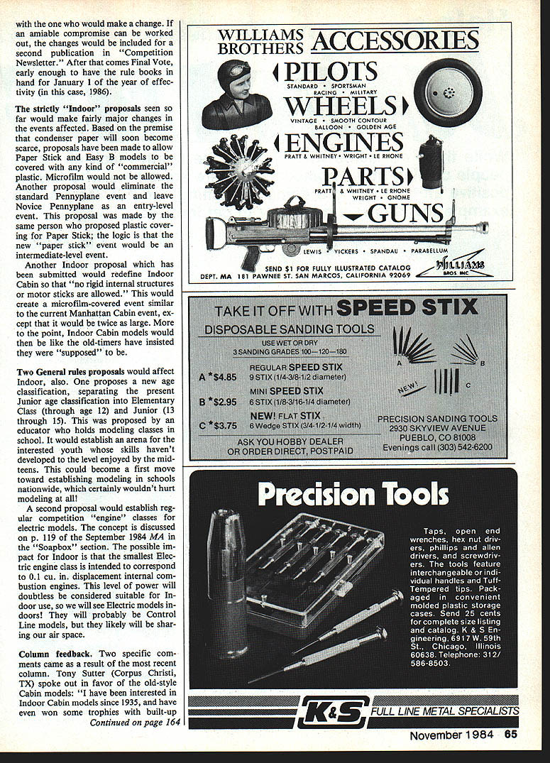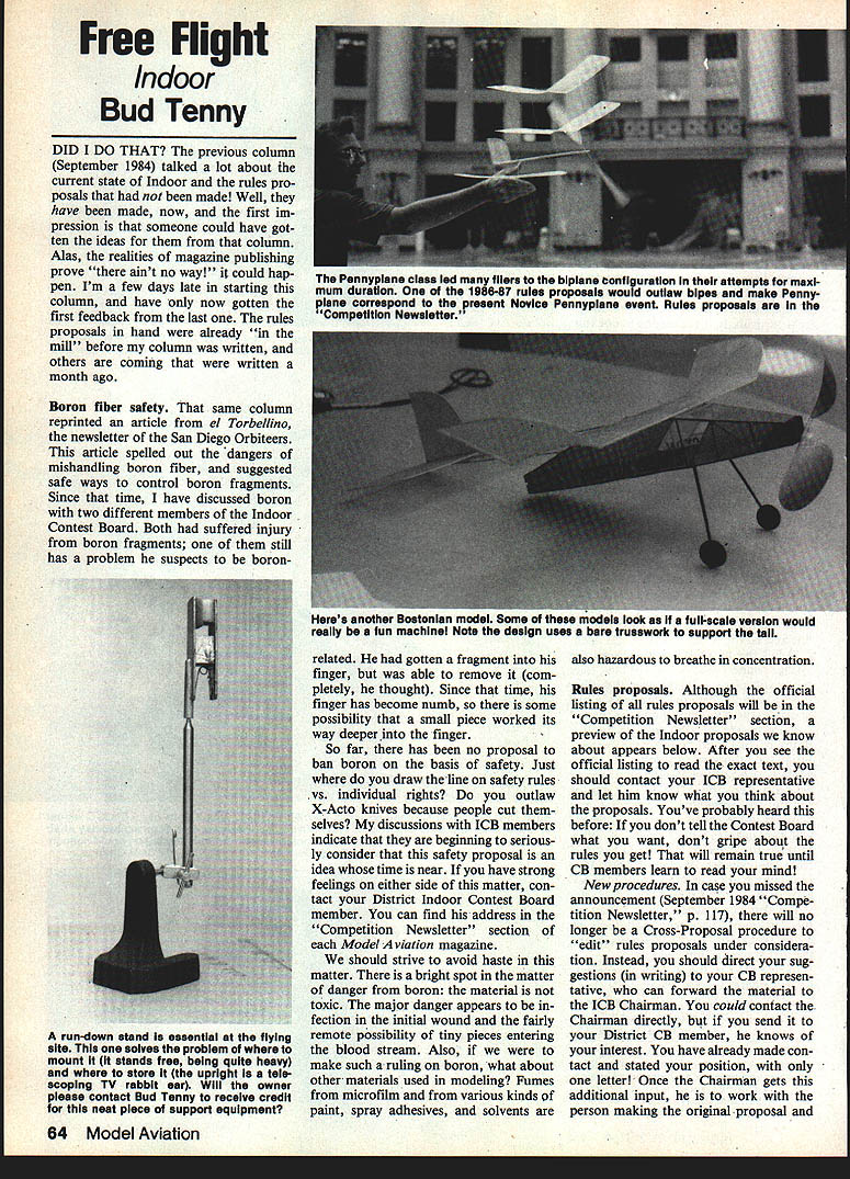 Free Flight Indoor Bud Tenny DID DO THAT previous column September 1984 talked lot about current state Indoor rules pro posals made Well have made now first im pression someone could have got ten ideas column Alas realities magazine publishing prove aint no way could hap pen Im few days late starting column have now gotten first feedback last rules proposals hand already mill before column written others coming written month ago Boron fiber safety same column reprinted article el Torbellino newsletter San Diego Orbiteers article spelled out dangers mishandling boron fiber suggested safe ways control boron fragments Since time have discussed boron two different members Indoor Contest Board Both suffered injury boron fragments still has problem suspects boronA run-down stand essential flying site solves problem mount it stands free being quite heavy store upright tele scoping TV rabbit ear Will owner please contact Bud Tenny receive credit neat piece support equipment related gotten fragment finger able remove com pletely thought Since time finger has become numb some possibility small piece worked its way deeper finger So far has no proposal ban boron basis safety Just draw theline safety rules vs individual rights outlaw X-Acto knives because people cut selves discussions 1GB members indicate beginning serious ly consider safety proposal idea time near have strong feelings either side matter con tact District Indoor Contest Board member can find address Competition Newsletter section Model Aviation magazine should strive avoid haste matter bright spot matter danger boron material toxic major danger appears fection initial wound fairly remote possibility tiny pieces entering blood stream Also make such ruling boron what about other materials used modeling Fumes microfilm various kinds paint spray adhesives solvents Rules proposals Although official listing rules proposals will Competition Newsletter section preview Indoor proposals know about appears below After see official listing read exact text should contact 1GB representative let him know what think about proposals Youve probably heard before dont tell Contest Board what want dont gripe about rules get will remain true until GB members learn read mind New procedures case missed announcement September 1984 Compe tition Newsletter p 117 will no longer Gross-Proposal procedure edit rules proposals under considera tion Instead should direct sug gestions writing GB represen tative can forward material 1GB Chairman could cont act Chairman directly send District GB member knows interest have already made con tact stated position letter Once Chairman gets additional input work person making original proposal 64 Model Aviation Pen nypiane class led fliers biplane Configuration attempts maxi mum duration 1986-87 rules proposals would outiaw bipes make Pennyplane correspond present Novice Pennypiane event Rules proposals Competition Newsletter Heres another Bostonian model Some models look full-scale version would really fun machind Note design uses bare trusswork support tall also hazardous breathe concentration would make change amiable compromise can worked out changes would included second publication Competition Newsletter After comes Final Vote early enough have rule books hand January 1 year effec tivity case 1986 strictly Indoor proposals seen far would make fairly major changes events affected Based premise condenser paper will soon become scarce proposals have made allow Paper Stick Easy B models covered kind commercial plastic Microfilm would allowed Another proposal would eliminate standard Pennyplane event leave Novice Pennyplane entry-level event proposal made same person proposed plastic cover ing Paper Stick logic new paper stick event would intermediate-level event Another Indoor proposal has submitted would redefine Indoor Cabin no rigid internal structures motor sticks allowed would create microfilm-covered event similar current Manhattan Cabin event ex cept would twice large point Indoor Cabin models would like old-timers have insisted supposed Two General rules proposals would affect Indoor also proposes new age classification separating present Junior age classification Elementary Class through age 12 Junior 13 through 15 proposed educator holds modeling classes school would establish arena interested youth skills havent developed level enjoyed midteens could become first move toward establishing modeling schools nationwide certainly wouldnt hurt modeling second proposal would establish reg ular competition engine classes electric models concept discussed p 119 September 1984 MA Soapbox section possible im pact Indoor smallest Elec tric engine class intended correspond 01 cu displacement internal com bustion engines level power will doubtless considered suitable door use will see Electric models doors will probably Control Line models likely will shar ing air space Column feedback Two specific com ments came result recent column Tony Sutter Corpus Christi TX spoke out favor old-style Cabin models have interested Indoor Cabin models since 1935 have won some trophies built-up Continued page 164 WILLIAMS ACCESSORIES BROTH ERS ________________ 4 PILOTS STANDARD TSMAN RACING TAR VINTAGE TH CONTOUR BALLOON EN AGE 4 ENGINES PRATT & WHITNEY HT HONE LARTS PRATT & WHITNEY HONE GNOME B November 1984 65 LEWISVICKERS DAU BELLUM SEND $1 FOR FULLY ILLUSTRATED CATALOGILLIAV3 DEPT MA 151 PAWNEE ST SAN MARCOS CALIFORNIA 92069 FULL LINE METAL SPECIALISTS Specifications Wing Area 1500 sq Span Weight 20-25 lbs Engine 20-37 Fuselage Formers/Planing Wing Foam 3/32 SheetingKit $4 flfl95 Stab Fin Solid Sheet Clear Canopy/All BalsaA Sea-u-OH Residents add 6 % tax Major Decals Included Send $1 00 oomplete catalogueFiipat C-130 8-29 also available IVHS BETA $2995 KuL R/C Mfg 706 Easton NE North Canton OH 44fl1 216-499-5323 FF IndoorlTenny Continued page 65 cross-section fuselages believe door Cabin event new high-tech materials would capable good ti