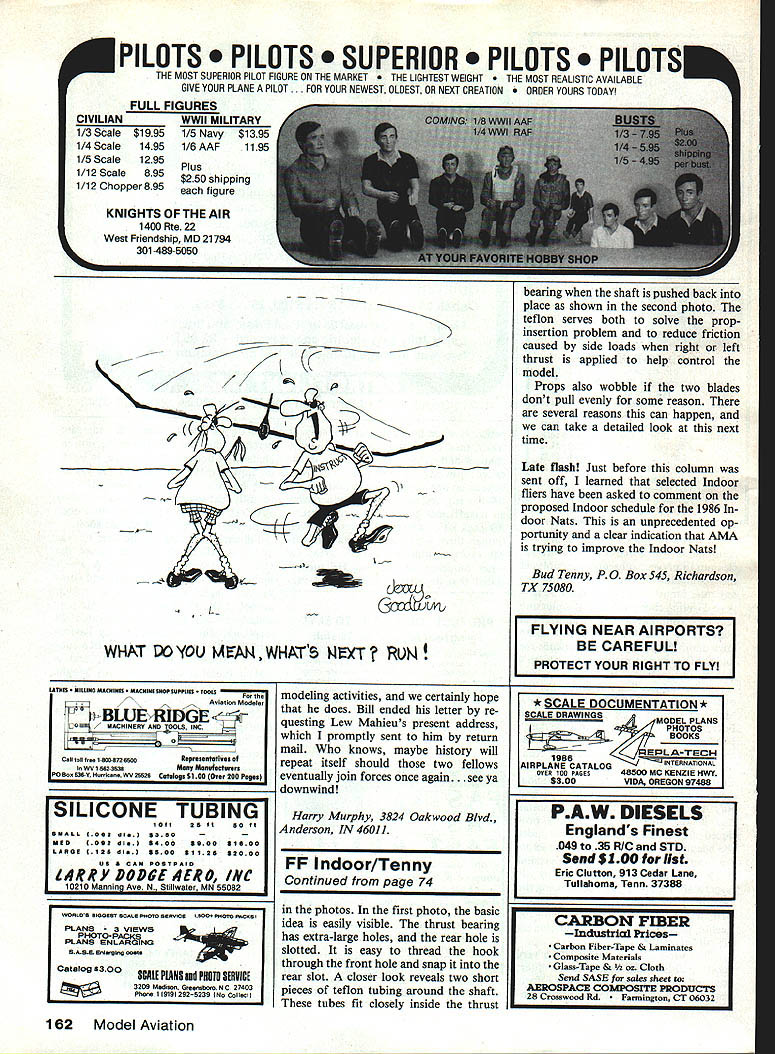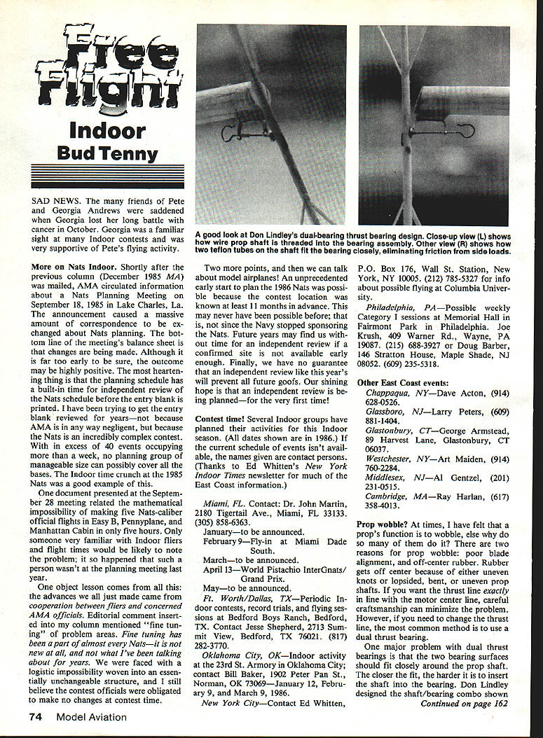 liz Indoor BudTenny SAD NEWS friends Pete Georgia Andrews saddened Georgia lost long battle cancer October Georgia familiar sight Indoor contests very supportive Petes flying activity Nats Indoor Shortly after previous column December 1985 MA mailed AMA circulated information about Nats Planning Meeting September 18 1985 Lake Charles La announcement caused massive amount correspondence ex changed about Nats planning bot tom line meetings balance sheet changes being made Although far too early sure outcome may highly positive hearten ing thing planning schedule has built-in time independent review Nats schedule before entry blank printed have trying get entry blank reviewed yearsnot because AMA way negligent because Nats incredibly complex contest excess 40 events occupying week no planning group manageable size can possibly cover bases Indoor time crunch 1985 Nats good example document presented Septem ber 28 meeting related mathematical impossibility making five Nats-caliber official flights Easy B Pennyplane Manhattan Cabin five hours Only someone very familiar Indoor fliers flight times would likely note problem happened such person wasnt planning meeting last year object lesson comes advances just made came cooperation between fliers concerned AMA officials Editorial comment insert ed column mentioned fine tun ing problem areas Fine tuning has apart almost Natsit new what Ive talking about years faced logistic impossibility woven essen tially unchangeable structure still believe contest officials obligated make no changes contest time Two points can talk about model airplanes An unprecedented early start plan 1986 Nats possi ble because contest location known least 11 months advance may never have possible before since Navy stopped sponsoring Nats Future years may find us out time independent review confirmed site available early enough Finally have no guarantee independent review like years will prevent future goofs shining hope independent review ing plannedfor very first time Contest time Several Indoor groups have planned activities Indoor season dates shown 1986 current schedule events isnt avail able names given contact persons Thanks Ed Whittens New York Indoor Times newsletter much East Coast information Miami FL Contact Dr John Martin 2180 Tigertail Ave Miami FL 33133 305 858-6363 Januaryto announced February 9Fly-in Miami Dade South Marchto announced April 13World Pistachio InterGnats Grand Prix Mayto announced Ft Worth/Dallas TXPeriodic door contests record trials flying ses sions Bedford Boys Ranch Bedford TX Contact Jesse Shepherd 2713 Sum mit View Bedford TX 76021 817 282-3770 Oklahoma City OKIndoor activity 23rd St Armory Oklahoma City contact Bill Baker 1902 Peter Pan St Norman OK 73069January 12 Febru ary 9 March 9 1986 New York CityContact Ed Whitten PO Box 176 Wall St Station New York NY 10005 212 785-5327 info about possible flying Columbia Univer sity Philadelphia PAPossible weekly Category sessions Memorial Hall Fairmont Park Philadelphia Joe Krush 409 Warner Rd Wayne PA 19087 215 688-3927 Doug Barber 146 Stratton House Maple Shade NJ 08052 609 235-5318 Other East Coast events Chappaqua NYDave 628-0526 Glassboro NJLarry 881-1404 Glastonbury CTGeorge Armstead 89 Harvest Lane Glastonbury CT 06037 Westchester 760-2284 Middlesex 231-0515 Cambridge 358-4013 Acton 914 Peters 609 NYArt Maiden 914 NJAl Gentzel 201 MARay Harlan 617 Prop wobble times have felt props function wobble else two reasons prop wobble poor blade alignment off-center rubber Rubber gets off center because either uneven knots lopsided bent uneven prop shafts want thrust line exactly line motor center line careful craftsmanship can minimize problem However need change thrust line common method use dual thrust bearing major problem dual thrust bearings two bearing surfaces should fit closely around prop shaft closer fit harder insert shaft bearing Don Lindley designed shaft/bearing combo shown Condnued page 162 74 Model Aviation good look Don Lindleys duaIbearing thrust bearing design ClOse-up view 1 shows wire prop shaft threaded bearing assembiy Other view R shows two tel ion tubes shaft fit bearing cioseiy eliminating friction side loads OTS TS RIOR TS T HE MOST SUPERIOR PILOT FIGURE ON THE MARKET LIGHTEST WEIGHT MOST REALISTIC AVAILABLE GIVE YOUR PLANE PILOT FOR YOUR NEWEST OLDEST OR NEXT CREATION R YOURS TODAY FULL FIGURES CIVILIANWWII MILITARY 1/3 Scale $19951/5 Navy $1395 1/4ScaIe14951/6AAF1195 1/5 Scale1295 Plus 1/12 Scale895$250 shipping 1/12 Chopper 895each figure KNIGHTS OF THE AIR 1400 Rte 22 West Friendship MD 21794 301-489-5050 LAThES ING MACNINES INE ShOP SUPPLIES TOOLI Ao etlon Modeler W} BLUE RIDGE / MACHINERY AN~9LS INC 0 c.o 8008720000RNpOOEESIIEEIIYNN ISV 552 3630MIEN0 MNNNPUCSUOrE P060 536-V Ho doon WV 25026 COONINgE $1 GO Over 200 PIpE p -Y _ / modeling activities certainly hope does Bill ended letter re questing Lew Mahieus present address promptly sent him return mail knows maybe history will repeat itself should two fellows eventually join forces once again. ya Harry Murphy 3824 Oakwood Blvd Anderson IN 46011 FF Indoor/Tenny Continued page 74 photos first photo basic idea easily visible thrust bearing has extra-large holes rear hole slotted easy thread hook through front hole snap rear slot closer look reveals two short pieces teflon tubing around shaft tubes fit closely inside thrust bearing shaft pushed back place shown second photo teflon serves both solve propinsertion problem reduce friction caused side loads right left thrust applied help control model Props also wobble two blades dont pull evenly some reason several reasons can happen can take detailed look next time Late flash Just before column sent off learned selected Indoor fliers have asked comment proposed Indoor schedule 1986 door Nats unprecedented op portunity clear indication AMA trying improve Indoor Nats Bud Tenny PO Box 54S Richardson TX 7S080 FLYING NEAR AIRPORTS BE CAREFUL PROTECT YOUR RIGHT TO FLY PUAW 