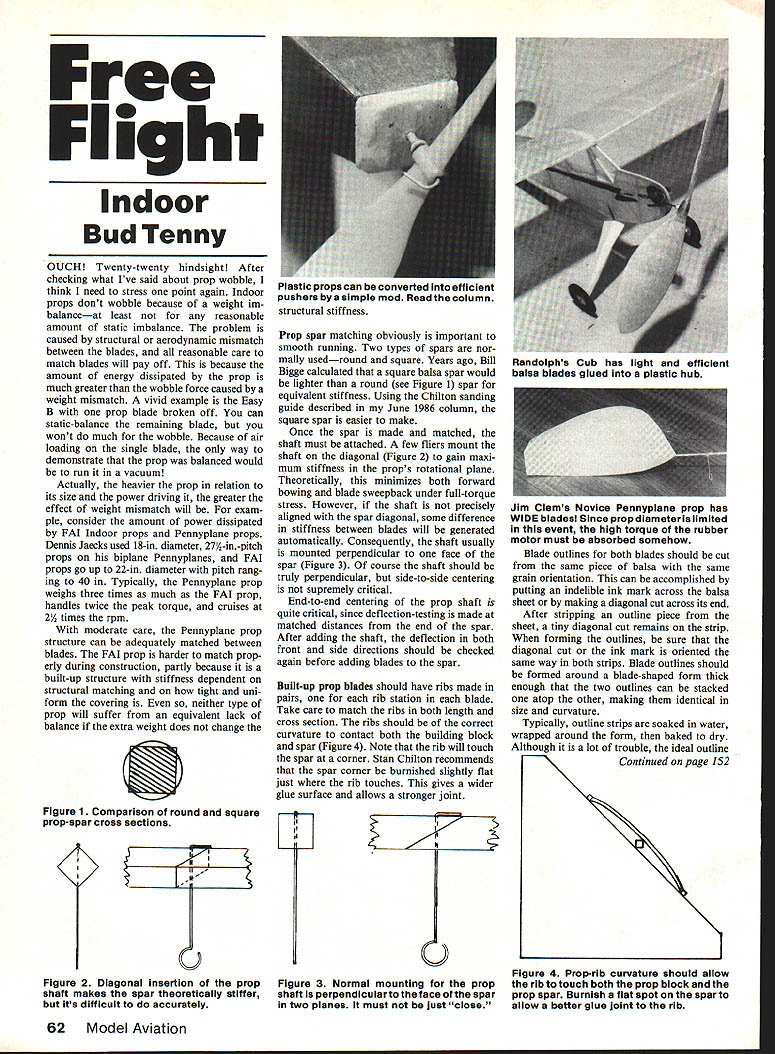 Free Flight Indoor Bud Tenny OUCH Twenty-twenty hindsight After checking what Ive said about prop wobble think need stress point again Indoor props dont wobble because weight im balanceat least reasonable amount static imbalance problem caused structural aerodynamic mismatch between blades reasonable care match blades will pay off because amount energy dissipated prop much greater wobble force caused weight mismatch vivid example Easy B prop blade broken off can static-balance remaining blade wont much wobble Because air loading single blade way demonstrate prop balanced would run vacuum Actually heavier prop relation its size power driving greater effect weight mismatch will exam pie consider amount power dissipated FAI Indoor props Pennyplane props Dennis Jaecks used 18-in diameter 27A-in-pitch props biplane Pennyplanes FAI props go up 22-in diameter pitch rang ing 40 Typically Pennyplane prop weighs three times much FAI prop handles twice peak torque cruises 24 times rpm moderate care Pennyplane prop structure can adequately matched between blades FAI prop harder match prop erly during construction partly because built-up structure stiffness dependent structural matching tight uni form covering neither type prop will suffer equivalent lack balance extra weight does change S Figure 1 Comparison round square prop-spar cross sections 0 Figure 2 Diagonal insertion prop shaft makes spar theoretically stiffer its difficult accurately Prop spar matching obviously important smooth running Two types spars nor mally usedround square Years ago Bill Bigge calculated square balsa spar would lighter round see Figure 1 spar equivalent stiffness Using Chilton sanding guide described June 1986 column square spar easier make Once spar made matched shaft must attached few fliers mount shaft diagonal Figure 2 gain maxi mum stiffness props rotational plane Theoretically minimizes both forward bowing blade sweepback under full-torque stress However shaft precisely aligned spar diagonal some difference stiffness between blades will generated automatically Consequently shaft usually mounted perpendicular face spar Figure 3 course shaft should truly perpendicular side-to-side centering supremely critical End-to-end centering prop shaft quite critical since deflection-testing made matched distances end spar After adding shaft deflection both front side directions should checked again before adding blades spar Built-up prop blades should have ribs made pairs rib station blade Take care match ribs both length cross section ribs should correct curvature contact both building block spar Figure 4 Note rib will touch spar corner Stan Chilton recommends spar corner burnished slightly flat just rib touches gives wider glue surface allows stronger joint ri-i II L1 6 Figure 3 Normal mounting prop shaft perpendicular face spar two planes must just close Jim Clems Novice Pennyplane prop has WIDE blades Since prop diameter limited event high torque rubber motor must absorbed somehow Blade outlines both blades should cut same piece balsa same grain orientation can accomplished putting indelible ink mark across balsa sheet making diagonal cut across its end After stripping outline piece sheet tiny diagonal cut remains strip forming outlines sure diagonal cut ink mark oriented same way both strips Blade outlines should formed around blade-shaped form thick enough two outlines can stacked atop other making identical size curvature Typically outline strips soaked water wrapped around form baked dry Although lot trouble ideal outline Continued page 152 Figure 4 Prop-rIb curvature should allow rib touch both prop block prop spar Burnish flat spot spar allow better glue joint rib 62 Model Aviation Plastic props can converted efficient pushers simple mod Read column structural stiffness Randolphs Cub has light efficient balsa blades glued plastic hub FF Duration/Murphy Continued page 149 have suddenly appeared everywhere again being listed $695but sale $591 mechanism seems somewhat smaller version last saw shelves however spring very strong can rigged up used fuel shutoff very satisfactorily wont attempt explain pet apparatus design harness mechanisms fuel shut-off use seems nearly Gas flier has own patented device conversion no means unique have something little different surefire functional would certainly interested relaying design readers Well its about time disappear two months well So see ya downwind Harry Murphy 3824 Oakwood Blvd Ander son IN 46011 FF Indoor/Tenny Continued page 62 form twisted like prop blade will fit flat prop block Thus out line formed already properly curved twisted done outline should fitted block during construction moistened relieve stress twisting glued ribs spar after drying Note outline moistened after being tached ribs spar wood will ex pand stress whole structure Prop covering Prop blades should covered prop block possible Otherwise water saliva used adhesive cover trim prop return prop block until moisture has evaporated Also prop covered prop block film must slack enough blade lie film distortion blade twist - can changed during covering film will too tight let blade resume normal twist stress Another important tactic sure film attached both outline ribs accomplishes three things First mois ture used adhesive entire blade ex pands evenly minimizing stress Second individual panels film small enough stiffen blade Finally damage film single section wont spread other sections Dont worry about wrinkles appear blades dry out simple operation will remove Use very fine artist brush moistened water work out wrinkles Stroke brush along wrinkle will pull up level film around After wrinkles treated let whole assembly dry again Finally store prop holder keeps blades touching anything Prop InnovatIons number different plastic props available photos shows convert efficient pusher operation Peanut Scale models free wheeling ratchet front trimmed flat make bearing surface shaft pro jected through hub bent over 