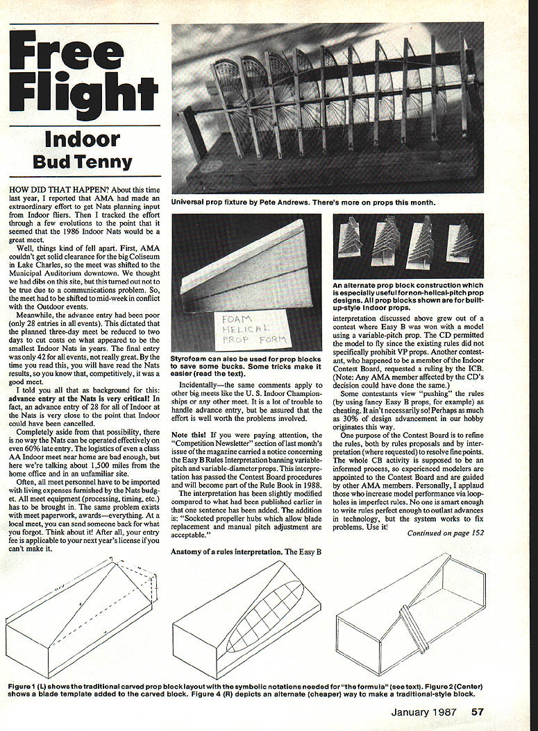 Free Flight Indoor BudTenny HOW DID THAT HAPPEN About time last year reported AMA made extraordinary effort get Nats planning input Indoor fliers tracked effort through few evolutions point seemed 1986 Indoor Nats would great meet Well things kind fell apart First AMA couldnt get solid clearance big Coliseum Lake Charles meet shifted Municipal Auditorium downtown thought dibs site turned out true due communications problem So meet shifted mid-week conflict Outdoor events Meanwhile advance entry poor 28 entries events dictated planned three-day meet reduced two days cut costs what appeared smallest Indoor Nats years final entry 42 events really great time read will have read Nats results know competitively good meet told background advance entry Nats very critical fact advance entry 28 Indoor Nats very close point Indoor could have cancelled Completely aside possibility no way Nats can operated effectively 60% late entry logistics class AA Indoor meet near home bad enough talking about 1500 miles home office unfamiliar site Often meet personnel have imported living expenses furnished Nats budg et meet equipment processing timing etc has brought same problem exists meet paperwork awardseverything local meet can send someone back what forgot Think about After entry fee applicable next years license cant make / Styrofoam can also used prop blocks save some bucks Some tricks make easier read text Incidentallythe same comments apply other big meets like U S Indoor Champion ships other meet lot trouble handle advance entry assured effort well worth problems involved Note paying attention Competition Newsletter section last months issue magazine carried notice concerning Easy B Rules Interpretation banning variablepitch variable-diameter props interpre tation has passed Contest Board procedures will become part Rule Book 1988 interpretation has slightly modified compared what published earlier sentence has added addition Socketed propeller hubs allow blade replacement manual pitch adjustment acceptable Anatomy rules interpretation Easy B An alternate prop blOck construction wnicn especially usefulfor non-helical-pitch prop designs prop blocks shown builtup-style Indoor props interpretation discussed above grew out contest Easy B won model using variable-pitch prop CD permitted model fly since existing rules did specifically prohibit VP props Another contest ant happened member Indoor Contest Board requested ruling ICB Note Any AMA member affected CDs decision could have done same Some contestants view pushing rules using fancy Easy B props example cheating aint necessarily Perhaps much 30% design advancement hobby originates way purpose Contest Board refine rules both rules proposals inter pretation requested resolve fine points whole CB activity supposed informed process experienced modelers appointed Contest Board guided other AMA members Personally applaud increase model performance via loop holes imperfect rules No smart enough write rules perfect enough outlast advances technology system works fix problems Use Continued page 152 / / / 7 7 Figure 1L showsthetraditional carved prop block layoutwith symbolic notations needed formula seetext Figure 2 Center shows blade template added carved block Figure 4 R depicts alternate cheaper way make traditional-style block January 1987 57 Universal prop fixture Pete Andrews Theres props month BENTOM BROWN JR CAMPBELL EASY COVERITE COX DUBRO BUILT MODELS- ENYA FAI FLYLIN FOX- GOLDBERG- GOLDEN AGE REPRO GENE DUBOIS GUILLOW- K&B K&S L R MRC OS MAX PACTRA PECK-POLYMER PERFECT R N MODELS- SEAGLEN SIG ISTERLING SULLIVAN SUPER TIGRE TAFFINDER TELCO TOP FLITE TREXLER WILLIAMS & OTHERS ESTES MODEL ROCKETSI illustrations over 700 Kits choose IMAILORDER PHONEORDER IN STOREI 11111 VALLEY HOBBY CENTER 327 W Main St LansdaIuPa 19446 RUBBER Sizes 1/4 3/16 1/8 3/32 1/16 042 thick pound box Price $1300 includes 4 oz Slick Lube Price $1200 no lube Slick costs $1 75 Postpaid US Via UPS Cal add 6% tax SMALL BOX 1/4 lb rubber $450 size Orders up $1500 1/4 lb rubber ndse. add $150 UPS Over$15 add 10% MEW e mba classIcs P30 DroPS Air Expross Mini-Pout CrickEt bulks Front i assumbln SPrig kits Stardustor Satellites winders hardware looks morn ZONA SAWS famous Itne hobby saws Razor #200 $255 Newsletters/Winter Continued page 149 taken painsand leaves pains reader nuts bolts what newsletter editor doing youor what might doing club Think about Words have wings too know did Homer call winged words because go through air FF Indoor/Tenny Continued page 57 Prop blocks Figure 1 shows sketch traditional block used build Indoor props typically carved balsa block andthepitch props built block fixed once block carved built-up block shown previous column can constructed kind pitch distribution either uniform varying pitch across blade However carved block has uniform pitch distribution defined block dimensions according formula below formula defines what called true pitch helical pitch reasoning behind use non-helical pitch distribution usually concerns blade loading blade flare assumed inefficiencies slow-turning props very high blade angles formula Pitch x D xT/W formula D diameter W k width T block thickness Figure 1 block length shown D/2 block obviously can longer planned prop case multiply block length two use D formula starting carve block mark guide lines X Y block work very carefully final block surface must flat exactly line guidelines Warning once use sanding block finish up grit sandpaper can remain embedded surface can damage carving blade decide carve have block carved transfer blade template block shown Figure 2 Some builders glue small blocks outside template hold blade outline place during construction Instead small temporary strips can pinned place removed after both blades have built leaves block clear blade covered right block prop covered block freshly-covered blade should returned block cure out before covering second blade Similarly after repairs recovering return b