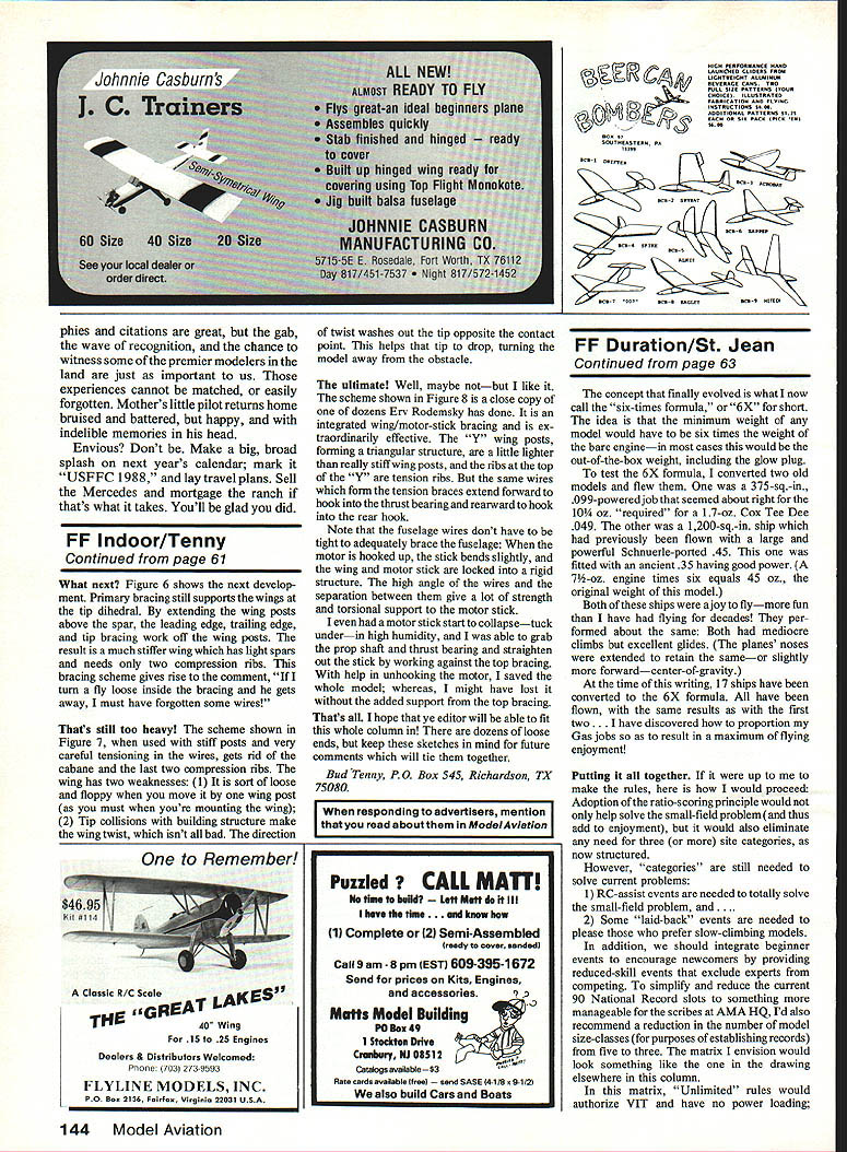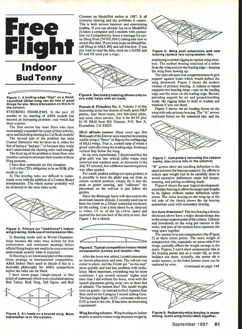 Free Flight Indoor Bud Tenny Figure 1 trailing-edge flap HandLaunched Glider wing can lots good things discussion column STEERING PROBLEMS past 18 months steering AMA models has become increasing problemone has three sources first source has fliers have increasingly expanded scope activity up including steering La Cal Scale models second part problem has Contest Directors let either fear being bad guy because really dont understand steering rules well enough third leg problem fliers stood muttered under breaths filing protests have four comments situation 1 CDs obligation SOB ifhe needs 2 steering rules difficult under stand addition Contest Board interpretation whole matter probably will reviewed next rules cycle Figure 2 PrImary traditional Indoor wing bracing Note useof compression ribs 3 Steering works well World Champion ships because rules written environment contestant meetings before official flying begins used sure everyone understands exactly what expected 4 Steering intentional part compe tition strategy international competition AMA Indoor fliers need decide desirable philosophy AMA competition before rules can fixed have seven pages single-spaced fine print comments circulated among Bud Tenny Rick Doig Del Ogren Bob B 4 Al 4 Figure 3 Air loads braced wing explanation column Clemens ModelNet earlier 1987 concerns steering problems causes both serious business entertalning reading can already log ModelNet takes computer modem cQnnec tion via CompuServe leave message sys op Doug Pratt 767033041 asking him access data want get ModelNet call Doug AMA HQ ask him just want read data send SASE $1 Ill send copy Figure4 Secondarybracingshownonlyon side helps air loads Peanuts & Pistachios No 2 Volume 2 interesting series has dozens really great P&P photos four three-views two full-sized plans some short articles Get $495 plus $150 P&H Bill Hannan PO Box Escondido CA 92025 HLG altitude control years ago Hal Blubaugh Denver area reported interesting results using fence flap tralling edge HLG wings small strip wood glued vertically along trailing edge forming vertical flap below wing own experiments discovered glide path less critical after warps removed washout used discussed July87 column adifferentlaunchtrajectory often needed small peaked ceilings open girders possible have glider pop out almost vertical position simply fly peak girder opening calibrate placement roll-out just below girders Since Blubaugh fence will also restrict maximum launch altitude recently used limit climb Glider somewhat too heavy ceiling ran strip about Y64-in deep out within 1 tip 14-in span tapered last inch strip zero See Figure 1 sketch Figure 5 Typical competition Indoor model compression Lower tension ribs After fence added could concentrate launch placement trim roll-out easier place Glider got step quickly less problem turbu lence important everything far consistent got several seconds higher total time did fence launch placement giving away two three feet altitude bottom line model weighs over six gramsin contrast 24 grams Stan Stoy used Category record-setting Coot best single flight027contrasts over 035 best site has interesting experiment Wing bracing schemes Wing bracing Indoor models used reduce wing structure weight Figure 6 Wing post extensions new bracing replace two compression ribs employing external rigging replace wing struc tore earliest bracing consisted tether wing posts leading edgekeeping wing bowing up next advance superstructure give support agalnst loads would deflect wing downward Figure 2 shows modern version primary bracing cabane bipod supports two bracing loopsone leading edge other trailing edge Besides providing support alr ground-handling loads rigging helps hold washin washout use Figure 3 shows air loading forces wing primary bracing arrows represent forces unbraced tips Figure 7 Completely removing cabane works also info column B arrows show resulting deflection spars between bracing supports So efforts reduce spar weight carefully done avoid excessive deflections under full torque steering ceiling-scrubbing loads Figure 4 shows next logical development secondary bracing allow major spar lengths lighter undue deflection under stress extra bracing wing tip left side sketch shows tip bracing sometimes used secondary bracing Are drawbacks two bracing schemes discussed above have major disadvantage due center support point cabane Uploads downloads wing put tension wires part tension force squeezes wing spars together answer use compression ribs Figure 5 stress points extra weight compression ribs especially extra-wide FAI wings partially offsets weight savings spars Figures 2 4 show compression ribs bracing points center rib builders use Actually center rib under tension balsa bottom piece can replaced wire Continued page 144 Figure 8 Rodemsky-style bracing superstrong locks wing/motor-stick together September 1987 61 BICO PERFORMANCE 0*00 t*uNCBEII CLIORAS FROM FULL SIZE PATTERNS TOUR CHOICEI ICLUSTRATRO EACH OR SIX PACK PICK OMI SOUTORASTERO PA B BOUGHTRUB4 BITECI phies citations great gab wave recognition chance witness some premier modelers land just important us experiences cannot matched easily forgotten Mothers little pilot returns home bruised battered happy indelible memories head Envious Dont Make big broad splash next years calendar mark USFFC 1988 lay travel plans Sell Mercedes mortgage ranch thats what takes Youll glad did FF Indoor/Tenny Continued page 61 What next Figure 6 shows next develop ment Primary bracing still supports wings tip dihedral extending wing posts above spar leading edge trailing edge tip bracing work off wing posts result much stiffer wing has light spars needs two compression ribs bracing scheme gives rise comment turn fly loose inside bracing gets away must have forgotten some wires Thats still too heavy scheme shown Figure 7 used stiff posts very careful tensioning wires gets rid cabane last two compression ribs wing has two weaknesses 