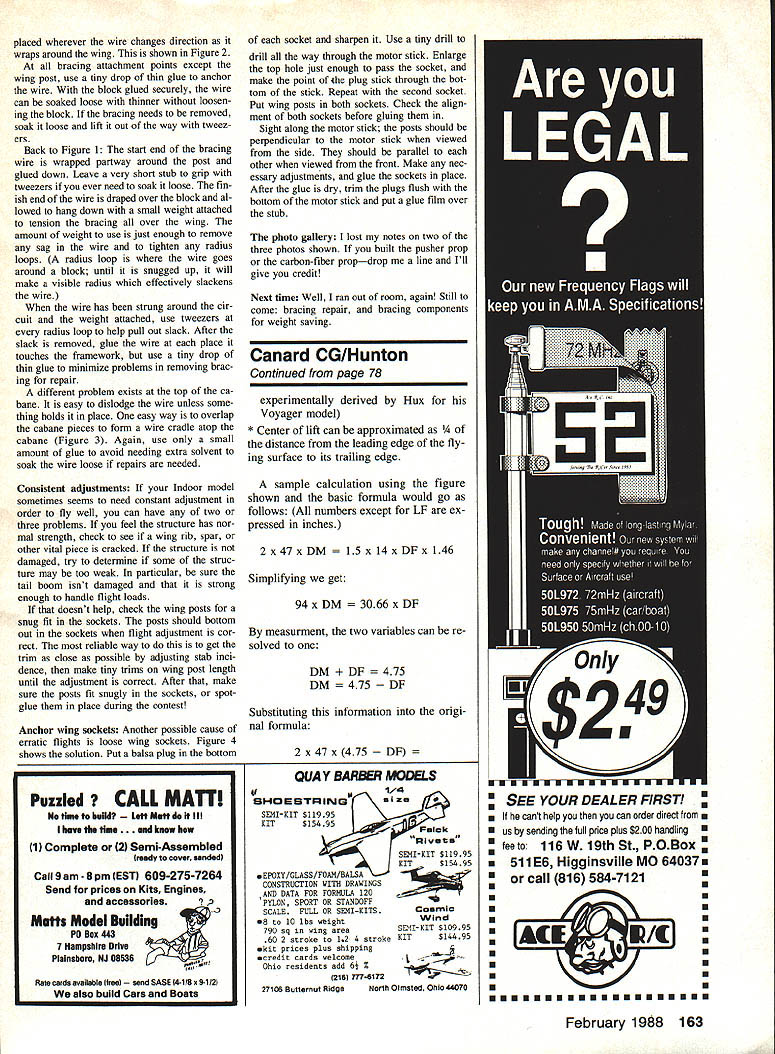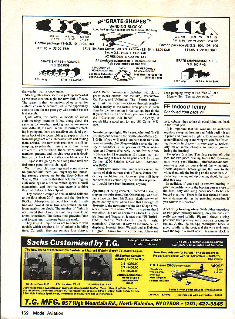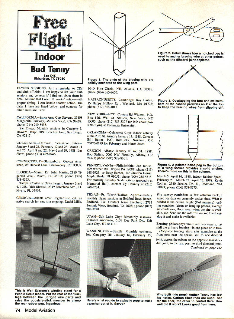 FLYING SESSIONS Just reminder CDs club officials am happy list club sessions contests find Out about time Assume need 11 weeks noticewith proper timing can handle shorter notice dates have listed below contacts other areas listed CALIFORNIASanta Ana Curt Stevens 25108 Marguerite Parkway Mission Viejo CA 92692 phone 714 240-8433 San Diego Monthly sessions Category Howard Haupt 3860 Ecochee Ave San Diego CA 92117 COLORADODenver Tentative dates January 8 22 February 12 26 March 11 25 April 8 22 May 6 20 1988 Les Shaw phone 303 499-0946 CONNECTICUTGlastonbury George Armstead 89 Harvest Lane Glastonbury CT 06037 FLORIDAMiami Dr John Martin 2180 Ti gertail Ave Miami FL 33133 phone 305 858-6363 Tampa Contest Delta hangar January 3 4 1988 Dick Obarski 2349 Barcelona Ave Ft Myers FL 33905 GEORGIAAtlanta area Regular site lost active search new site ongoing David Mills Figure 1 ends bracing wire solidly anchored wing post 10-D Pine Circle NE Atlanta GA 30305 phone 404 365-8655 MASSACHUSETTSCambridge Ray Harlan 15 Happy Hollow Rd Wayland MA 01778 phone 617 358-4013 NEW YORKNYC Contact Ed Whitten PO Box 176 Wall St Station New York NY 10005 phone 212 785-5327 info about pos sible flying Columbia University OKLAHOMAOklahoma City Indoor activity 23rd St Armory January 17 1988 Contact Bill Baker PO Box 249 Norman OK 73070-0249 for February March dates OREGONAlbany January 10 31 1988 Bob Stalick 5066 NW Picadilly Albany OR 97321 phone 503 928-8101 PENNSYLVANIAPhiladelphia Joe Krush 409 Warner Rd Wayne PA 19087 phone 215 688-3927 or Doug Barber 146 Stratton House Maple Shade NJ 08052 phone 609 235-5318 monthly Saturday Scale activity probably Memorial Hall contact Cy Hanzely 215 948-3214 TEXASFt Worth/Dallas Approximately monthly flying sessions Bedford Boys Ranch Bedford TX Contact Jesse Shepherd 2713 Summit View Bedford TX 76021 phone 817 282-3770 UTAHSalt Lake City Bimonthly sessions Franklin Anderson 6137 Dee Park Dr Salt Lake City UT 84118 WASHINGTONSeattle Monthly contests low Category III January 16 February 13 Figure 2 Detail shows notched peg used anchor bracing wire other points such dihedral joint depicted Figure 3 Overiapping fore aft mem bers cabane provides X top keep bracIng wires slipping off Figure 4 pointed balsa peg bottom wing socket provides solid anchor Theres column March 5 April 16 1988 Indoor Rubber Speed February 23 March 22 April 26 1988 Kevin Collins 2320 Sahalee Dr E Redmond WA 98023 phone 206 868-8273 Site survey reminder few columns back asked data currently active sites What needed ceiling height FAT measure ceil ing condition clean hang-up prone average air conditions floor area site avail able etc Send information will cat alog make available Bracing philosophy two ways stall primary bracingin piece two One-piece bracing starts example front post near socket out dihedral joint across cabane opposite rear dihe dral joint rear post third dihedral joint Continued page 162 74 Model Aviation Free Flight Indoor Bud Tenny Box 545 Richardson TX 75080 Wait Eversons winding stand Peanut Scale model Put rear fuse lage between upright wire parts raise popsicie-stick member clamp rear rubber peg ingenious Heres what plastic prop make pusher out Savvy built prop Author Tenny has lost notes Carbon fiber rods used spar other control flare well did work Looks good GRATESHApEsrM SANDING BLOCKS Long lasting silicon Carbide grit sides 10 Long GS 101GS 102GS 103 1/4 & 3/81/2 & 5/83/4 & 1 IJ Combo package #1-GS 101 102 103 $1195 S&HSAVE Six Pack Combo GSa above $2195 S&H Single GS $495 S&H AZ RESIDENTS ADD 5% TAX products guaranteed ers invIted Ask hobby dealer first SENO CHECK OR*A MASTER CHARGE MONEY ORDER TOOR VISA ACCEPTED Sell Rock Industries Hwy 179-Suite 105 Sedona AZ 86336 jj602 254-1805 GRATE-SHAPESTM ROUNDS GS 200 PKG 9 long$795 S&H GS 104OS 105GS 108 3/8 & 5/8 900 Vs w15/8 450 & 900 Combo package #2-GS 104 105 106 $1195 S&H GRATE-SHAPESTM SQUARES GS 300 PKG 9 long$495 S&H weather warms once again Meeting attendance seems pick up somewhat near election night new club officers reason nominations ourselves club office can declined opportunity exists vote poor guy couldnt make night Quite often collective moods winter club meetings seem follow along about same weather making motivation some what difficult times business meet ing going usually couple guys back room folding up paper airplanes pages old club newsletters tossing around new club president still tempting solve mystery re ceived 21 votes 17 members present club treasurer dood ling back half-dozen blank checks Egads Its going long time until feel some good thermal air again Well club meetings need some adrena lin pumped might try follow ing remedy cooked up Strat-O-Bats Seattle WA seems hold regular club meetings school sports small gymnasium current craze thing call Indoor Rubber Speed anchor couple helium-filled balloons floor about 20 ft apart idea ROG rubber-powered model start/finish line have make two laps around bal loons against clock number flights limited must assume have go home sometime fastest time provides fame fortune until someone beats mark keep simple compete models require lot valuable building time Currently running four classes AMA Racer commercial solid-sheet plastic props Sleek Streaks like Peanut/NoCal Scale Unlimited Seattle Series last five monthsOctober through April trophy fastest time posted class last session spring Just think club Cleveland could call Cleveland Air Races yway sounds like good test lOC Comet ME109 Newsletter spotlight Well sure Well just keep beam Seattle Strat-O-Bats S-O-Bs will illuminate fine club newsletterthe Bar Sheetwhich sports lux ury coeditors persons Chris Wein reich Dennis Weatherly sub pub $5/year 12 sometimes 11 issuesno mat ter long takes Send check Kevin Collins 2320 Sahalee Drive East Redmond WA 98053 must have missed issue carried names current club officers Either hiding out Anyway will have new club elections time printed would have incorrect anyway Speaking be