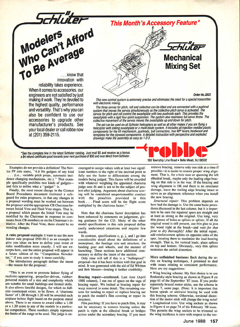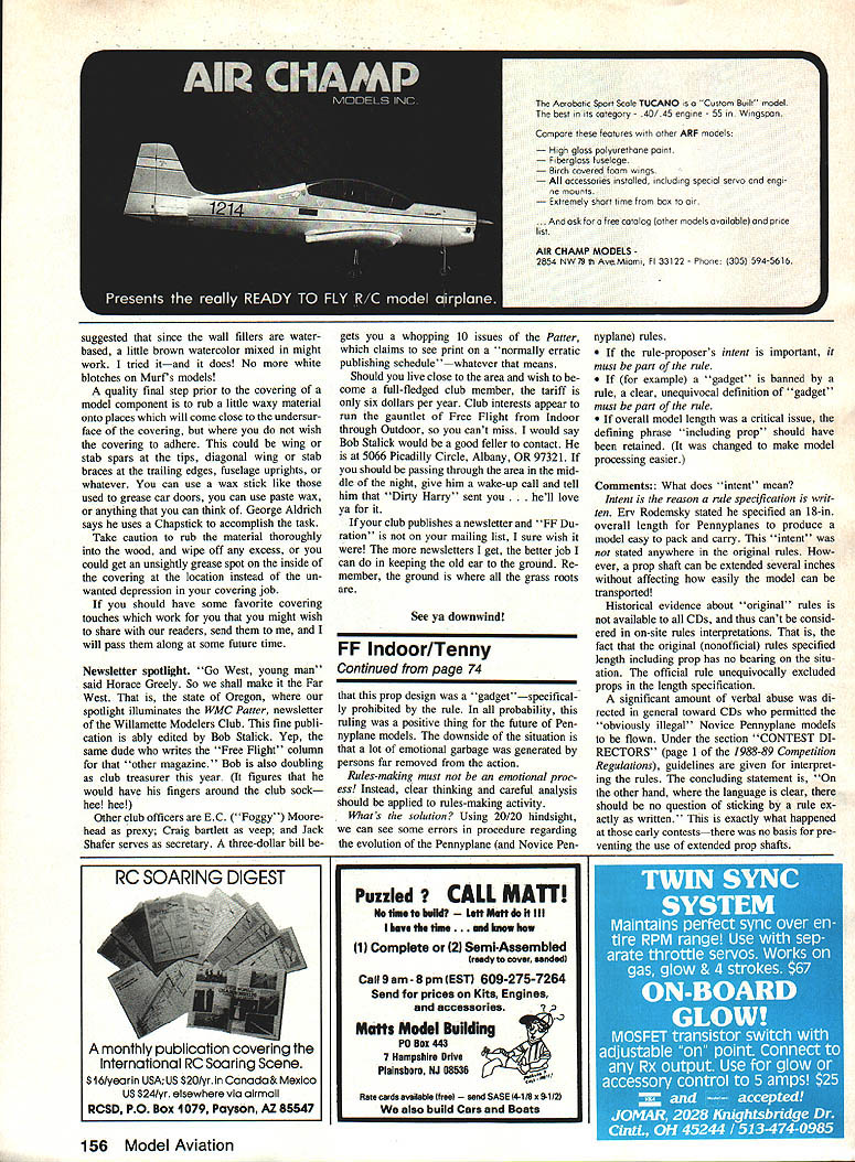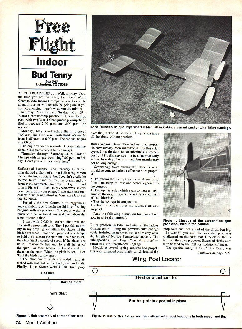 AS YOU READ THIS l anyway about time get issue Indoor World Champs/US Indoor Champs week will either about start will actually going attending heres what missing Saturday May 28 Sunday May 29 World Championship practice 700 am 200 pm two World Championship competition flights between 200 pm 800 pm no rounds Monday May 30Practice flights between 700 am 1100 am flights #5 #6 1100am to6OOpm Thebanquetbegins 800 pm Tuesday WednesdayFlD Open Interna tional Meet same schedule Sunday Thursday through SaturdayUS Indoor Champs banquet beginning 700 pm Fri day Dont wish Unfinished business February 1988 col umn showed photo prop built using carbon rod hub structure couldnt credit source Keith Fulmer claimed design fered comments see sketch Figure 1 prop Photo 1 am guy owns car bon fiber prop photo have some suc cess design third Manhattan Cabin 87 Nats Probably best feature its ruggedness crashability Lincoln did lots ceiling banging no problems props weigh much conventional unit take about same assembly time start 0020-in carbon fiber rod Hot Stuff prop shaft put assem bly prop jig attach blades blades wood use small pieces scotch tape hold blades spar until pitch set Hot Stuff couple spots blades balsa remove tape Hot Stuff rest spar foam blades cut slot slip spar pitch set Hot Stuff blades spar flare control rods added next tached Hot Stuff blade spar shaft Finally use Scotch-Weld #1838 B/A Epoxy Hot Stuff on Fiber Wire Shaft Figure 1 Hub assembly carbon-fiber prop over junction rods junction takes abuse no problem Rules proposal time Two Indoor rules propos als have already submitted during rules cycle Since deadline submittals Septem ber 1 1988 may seem somewhat early action reality remaining four months may long enough Generating rules proposals what should done make effective rules propos al Brainstorm concept several interested fliers including least person opposed concept Develop trial rules seem meet maxi mum original goals satisfy maximum objections Test concept competition Refine original rules submit proposal Read following discussion ideas about write proposal Rules problem 1987 Activities Indoor Contest Board during previous rules-change cycle included acrimonious controversy over length Novice Pennyplane models rule specifies 18-in length excluding prop stated clear unequivocal language Models several spring contests propel lers extended prop shafts located prop over inch ahead thrust bearing So what ask extended prop challenged basis violated tent rules proposer Extended shafts banned ICB violation intent specific ruling Contest Board Continued page 156 o0 Steel aluminum bar n V Scribe poInts epoxied place V Figure 2 Use fixture assures uniform wing post iocations both modei jigs 74 Model Aviation Free Flight Indoor Bud Tenny Box 545 Richardson TX 75080 Keith Fuimers unique experimental Manhattan Cabin canard pusher lifting fuseiage Photo 1 Cioseup carbon-fiber-spar prop discussed column Wing Post Locator Aerobatic Sport Scale TUCANO isa Custom Built model best its category 40/45 engine 55 Wingspan Compare tnese features other ARF models High gloss polyurethane paint Fiberglass fuselage Birch covered foam wings accessories instailed including special servo engi ne mounts Extremely short time box air ask free catalog other models available price list AIR CHAMP MODELS 2854 NW7S th AvMiami Fl 33122- Phone 305 594-5616 suggested since wall fillers waterbased little brown watercolor mixed might work tried itand does No white blotches Murfs models quality final step prior covering model component rub little waxy material onto places will come close undersur face covering wish covering adhere could wing stab spars tips diagonal wing stab braces trailing edges fuselage uprights whatever can use wax stick like used grease car doors can use paste wax anything can think George Aldrich says uses Chapstick accomplish task Take caution rub material thoroughly wood wipe off excess could get unsightly grease spot inside covering location instead un wanted depression covering job should have some favorite covering touches work you might wish share readers send will pass along some future time Newsletter spotlight Go West young man said Horace Greely So shall make Far West state Oregon spotlight illuminates WMC Patter newsletter Willamette Modelers Club fine publi cation ably edited Bob Stalick Yep same dude writes Free Flight column other magazine Bob also doubling club treasurer year figures would have fingers around club sock hee hee Other club officers EC Foggy Moorehead prexy Craig bartlett veep Jack Shafer serves secretary three-dollar bill begets whopping 10 issues Patter claims see print normally erratic publishing schedule whatever means Should live close area wish come full-fledged club member tariff six dollars per year Club interests appear run gauntlet Free Flight Indoor through Outdoor cant miss would say Bob Stalick would good feller contact 5066 Picadilly Circle Albany OR 97321 should passing through area mid dle night give him wake-up call tell him Dirty Harry sent ll love ya club publishes newsletter FF Du ration mailing list sure wish newsletters get better job can keeping old ear ground Re member ground grass roots See ya downwind FF Indoor/Tenny Continued page 74 prop design gadget specifical ly prohibited rule probability ruling positive thing future Pen nyplane models downside situation lot emotional garbage generated persons far removed action Rules-making must emotional proc ess Instead clear thinking careful analysis should applied rules-making activity Whats solution Using 20/20 hindsight can see some errors procedure regarding evolution Pennyplane Novice Pennyplane rules rule-proposers intent important must part rule example gadget banned rule clear unequivocal definition gadget must part rule overall model length critical issue defining phrase including prop should have retained changed make model processing easier Comments: What does intent mean Intent reason rule spec