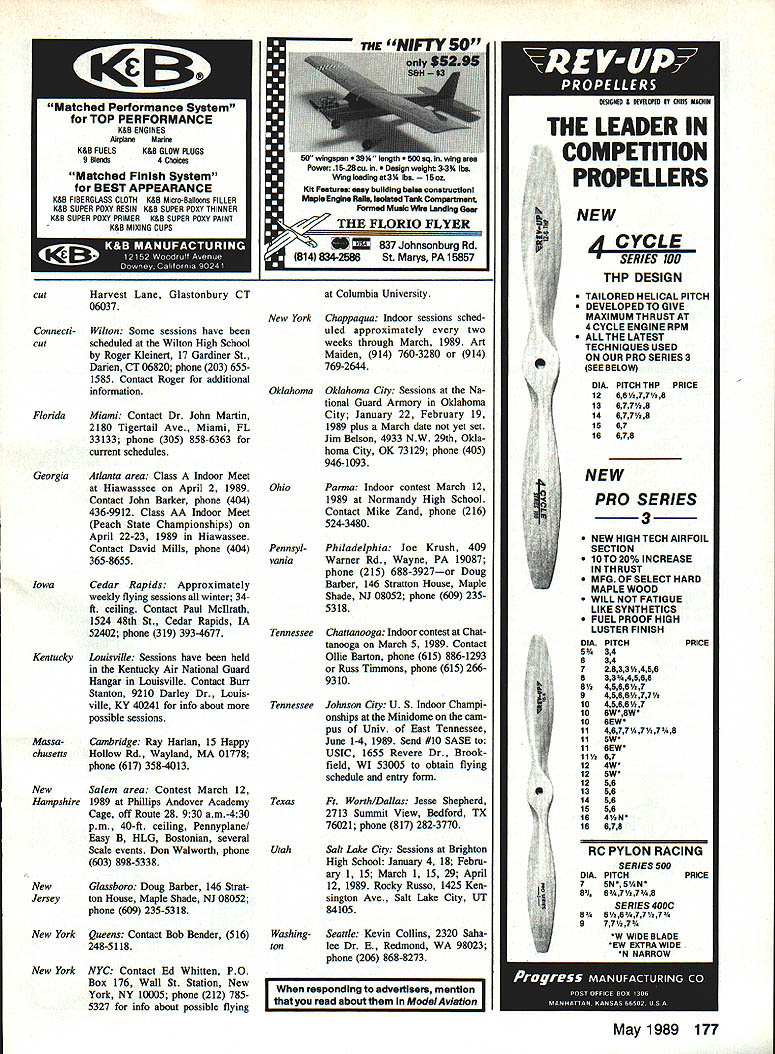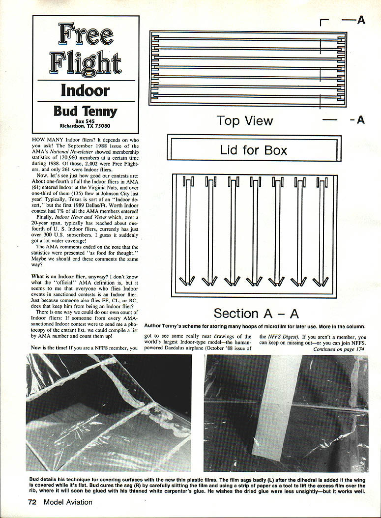 Free Flight Indoor Bud Tenny Box 545 RIchardson TX 75080 HOW MANY Indoor fliers depends ask September 1988 issue AMAs National Newsletter showed membership statistics 120960 members certain time during 1988 2002 Free Flight ers 261 Indoor fliers Now lets see just good contests About one-fourth Indoor fliers AMA 61 entered Indoor Virginia Nats over one-third 135 flew Johnson City last year Typically Texas sort Indoor de sert first 1989 Dallas/Ft Worth Indoor contest 7% AMA members entered Finally Indoor News Views over 20-year span typically has reached about onefourth U S Indoor fliers currently has just over 300 US subscribers guess suddenly got lot wider coverage AMA comments ended note statistics presented food thought Maybe should end comments same way What Indoor flier anyway dont know what official AMA definition seems everyone flies Indoor events sanctioned contests Indoor flier Just because someone also flies FF CL RC does keep him being Indoor flier way could own count Indoor fliers someone AMAsanctioned Indoor contest send pho tocopy entrant list could compile list AMA number count up Now time NFFS member F-A Top View -A Section or Tennys scheme storing hoops microfilm later use column got see some really neat drawings worlds largest Indoor-type modelthe humanpowered Daedalus airplane October 88 issue NFFS Digest arent member can keep missing outor can join NFFS Continued page 174 72 Model Aviation LLid Box11 0-00-0IhO0]000-00-0 *j \p details technique covering surfaces new thin plastic films film sags badly L after dihedral added wing covered its flat Bud cures sag R carefully slitting film using strip paper tool lift excess film over rib will soon giued thinned white carpenters glue wishes dried glue less unsightlybut works well 118-INCH3648 318-INCH3648 1181/808113/Sn 3182737 1/831161115318 n 1123041 11811413173/8 0 3/44460 1/80 3/81621 1/801/21724_____________________ 1/803/42533 3/18-INCH3048 3/18 3/181317 3/18 01/41419 3/18 3181621 3/16 ol/21825 3/16 0 3/42838 BALSA WOOD STICKS 1/16-INCH3640 1/1801/1808 1/1603/3207 1/181/80811 1/1631160913 1/16x1/41015 1/1603181317 1/181/21620 1/1803142128 3/32-INCH3648 1/4-INCH3848 3/32 3/320811 1/4 ii 1/41821 3/32 01/808131/403181825 3/3203/1610151/40 1/22129 3/32 0 1/413161/4 0 3143142 3/3203181419 3/320 1/21821 3/32 0 3142431 Double Balsa Wood Prices Spruce Basswood Sticks 5/18-INCH3848 5/18 ii 5/162027 5/1603/82230 5/18 o 1/22738 5/1603143952 1/2-INCH3640 1/201/23749 1/2 0 3149270 TRIANGULAR CUT BALSA 1/401/403624 3/8o3/8s3629 1/201/203637 3/4031403647 10103681 BALSA PLANKS 3/4s3036178 102036164 o3o36230 1 odo38303 202036230 203038329 204038484 3s3o38490 304038680 TAIBI BALSA SHEETS 1-INCH3648 1/18012736 3/32 0 13840 1/8013344 3/180 13749 1/4014157 3/8 0 15372 1/2018588 2-INCH3648 1/32023040 1/16023848 3/32 s 24154 1/8024880 3/18 s 25472 1/4028384 3/8s277103 1/302113150 3-INCH3848 1/32034053 1/16034358 3/32 0 35270 1/8036080 3/16037295 1/40384112 5/1603103134 3/803120160 1/203150200 4-INCH3648 1/32 0 46587 1/160473101 3/320482109 1/80495128 3/1604114151 1/404131193 3/804182271 1/2 04219320 BIRCH PLYWOOD 1/640120121751/40601274 1/64o12o243501/4o12o12146 1/640120407201/4012024293 1/6404004028001/4012048580 1/320606493/8012012180 1/32012012973/8o12o24360 1/32s 120241943/8o 12048720 1/320 12040388 _________________1/2 0 120 12202 1/16o6s124912o12o24405 1/16n12n1297l/2o12o48809 1/160 12024164 1/160 12040388 3/320601275 3/32120 12150 3/32 012024300 3/32 012 0 40608 1/80601282 1/8o12o12164 1/80 12024328 1/8012040656 3/16o6s1274 3/16o12012146 3/16 012024293 3/16 012048580 LITE PLYWOOD 1/801201258 1/80 12024112 1/8012040224 TAPERED TRAILING EDGE3648 1/80 1/22230 3/1603142940 1/40 14255 5/160 ir/s4461 3/8015272 Superior Aircraft Materials 12020-G Centralia iian Gardens California 90716 865-3220 Handling Charge-$500 $300 COD mum Order $2000 accept Personal Checks COD fornia Residents add 6% Sales Tax Consistently locked-up ie no auto surfac es model could Bob White has done years mount fuse stab trailing edge No lines no bending booms want use remote DT either fuse timer auto anything will have run some lines through boom solution route lines down center boom way line tension wont tend bend boom up down sideways last two models added t balsa bulkhead about three inches back inside big end boom small block scrap balsa added center 3/3 hole drilled through center ran piece Teflon tubing down through hole top boom just behind tube/boom joint tub ing makes gentle S-curve down through hole bulkhead DT line braided Da cron fishing line runs through tubing straight down center boom Plastic balsa No Im talking about old Aerogloss stuff red tube still make Ratlser Im talking about Rohacell Its rig id foam plastic material can used instead balsa modeling applications Former FlA World Champ Matt Gewain wife Gail run Composite Structures Technology sell Rohacell small quantities well some other high-tech modeling supplies Recently sent few samples play first glance material looks much like familiar pink blue extruded polystyrene foams used insulating houses Rohacell bright white feels much stiffer less spongy polystyrene foams fact compression modulus Rohacell about six times polystyrene close balsa Rohacell comes two densities thinner sheets 10 15 2mni 31 lb per cubic foot thicker stuff 3mm up 2 19 pcf European modelers have using Rohacell over 10 years now Two main construction techniques have developed system uses top bottom wing skins formed thin Rohacell spar inside skins formed jigs shaped match either upper lower airfoil curvature laminated epoxy-impregnated lightweight glass cloth both sides Rohacell skin way theres no need ribs other method involves carving sanding solid wing out thicker Rohacell adding spar covering both top bottom sur faces glass cloth Kevlar Theres very complete description latter method Heiko Rapp-Wurm National Free Flight Societys 1988 Symposium Rohacell can also used conven tional construction example thin Rohacell ribs capp