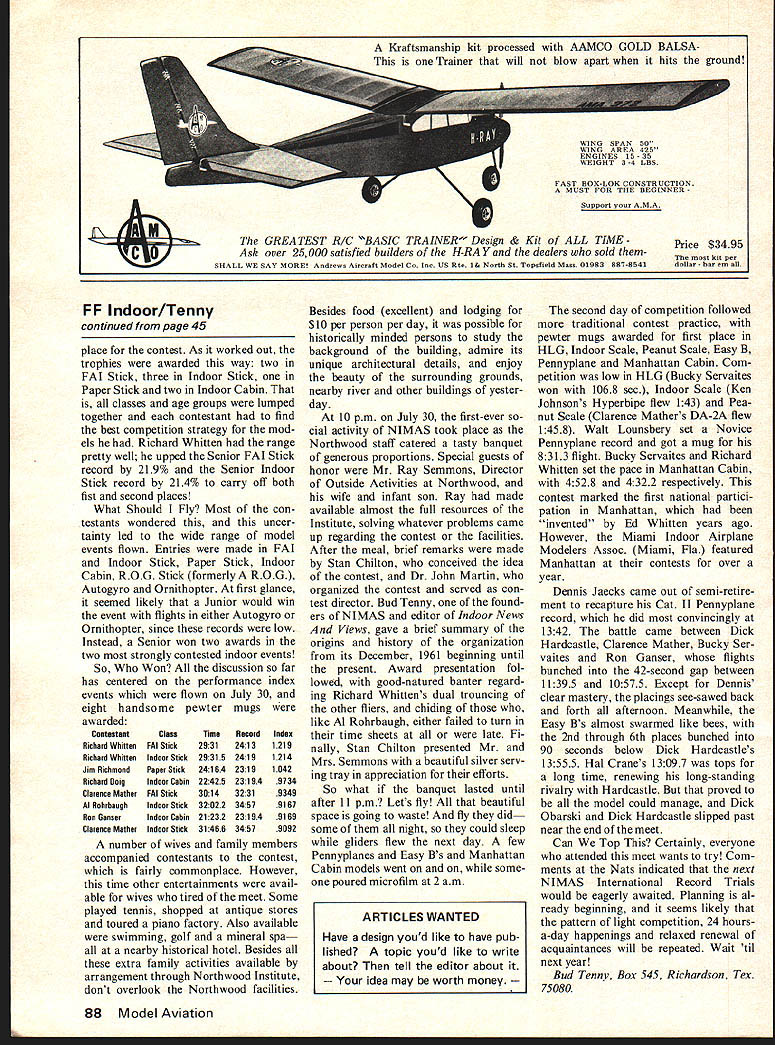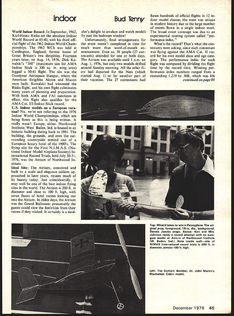 Indoor World Indoor Record September 1962 Karl-Heinz Rieke set absolute Indoor World Record 4540 third offi cial flight 1962 Indoor World Cham pionships 1962 WCh held Cardington England former home Great Britains two dirigibles Fourteen years later Aug 14 1976 Dick Ko walskis 300 maximum size AMA Indoor Stick 300 sq wing area logged 504 1 flight site Goodyear Aerospace Hangar American dirigibles Akron Macon built Kowalski witnessed Rieke flight own flight culminates years planning preparation both AMA FAI sanctions effect flight also qualifies AMA Cat III Indoor Stick record US Indoor models European vaca tion No referring 1976 Indoor World Championships being flown being written really wasnt Europe either Northwood Institute West Baden md housed historic building dating back 1901 building grounds sur rounding countryside remind European luxury hotel 1900s flying site First NIMAS Na tional Indoor Model Airplane Society ternational Record Trials held July 30-31 1976 Atrium Northwood stitute Ideal Site Atrium conceived built scale elegance seldom ap proached later years retains much its beauty today Just coincidentally may well best indoor flying sites world Atrium 200 ft diameter close 100 ft high seven floors hotel rooms looking out Atrium olden days Atrium Grand Ballroom presumably guests could view festivities rooms wished certainly modBud Tenny elers delight awaken watch models fly past bedroom window Unfortunately final arrangements event werent completed time much word-of-mouth nouncement 38 people 27 con testants attended both days Atrium available until 5 pm Aug 1 1976 two models drifted around Sunday morning other fli ers departed Nats started Aug 1 another part vacation 27 contestants flown hundreds official flights 12 door model classes meet unique modern history due large number events flown single indoor meet broad event coverage due experimental scoring system called per formance index Whats record Thats what con testants asking since contestant flying against AMA Cat II rec ord own model class age cate gory performance index flight computed dividing flight time record time Winning per formance index numbers ranged resounding 1219 908 8th continued page 88 Left The Gotham Bomber Dr John Martins Manhattan Cabin model December1976 45 Top What ittakes win Pennyplane ori ginal prop foreground 18-in die background Dennis Jaecks props Above Ken Mrs Johnson ready record attempt autogyro model Atrium Northwood Institute W Baden mdl Note inside wallsite NIMAS International record trials 200 ft diameter almost 100 ft high place contest As worked out trophies awarded way two FAI Stick three Indoor Stick Paper Stick two Indoor Cabin classes age groups lumped together contestant find best competition strategy mod els Richard Whitten range pretty well upped Senior FAI Stick record 219% Senior Indoor Stick record 214% carry off both fist second places What Should Fly Most con testants wondered this uncer tainty led wide range model events flown Entries made FAI Indoor Stick Paper Stick Indoor Cabin ROG Stick formerly ROG Autogyro Ornithopter first glance seemed likely Junior would win event flights either Autogyro Ornithopter since records low Instead Senior won two awards two strongly contested indoor events So Won discussion far has centered performance index July 30 mugs events flown eight handsome pewter awarded ContestantClassTime Richard Whitten FAI Stick2931 Richard Whitten lndnnr Stick 29315 Jim RichmondPaper Stick24164 Richard DoigIndoor Cabin 22425 Clarence Mather FAI Stick3014 Al RohrbaughIndoor Stick 32022 Ron Ganser Indoor Cabin 21232 Clarence Mother Indoor Stick 31466 Racord 2413 2419 2319 23194 323 1 3457 23194 3457 Index 1219 12 14 1042 9734 9349 9 167 9169 9092 number wives family members accompanied contestants contest fairly commonplace However time other entertainments avail able wives tired meet Some played tennis shopped antique stores toured piano factory Also available swimming golf mineral spa nearby historical hotel Besides extra family activities available arrangement through Northwood Institute dont overlook Northwood facilities Besides food excellent lodging $10 per person per day possible historically minded persons study background building admire its unique architectural details enjoy beauty surrounding grounds nearby river other buildings yester day 10 pm July 30 first-ever cial activity NIMAS took place Northwood staff catered tasty banquet generous proportions Special guests honor Mr Ray Semmons Director Outside Activities Northwood wife infant son Ray made available almost full resources Institute solving whatever problems came up regarding contest facilities After meal brief remarks made Stan Chilton conceived idea contest Dr John Martin organized contest served con test director Bud lenny found ers NIMAS editor Indoor News Views gave brief summary origins history organization its December 1961 beginning until present Award presentation fol lowed good-natured banter regard ing Richard Whittens dual trouncing other fliers chiding like Al Rohrbaugh either failed turn time sheets late Fi nally Stan Chilton presented Mr Mrs Semmons beautiful silver serv ing tray appreciation efforts So what banquet lasted until after 11 pm Lets fly beautiful space going waste fly did some night could sleep gliders flew next day few Pennyplanes Easy Bs Manhattan Cabin models went on some poured microfilm 2 am second day competition followed traditional contest practice pewter mugs awarded first place HLG Indoor Scale Peanut Scale Easy B Pennyplane Manhattan Cabin Com petition low HLG Bucky Servaites won 1068 sec Indoor Scale Ken Johnsons Hyperbipe flew 143 Pea nut Scale Clarence Mathers DA-2A flew 1458 Walt Lounsbery set Novice Pennyplane record got mug 83 13 flight Bucky Servaites Richard Whitten set pace Manhattan Cabin 4528 4322 respectively contest marked first national partici pation Manhattan invented Ed Whitten years ago However Miami Indoor Airplane Modelers Assoc Mi