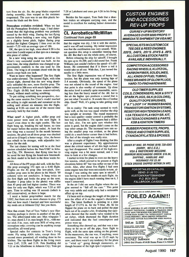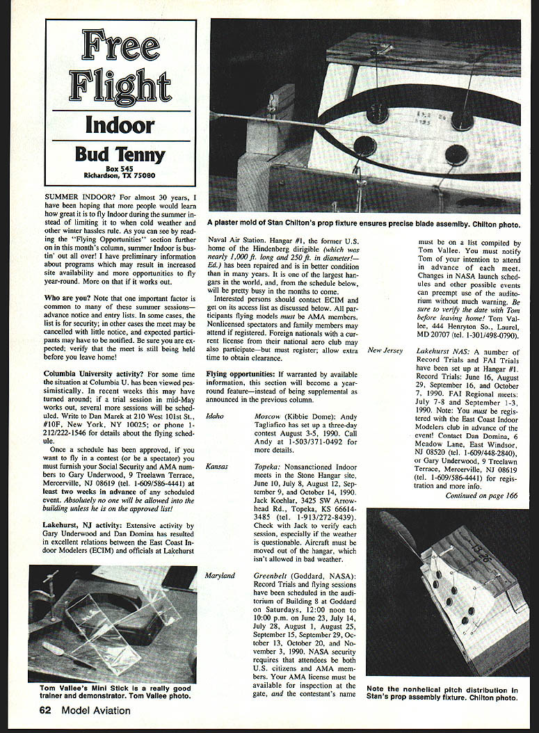 SUMMER INDOOR almost 30 years have hoping people would learn great fly Indoor during summer stead limiting cold weather other winter hassles rule As can see read ing Flying Opportunities section further months column summer Indoor bustin out over have preliminary information about programs may result increased site availability opportunities fly year-round works out Note important factor common summer sessions advance notice entry lists some cases list security other cases meet may cancelled little notice expected partici pants may have notified sure ex pected verify meet still being held before leave home Columbia University activity some time situation Columbia U has viewed pes simistically recent weeks may have turned around trial session mid-May works out several sessions will sched uled Write Dan Marek 210 West 10 1st St #10F New York NY 10025 phone 1212/222-1546 details about flying sched ule Once schedule has approved want fly contest spectator must furnish Social Security AMA num bers Gary Underwood 9 Treelawn Terrace Mercerville NJ 08619 tel 1-609/586-4441 least two weeks advance scheduled event Absolutely no will allowed building unless approved list Naval Air Station Hangar #1 former US home Hindenberg dirigible nearly 1000 ft long 250 ft diameter Ed has repaired better condition years largest han gars world schedule below will pretty busy months come Interested persons should contact ECIM get its access list discussed below par ticipants flying models must AMA members Nonlicensed spectators family members may attend registered Foreign nationals cur rent license national aero club may also participatebut must register allow extra time obtain clearance must list compiled Tom Vallee must notify Tom intention attend advance meet Changes NASA launch sched ules other possible events can preempt use audito rium much warning sure verify date Tom before leaving home Tom Val lee 444 Henryton So Laurel MD 20707 tel 1-301/498-0790 New Jersey Flying opportunities warranted available information section will become yearround featureinstead being supplemental announced previous column Idaho Kansas Lakehurst NJ activity Extensive activity Gary Underwood Dan Domina has resulted excellent relations between East Coast door Modelers ECIM officials Lakehurst Moscow Kibbie Dome Andy Tagliafico has set up three-day contest August 3-5 1990 Call Andy 1-503/371-0492 details Topeka Nonsanctioned Indoor meets Stone Hangar site June 10 July 8 August 12 Sep tember 9 October 14 1990 Jack Koehlar 3425 SW Arrow head Rd Topeka KS 666143485 tel 1-913/272-8439 Check Jack verify seasion especially weather questionable Aircraft must moved out hangar isnt allowed bad weather MarylandGreenbelt Goddard NASA Record Trials flying sessions have scheduled audi torium Building 8 Goddard Saturdays 1200 noon 1000 pm June 23 July 14 July 28 August 1 August 25 September 15 September 29 Oc tober 13 October 20 No vember 3 1990 NASA security requires attendees both US citizens AMA mem bers AMA license must available inspection gate contestants name Lakehurst NAS number Record Trials FAI Trials have set up Hangar #1 Record Trials June 16 August 29 September 16 October 7 1990 FAI Regional meets July 7-8 September 1-3 1990 Note must regis tered East Coast Indoor Modelers club advance event Contact Dan Domina 6 Meadow Lane East Windsor NJ 08520 tel 1-609/448-2840 Gary Underwood 9 Treelawn Terrace Mercerville NJ 08619 tel 1-609/586-4441 regis tration info Continued page 166 62 Model Aviation Free Flight Indoor Bud Tenny lox 545 Rkhardson TX 75080 plaster mold Stan Chiltons prop fixture ensures precise blade assemiby Chilton photo Vance C mini 0 seamy uuu trasimer demonstirnui Tom Vallee photo Note nonhelical pitch distribution Stans prop assembly fixture Chilton photo FOAMAIRE 74 IN WING SPAN 6-7 LBS 45-60 POWEP 4 CH PLY FOAM AND BALSA WOOD KIT $6995 SEND $100 FOR CATALOGCA7RT 1 NEODESHA KS 66757 FREE SHIPPING ON KIT ORDERSscaA ASTERCARD OF SAC KITS AND ACC325-2821 motor first guess What happened reset trim shift CG keep al FF Indoor/Tenny to CG location can bet changed ready proven trim unless model balances exactly halfway be-Moving CG can done three ways Continued page 62tween front rear motor hooks 1 Add weight equal difference motor Flying typical example situation Nov-weights halfway between front rear motor New YorkLevittown Cantiaqueice Pennyplane Qops call Limited Pen- hooks lighter motors session Cantiaque Park Junenyplane now Without motor CG 2 Add just enough weight front rear 10 1990 800 am 500 pmfour inches front thrust bearinghook restore original CG Contact Richard Fiore 531 Seca-the center motor her back 3 special case new wing Lim togue Ave Farmingdale NYWith 23-in loop 0093-in-thick tan rubberited PP lighter old wing required 11735 tel 1-516/249-4358 forthe CG shifts rearward 04 doesntballast weight about 0008 oz enough act detailsseem like lot 8% wing chord Ifa movable ballast known weight such model has critically trimmed much required ballast easy make simple chart May 89 column asked shift balance can actually make unstable showing position ballast weight Indoor fliers Later AMA HQ releasedEven stability isnt compromised finelyeach motor weight figures showing approximately 450 AMAtuned cruise may deteriorate costing mm members flew rule book eventsutes duration long flightProp assembly fixture typical problem during period January 1-October 6 1989 Fixing problem another matter As theassembling all-wood props such used total contestants same report wasCG moved rearward point theEasy Bs Pennyplanes blade/spar alignless 9000out total AMA membershipmodel has neutral stability CG behindment its very difficult get blade over 100000this point model unstable becomes pro-lay flat against spar both cor What does mean Two things AMA obvi- gressively stable CG moved for- rect angle typical assembly fixture Stan ward amount balance point moves ex- Chilton made female plaster paris mold ously offers members something com-p
