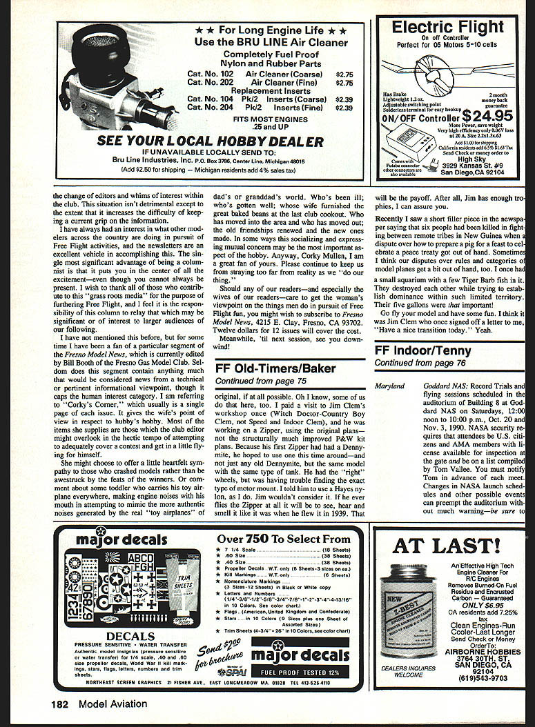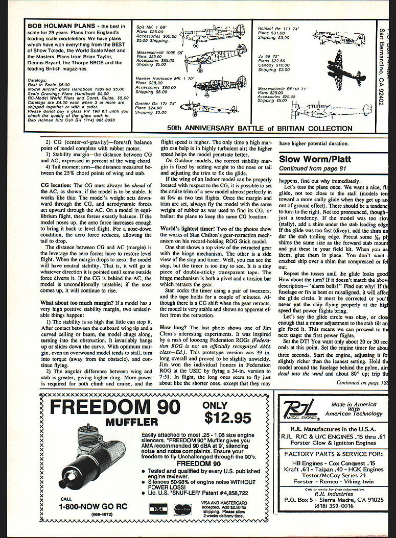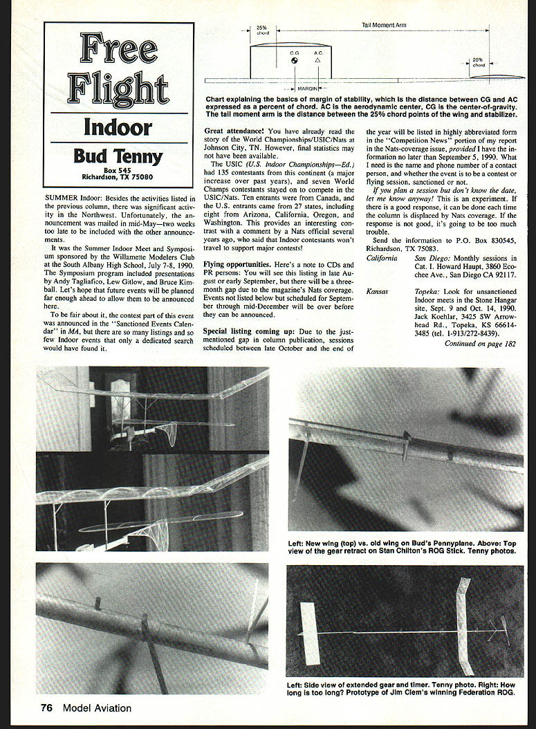 SUMMER Indoor Besides activities listed previous column significant activ ity Northwest Unfortunately nouncement mailed mid-Maytwo weeks too late included other announce ments Summer Indoor Meet Symposi um sponsored Willamette Modelers Club South Albany High School July 7-8 1990 Symposium program included presentations Andy Tagliafico Lew Gitlow Bruce Kim ball Lets hope future events will planned far enough ahead allow announced fair about contest part event announced Sanctioned Events Calen dar MA listings few Indoor events dedicated search would have found 25% chord r Tail Moment Arm Ad Alj 25% 7 chord MARGIN Chart explaining basics margin stability distance between CG AC expressed percent chord AC aerodynamic center CG center-of-gravity tail moment arm distance between 25% chord points wing stabilizer Great attendance have already read story World Championships/USIC/Nats Johnson City TN However final statistics may have available USIC US Indoor ChampionshipsEd 135 contestants continent major increase over past years seven World Champs contestants stayed compete USIC/Nats Ten entrants Canada US entrants came 27 states including eight Arizona California Oregon Washington provides interesting con trast comment Nats official several years ago said Indoor contestants wont travel support major contests Flying opportunities Heres note CDs PR persons will see listing late Au gust early September will threemonth gap due magazines Nats coverage Events listed below scheduled Septem ber through mid-December will over before can announced year will listed highly abbreviated form Competition News portion report Nats-coverage issue provided have formation no later September 5 1990 What need name phone number contact person whether event contest flying session sanctioned plan session dont know date let know anyway experiment good response can done time column displaced Nats coverage response good its going too much trouble Send information PO Box 830545 Richardson TX 75083 CaliforniaSan Diego Monthly sessions Cat Howard Haupt 3860 Eco chee Ave San Diego CA 92117 Kansas Special listing coming up Due justmentioned gap column publication sessions scheduled between late October end Topeka Look unsanctioned Indoor meets Stone Hangar site Sept 9 Oct 14 1990 Jack Koehlar 3425 SW Arrow head Rd Topeka KS 666143485 tel 1-913/272-8439 Continued page 182 76 Model Aviation Free Flight Indoor Bud Tenny Box 545 RIchardson TX 75080 Left New wing top vs old wing Buds Pennyplane Above Top view gear retract Stan Chiltons R0G Stick Tenny photos Left Side view extended gear timer Tenny photo Right long too long Prototype Jim Clems winning Federation ROQ * * Long Engine Life * * Use BRU LINE Air Cleaner Completely Fuel Proof Nylon Rubber Parts Cat No 102 Air Cleaner Coarse $275 Cat No202Air CleanerFine$275 Replacement Inserts Cat No 104 PkI2 Inserts Coarse $239 Cat No 204 Pkl2 Inserts Fine $239 FITS MOST ENGINES 25and UP SEE YOUR LOCAL HOBBY DEALER IF UNAVAILABLE LOCALLY SEND TO Bru Line Industries Inc o Box 3780 Center Line Michigan 48015 Add $2 50 sh pp ng M ch gan residents add 4% sales taxi change editors whims interest within club situation isnt detrimental except extent increases difficulty keep ing current grip information have always interest what other mod elers across country doing pursuit Free Flight activities newsletters excellent vehicle accomplishing sin gle significant advantage being colum nist puts center excitementeven though cannot always present wish thank contrib ute grass roots media purpose furthering Free Flight feel respon sibility column relay may significant interest larger audiences following have mentioned before some time have fan particular segment Fresno Model News currently edited Bill Booth Fresno Gas Model Club Sel dom does segment contain anything much would considered news technical pertinent informational viewpoint though caps human interest category am referring Corkys Corner usually single page issue gives wifes point view respect hubbys hobby Most items supplies club editor might overlook hectic tempo attempting adequately cover contest get little fly ing himself might choose offer little heartfelt sym pathy crashed models rather awestruck feats winners com ment about some toddler carries toy air plane everywhere making engine noises mouth attempting mimic authentic noises generated real toy airplanes dads granddads world Whos ill whos gotten well wife furnished great baked beans last club cookout has moved area has moved out old friendships renewed new ones made some ways socializing express ing mutual concern may important pect hobby Anyway Corky Mullen am great fan yours Please continue keep us straying too far reality thing Should readersand especially wives readerscare get womans viewpoint things men pursuit Free Flight fun might wish subscribe Fresno Model News 4215 E Clay Fresno CA 93702 Twelve dollars 12 issues will cover cost Meanwhile til next session see down wind FF Old-Timers/Baker Continued page 75 original possible Oh know some us too paid visit Jim Clems workshop once Witch Doctor-Country Boy Clem Speed Indoor Clem working Zipper using original plans structurally much improved P&W kit plans Because first Zipper had Dennymite hoped use time aroundand just old Dennymite same model same type tank right wheels having trouble finding exact type motor mount told him use Hayes ny lon Jim wouldnt consider ever flies Zipper will see hear smell like flew 1939 will payoff After Jim has enough tro phies can assure Recently saw short filler piece newspa per saying six people killed fight ing between remote tribes New Guinea dispute over prepare pig feast cel ebrate peace treaty got out hand Sometimet think disputes over rules categories ol model planes gets bit out hand too once small aquarium few Tiger Barb fish destroyed other trying estab lish dominance within such limited territory five gallons important Go fly model have some fun think Jim Clem once signed off letter Have 