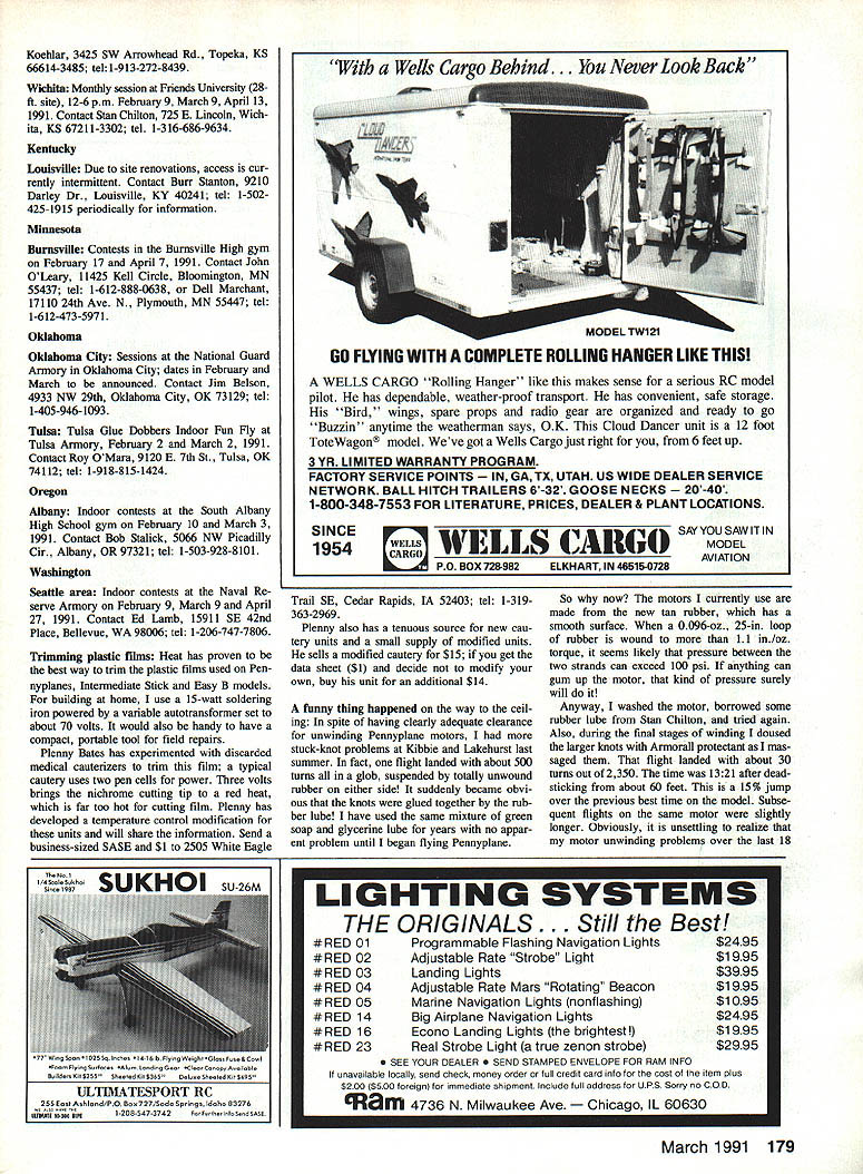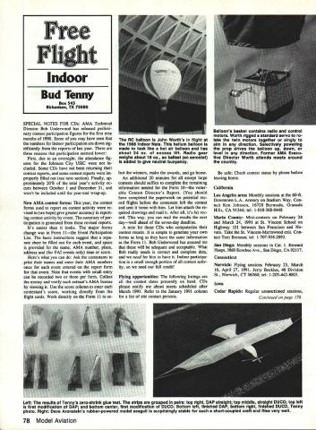 SPECIAL NOTES FOR CDs AMA Technical Director Bob Underwood has released prelimi nary contest participation figures first nine months 1990 Some may have seen numbers Indoor participation down sig nificantly reports last year three reasons participation seemed lower First due oversight attendance fig ures Johnson City USIC cluded Some CDs have returning contest reports some contest reports Im properly filled out see next section Finally ap proximately 20% total years activity oc curs between October 1 December 31 wont included until year-end wrap-up New AMA contest forms year contest forms used report contest activity re vised hope give greater accuracy report ing contest activity event summary par ticipation generated revised reports Its easier looks major forms change Form 11the Event Participation List basic instructions suggest sepa rate sheet filled out event space provided name AMA number place address FAI events time score Heres what can Ask contestants print names enter AMA numbers once event entered report form event Note events small entry can recorded two three per form Collect money verd entrants AMA license viewing Use score column enter contestants score working directly flight cards Work directly Form 11 se lect winners make awards go home An additional 20 minutes except large contests should suffice complete remaining information needed Form 10the vener able Contest Directors Report should have completed paperwork potential rec ord flights before contestant left contest sent home him Let him attach re quired drawings mail After its rec ord way can mail results next daywell ahead seven-day deadline note CDs computerize contest results simple generate own forms long have same information Form 11 Bob Underwood has assured will adequate acceptable What Bob really needs correct complete data need him have Indoor participa tion small enough portion contest activ ity need full credit safe Check contest status phone before leaving home California Los Angeles area Monthly sessions 60-ft Downtown LA Armory Stadium Way Con tact Ken Johnson 16728 Burmuda Granada Hills CA 91344 tel 1-818-368-0448 Mann County Mini-contests February 24 March 24 1991 St Vincent School Highway 101 between San Francisco No vato Take St Vincent-Marinwood exit Con tact Tom Brennan tel 1-707-938-2893 San Diego Monthly sessions Cat Howard Haupt 3860 Ecochee Ave San Diego CA 92117 Connecticut Norwich Flying sessions February 23 March 16 April 27 1991 Jerry Bockius 48 Division St Norwich CT 06360 tel 1-203-442-8003 Iowa flying opportunities following listings contest dates presently hand CDs please notify about meets scheduled after March 1991 Refer January 1991 column Cedar Rapids Regular unsanctioned sessions list site contact personsContinued page 178 78 Model Aviation Free Flight Indoor Bud Tenny Box 545 RIchardson TX 75080 RC balloon John Worths flight 1988 Indoor Nuts helium balloon made look like hot air balloon has about 24 oz excess lift Radio gear weighs about 18 ox ballast aerostat added give neutral buoyancy Balloons basket contains radio control motors Worth rigged standard servo ro tate twin motors together singly aim direction Selectively powering prop drives balloon up down level direction Former AMA Execu tive Director Worth attends meets around country Left results Tennys zero-shrink glue test strips grouped pairs top right DAP straight top middle straight DUCO top left first modification DAP bottom center first modification DUCO Bottom left finished DAP bottom right finished DUCO Tenny photo Right Dave Aronsteins rubber-powered model seagull surprisingly stable such short-coupled craft files very well BATTERY MANAGEMENT System MOSFET nicad cycler $18995 MOSFET nicad cWler designed specifically planes boats helicopters 3 overnight/trickle outputs capable charging 1 9 cells infinitely adjustable FIX overnight charge current ability discharge both FIX TX packs digital discharge timer 3 outputs allow simultaneous separate charging FIX TX AUXILIARY eg glow plug starter battety nicads Nicads will charge overnight rate 17 hours 4 minutes before automatically switching trickle rate Adjustable control allows charging FIX pack up 2000 mAll capacity TX output can discharge hand 9 cell packs 300 mA FIX output can discharge 4 S cell packs 300 500 mA True Constant Current sources used charge/discharge modes power up BMS ONE will always come up overnight charge mode ensuring fully charged batteries event momentary 110 volt power loss Utilizing Current Detection Circuitry LEDs can illuminate current actually flowing out batteries Large digital display antiglare filter shows FIX TX discharge times Unique CAPACITY CALCULATOFI will allow milliampere-hour rating batteries lobe determined RK ELECTRONICS 5INOVATIVE ELECTRONICS 3O Fox Hun Hudson New HampshIre 03051 882-6022 Sykora speaks old Tommy McLaughlin Pensacola FL salute him series Swinger designs developed over decade flying USA FAI FF team trials Tommy now octogenarian spry ever can recount tales World Championship USA FtC Power team 1971 1973 author Team Manager Tommys FAI Swinger design see photo has light features including sheeted wing Mylar-covered tail also has folding prop own design high-revving Rossi 15 ship gets its name swing action wing occurs along variable-incidence tailplaneVIT-and autorudderAR end motor run model enters its glide mode take opportunity tip FF hat McLaughlin certainly elder statesman FAI Power worldwide Thermals Tommy Superior props Are looking best laminating prop forms ready-made prop blades old-time machine-cut balsa prop blanks Search no moreyou can have Ed Wicklands Su perior Props Pensacola FL Ed has spent career designing machine tools now creates computer-generated coordinate props forms exceptional accuracy quality Prepaid Orders Money Order Certified Check Shipping & Ilandling $500 COD Orders Cash Certified Check collected delivery Add $350 above amounts DEALER IIYQJJIRIES IIY VI TED Prices Speclllcatlons Subjecl Chang