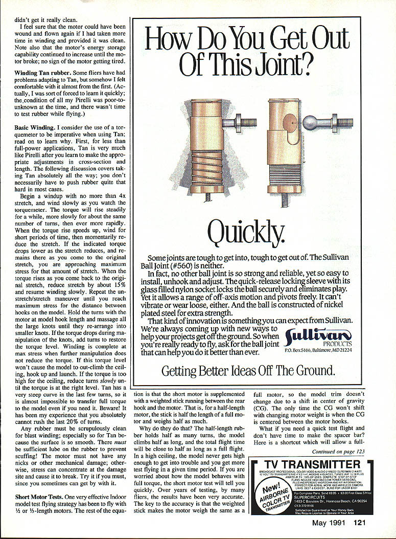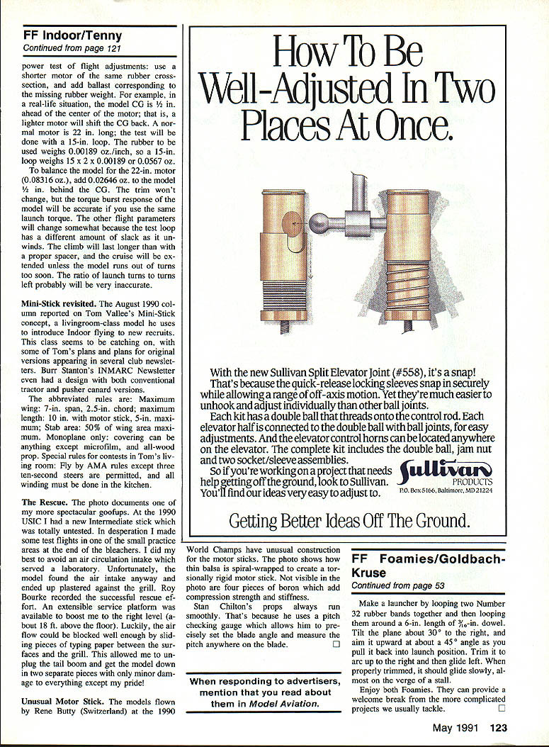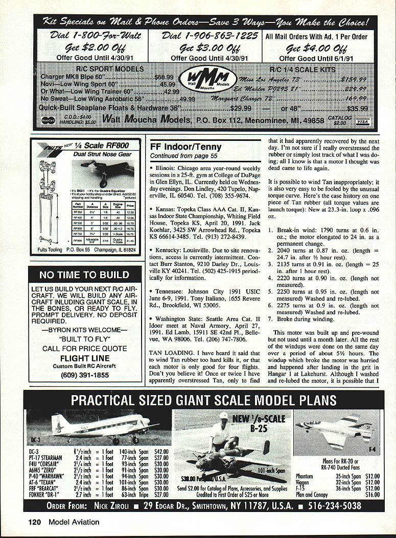 BIG SHOW TIME AGAIN 1991 Us Indoor Championships will held John son City Tennessee June 6 through 9 1991 sponsored again National Free Flight Society No details presently available can get entry blanks available Just send business-sized SASE Tony Italiano 1655 Revere Rd Brookfield WI 53005 bag bag January 1991 column raised warning about certain plas tic rubber storage bags topic has gen erated comments other topic ever presented have received ques tions suggestions reports bad rubber letters skeptic personally has lost no rubber Roy Stewart asked about disposable plastic rolls gro cery store Tom Matterfis suggested using aluminum foil bags held together double-sided tape broad range infor mation came Boyd Felstead summa rizing reports several international fliers Another suggested source pleated sandwich bag very lightweight plas tic available grocery store personal experience have found couple different types plastic bags holding deteriorated rubber including sealable bag piece formerly prime Pirelli appeared burned crisp wherever touched plastic also found other bags rubber seemed OK bottom line ualess have chemist buddy access gas chroma tograph cant sure bags safe Although vinyl chloride has strongly implicated causative agent should assumed other ma terial might outgassing plastic harmless Jerry Bockius insists rare chemicals disasterol infernalon may also involved what us ing seems safe keep using long certain can keep getting ex actly same material As myself Ive switched 100% glassine envelopes oven bags major downer two fold takes lot time individually move motors raw rubber strip new individually labelled containers whatever used Also glassine envelopes really intended store thin stacks stamps rather glob rubber strip Conse quently store less gracefully tend spill motors out unless carefully han dled answer keeping envelopes closed appears solved using pressure-sensitive self adhesive paper la bel strips use Avery #S828 labels cut halO keep lube off label makes reusable latch works very well Flying Opportunities following list ings contest dates presently hand CDs please fill dates June 1991 beyond California Los Angeles area Monthly sessions 60-ft downtown LA Ar mory Stadium Way Contact Ken John son 16728 Burmuda Granada Hills CA 91344 Tel 818 368-0448 California San Diego Monthly sessions Cat Howard Haupt 3860 Ecochee Ave San Diego CA 92117 Connecticut Glastonbury Indoor flying Glastonbury has cancelled until further notice ConnecticutNorwich Flying session Apr 27 1991 Jerry Bockius 48 Division St Norwich CT 06360 Tel 203 887-5879 Florida Miami Dr John Martin 2180 Ti gertail Ave Miami FL 33133 Tel 305 858-6363 Last MIAMA No6 seasonMay 18-19 1991 McDill AFB Idaho Moscow has another Kibbie Dome session tentatively scheduled Au gust 8 through 11 1991 Andy Tagliafico 650-B Taybin Rd NW Salem OR 97304 Tel 503 371-0492 May 1991 55 Free FMt Indoor Bud Tenny lox 545 Rldardson TX 75080 Bud Tenny rescues model air intake aid adjustable-height platform Swiss filer Rene Butty uses boron spiral-wrapped balsa build rigid motor sticks Continued page 120 Side view Stan Chiltons prop pitch checker showing radius adjustment built-in protractor allows Stan measure pitch station along blade 74 F t' e d /-OO--6a/t CL11 /-906-g63- /225 Mail Orders Ad 1 Per Order 9ct$2OO~ee%4OOO4 Offer Good Until 4/30/91Offer Good Until 4/30/91Offer Good Until 6/1/91 R/C SPORT MODELSA/C 114 SCALE KETS ~rgr # ~ kwLow Wing Spot 9 XW8NMOd/ OrWhLpn TBner GOS.......S42S9 w# SweatLow Wlt A*rObt A~o 654 t : *. dAd i 04* QkButt SosRats & Hw~er ~r 4# . .. .. . it Aup CA TA MenoflIns* ML 495*e WSA l6T A A T Oltn. SI.SI. lFssoI 3I/S431255 41/8 4 601255 jRF500j~60-601575 RFSOO65/3260121675 607507045/320455411575 LA 50560 44345*1 3145 v01 LET US BUILD YOUR NEXT R/O AIR CRAFT WE WILL BUILD ANY AIR CRAFT INLUDING GIANT SCALE IN THE BONES OR READY TO FLY PROMPT DELIVERY NO DEPOSIT REQUIRED BYRON KITS WELCOME BUILT TO FLY CALL FOR PRICE QUOTE FLIGHT LINE Custom Bulit RC Aircraft 609 391-1855 FF Indoor/Tenny Continued page 55 Illinois Chicago area year-round weekly sessions 25-ft gym College DuPage Glen Ellyn IL Currently held Wednes day evenings Don Lindley 420 Tupelo Nap erville IL 60540 Tel 708 355-9674 Kansas Topeka Class AAA Cat II Kan sas Indoor State Championship Whiting Field House Topeka KS April 20 1991 Jack Koehlar 3425 SW Arrowhead Rd Topeka KS 66614-3485 Tel 913 272-8439 Kentucky Louisville Due site renova tions access currently intermittent Con tact Burr Stanton 9210 Darley Dr Louis ville KY 40241 Tel 502 425-1915 period ically information Tennessee Johnson City 1991 USIC June 6-9 1991 Tony Italiano 1655 Revere Rd Brookfield WI 53005 Washington State Seattle Area Cat II Idoor meet Naval Armory April 27 1991 Ed Lamb 15911 SE 42nd P1 Belle vue WA 98006 Tel 206 747-7806 TAN LOADING have heard said wind Tan rubber too hard kills motor oaly good four flights Dont believe Once twice have apparently overstressed Tan find apparently recovered next day Im sure really overstressed rubber simply lost track what ing know motor thought dead came life again possible wind Tan inappropriately also very easy fooled unusual torque curve Heres case history piece Tan rubber torque values launch torque New 233-in loop x 096 oz 1 Break-in wind 1790 turns 06 oz motor elongated 24 permanent change 2 2040 turns 087 oz length in after hour rest 3 2135 turns 091 oz length fter 1 hour rest 4 2220 turns 090 oz length measured 5 2250 turns 095 oz length measured Washed re-lubed 6 2275 turns 09 oz length measured Washed re-lubed 7 Broke during winding motor built up pre-wound used until month later rest windups done same day over period about 5 hours windup broke motor hurried happened after landing grit Hangar 1 Lakehurst Although washed re-lubed motor possible 120 Model Aviation IlObby shop 5*SPI55 654114605 NE e RF800 Dual Stint Nose Gear Fults Tooling PO Box 95 Champaign IL 61824 soot Add $260 p5bred didnt get really clean feel sure motor could 