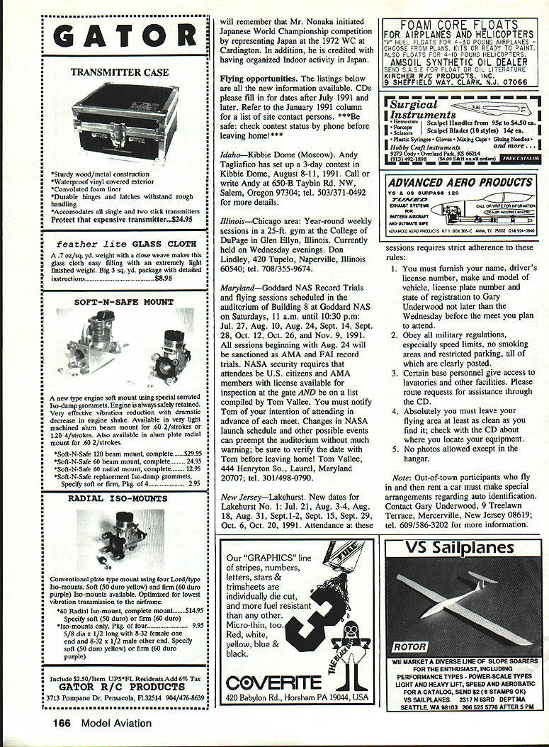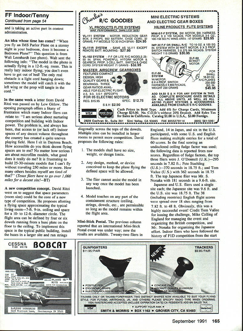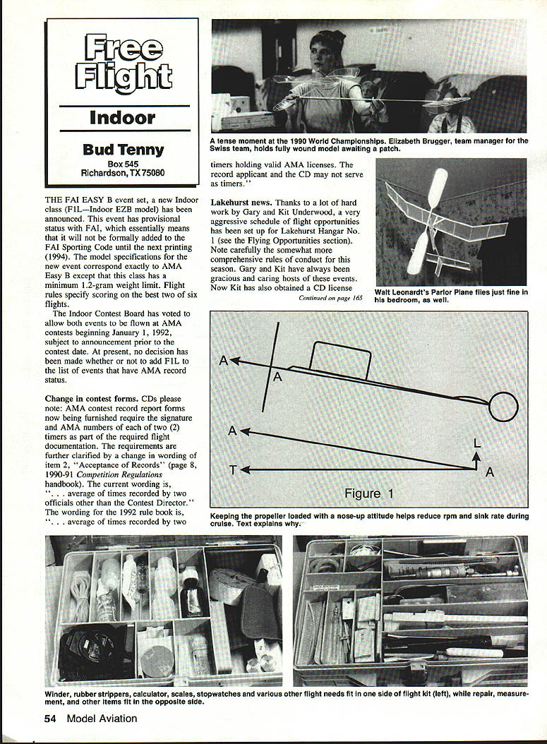 THE FM EASY B event set new Indoor class F iLIndoor EZB model has announced event has provisional status FM essentially means will formally added FM Sporting Code until next printing 1994 model specifications new event correspond exactly AMA Easy B except class has minimum 12-gram weight limit Flight rules specify scoring best two six flights Indoor Contest Board has voted allow both events flown AMA contests beginning January 1 1992 subject announcement prior contest date present no decision has made whether add FiL list events have AMA record status Change contest forms CDs please note AMA contest record report forms now being furnished require signature AMA numbers of two 2 timers part required flight documentation requirements further clarified change wording item 2 Acceptance Records page 8 1990-9 1 Competition Regulations handbook current wording average times recorded two officials other Contest Director wording 1992 rule book average times recorded two timers holding valid AMA licenses record applicant CD may serve timers Lakehurst news Thanks lot hard work Gary Kit Underwood very aggressive schedule flight opportunities has set up Lakehurst Hangar No 1 see Flying Opportunities section Note carefully somewhat comprehensive rules conduct season Gary Kit have always gracious caring hosts events Now Kit has also obtained CD license Continued page 16S 54 Model Aviation EEUiQ Indoor Bud Tenny Box 545 Richardson TX 75080 tense moment 1990 World Championships Elizabeth Brugger team manager Swiss team hoids fuliy wound modei awaiting patch Wait Leonardts Parior Plane flies just fine bedroom well Keeping propeller loaded nose-up attitude helps reduce rpm sink rate during cruise Text explains Winder rubber strippers calculator scales stopwatches various other flight needs fit side flight kit left repair measure ment other items fit opposite side FF Indoor/Tenny Continued page 54 taking active part contest administration An idea time has come fly IMS Parlor Plane stormy night bedroom does become Bedroom Plane question Walt Leonhardt see photo Walt sent following info model photo actually flying 12-ft-sq room really lazy indoor flying dont have get out bed real obstacle light cord hanging down sometimes model will catch left wing prop will tangle cord same week letter David Ritzi passed Lew Gitlow opening paragraph offers litany frustration Indoor fliers can relate am serious about nurturing competition building Indoor power problem always has access lack Indoor spaces decent volume throughout country has created quite uneven playing field sit Daytona Beach accessible think decent flying spaces No matter serious am about microfilm models what good does really frustrating build 25-30-minute models cant fly traveling 250 miles others besides myself tired Texas fliers have go over 1000 miles decent siteBT new competition concept David Ritzi went suggest space parameters room size could core new type competition proposes allotting flying space approximating typical living room7-ft 9-in ceiling space 10- 12-ft-diameter circle flight area can defined four six dowels running base plate floor ceiling implement space typical public building install bases larger site run strings GOODIES VL PRODUCTS FLITE SYSTEMS MAX PERFORMANCE SMALLEST SIZE VL-111 SYSTEM MOTOR REDUCTION GEAR BOX 2 PROPS 852 BATTERY CHGE CORD 32 GRAMS F-F MODELS TO 30 INCH SPAN -$2495 VL-11IR SYSTEM SAME AS VL111 EXCEPT REMOTE BATh MOUNTING $2795 VL-102 SYSTEM F-F OR LITE B/C MODELS 2550 IN SPAN POWERFUL HYTORK MOTOR & GEARBOX PROP 3-CELL BATT SWITCH & CHGE CORD SYSTEM WEIGHT 71 GRAMS -$3295 MASTER AIRSCREW GE FEATURES COMPACT DESIGN HIGH QUALITY GEARS & BEARINGS GEAR RATIOS ABLE FOR ELt 25 30 3frI FOR 05 E BEG $1595 e MINI ELECTRIC SYSTEMS AND ELECTRIC GEAR BOXES HILINE PRODUCTS FLITE SYSTEMS MINI-6 F-F SYSTEM SW MOTOR SW HARNESS PROP 3 X 100 NICADS FOR MODELS 3-5 OZ 100-1 50 SOIN WING AREA -47 GRAMS $2995 IMP-30 F-F OR SMALL R/C TO 10 OZ & 150 50 IN SYSTEM WITH 30 WATT MOTOR 5 X 3 PROP SWITCH HARNESS 3 275 MA NICADS SYSTEM WEIGHT 115 GRAMS 3095 W/MOTOBB/C PLANES 6 X 4 PROP SWITCH250-300 HARNESS4 X 800 NICADSSO IN WEIGHT 230 GRAMS$4595 ADO $450 S & H FOR ANY SYSTEM IN THIS AD COMPLETE BROCHURE GIVES DETAILS ON ALL ABOVE UNITS AS WELL AS ALL ASTRO FLIGHT SYSTEMS & ACCESSORIES AVAILABLE FROM CHARLIES R/C GOODIES Cash Prices Bold Type Add 6% Charge Cards Minimum VISACharge $2500 No CODs 20% Deposit Add Sales Tax Sales California Catalog $100 USA $300 Foreign 2828 Cochran St Suite 281 Valley CA 93065 8055279114805 581-5061. diagonally across tops dowels Multiple sites can installed larger rooms permit competition David proposes following rules 1 The models shall have no size weight design limits 2 Any design method device conceived keep plane flying defined space will allowed 3 The flier cannot assist model way once model has launched 4 Model touches part containment structure ceiling strings dowels etc permissible long model remains within flight area Mini-Stick Postal previous column reported international Mini-Stick Postal event under way now results available Twenty-two fliers England 14 Japan six US participated some US English fliers making multiple entries total 60 scores final scoring undisclosed ceiling fudge factor used following data reported raw scores Regardless fudge factors top three fliers J ODonnell UK295 seconds 782 ft Pete Staehling US370 seconds 1875 ft Tom Vallee US 362 seconds 1875 ft top Japanese flier Mr S Nonaka 181 seconds 96-ft site Japanese US fliers used single site Japanese site 96 ft US site 1875 ft 38 including reentries English flight scores spread over 18 sites ranging 782 ft 48 ft Obviously highly successful event Credit Tom Vallee issuing challenge Mike Colling England managing event organizing British competition Mr Nonaka organizing Japanese effort Indoor fliers have followed history FiD competition start September 1991 165 MUTORS SPEC $1275 S&H $250 T-50Uc78El CESSNA B 013CR1 GATOR TRANSMITEER CASE 