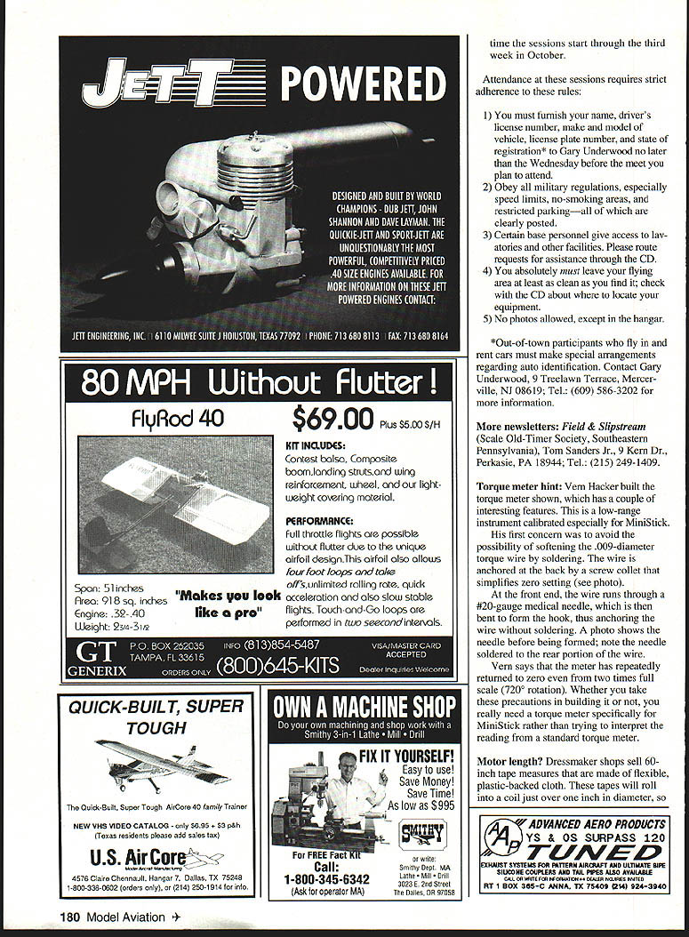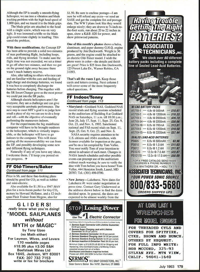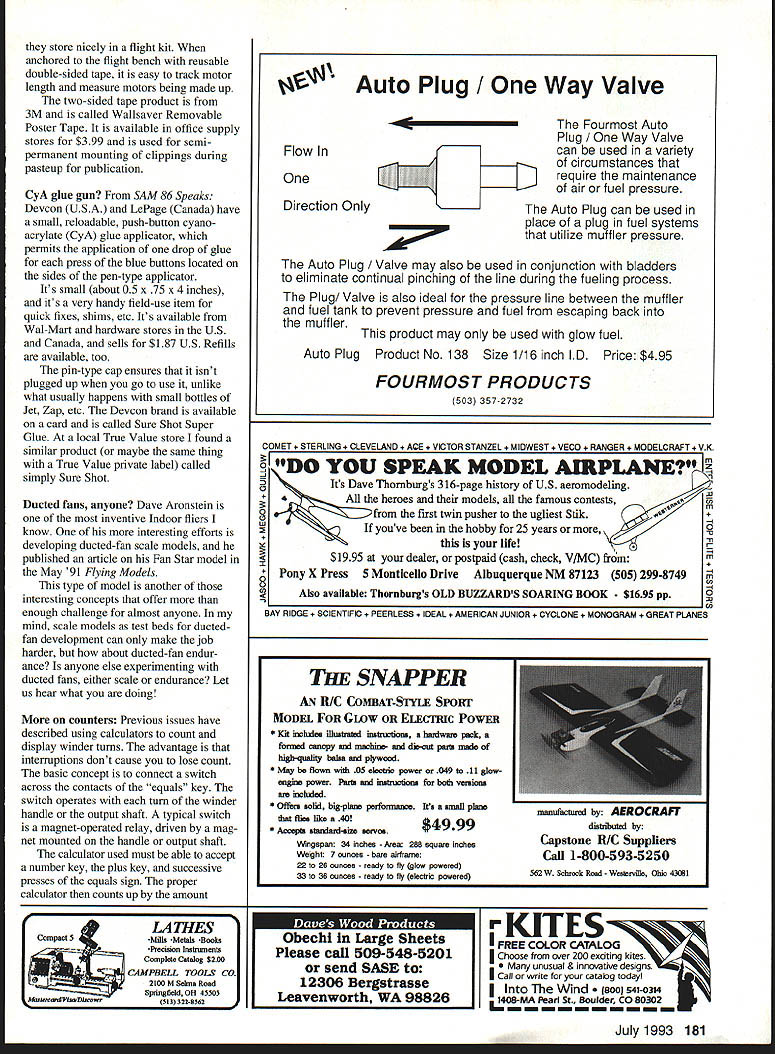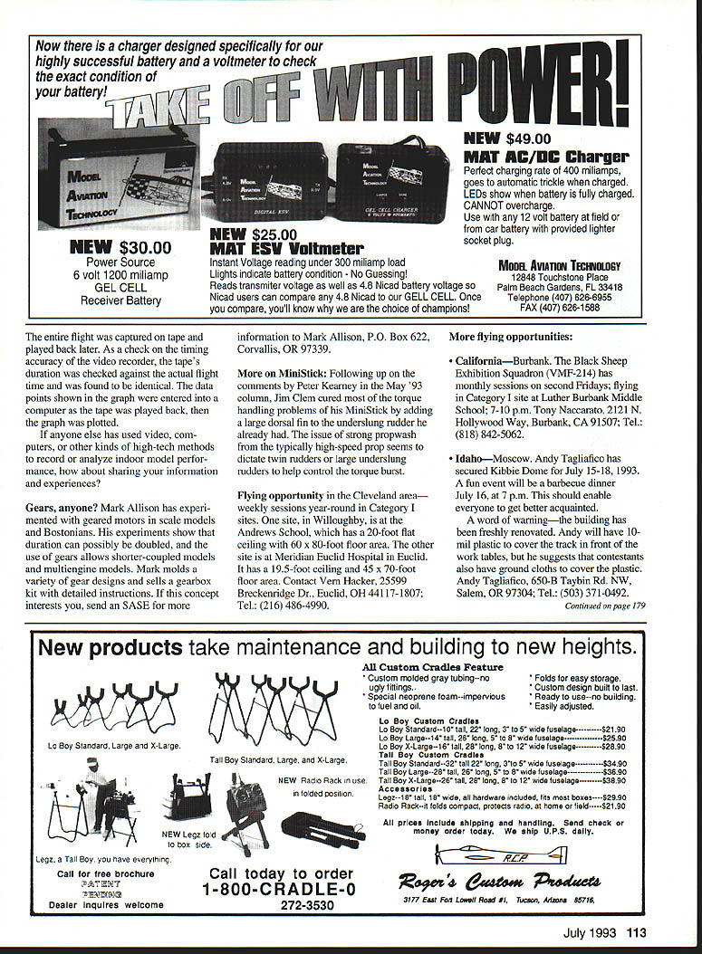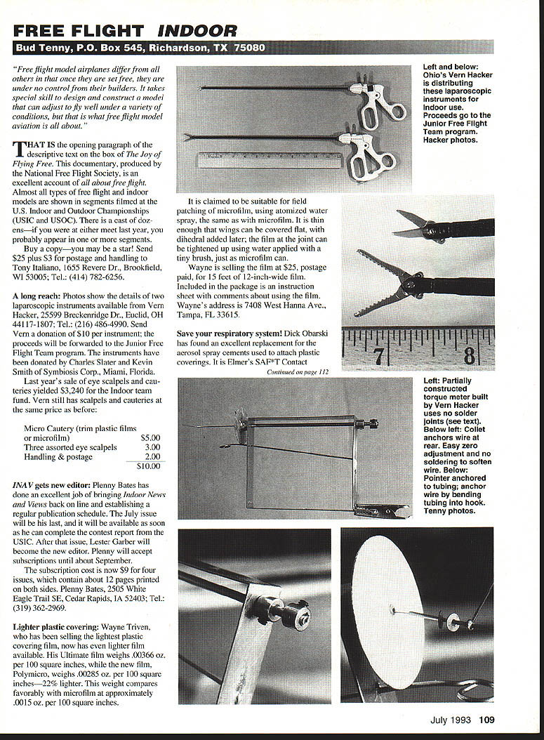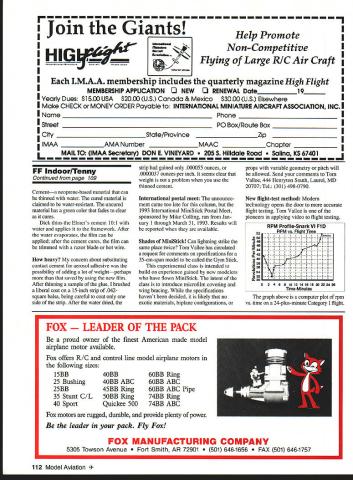 FREE FLIGHT INDOOR Free flight model airplanes differ others once set free under no controlfrom builders takes special skill design construct model can adjust fly well under variety conditions what free flight model aviation about IfHAT IS opening paragraph J.descnptive text box Joy Flying Free documentary produced National Free Right Society excellent account about free flight Almost types free flight indoor models shown segments filmed US Indoor Outdoor Championships USIC USOC cast doz ensif either meet last year probably appear segments Buy copyyou may star Send $25 plus $3 postage handling Tony Italiano 1655 Revere Dr Brookfield WI 53005 Tel 414 782-6256 long reach Photos show details two laparoscopic instruments available Vein Hacker 25599 Breckenridge Dr Euclid OH 44117-1807 Tel 216 486-4990 Send Vein donation $10 per instrument proceeds will forwarded Junior Free Right Team program instruments have donated Charles Slater Kevin Smith Symbiosis Corp Miami Florida Last years sale eye scalpels cau teries yielded $3240 Indoor team fund Vein still has scalpels cauteries same price before Micro Cautery trim plastic films microfilm Three assorted eye scalpels Handling & postage $500 300 200 $1000 INAV gets new editor Plenny Bates has done excellent job bringing Indoor News Views back line establishing regular publication schedule July issue will last will available soon can complete contest report USIC After issue Lester Garber will become new editor Plenny will accept subscriptions until about September subscription cost now $9 four issues contain about 12 pages printed both sides Plenny Bates 2505 White Eagle Trail SE Cedar Rapids IA 52403 Tel 319 362-2969 Lighter plastic covering Wayne Triven has selling lightest plastic covering film now has lighter film available Ultimate film weighs 00366 oz per 100 square inches new film Polymicro weighs 00285 oz per 100 square inches22% lighter weight compares favorably microfilm approximately 0015 oz per 100 square inches claimed suitable field patching microfilm using atomized water spray same microfilm thin enough wings can covered flat dihedral added later film joint can tightened up using water applied tiny brush just microfilm can Wayne selling film $25 postage paid 15 feet 12-inch-wide film Included package instruction sheet comments about using film Waynes address 7408 West Hanna Ave Tampa FL 33615 Save respiratory system Dick Obarski has found excellent replacement aerosol spray cements used attach plastic coverings Elmers SAF*T Contact Left below Ohios Vein Hacker distributing laparoscopic instruments Indoor use Proceeds go Junior Free Flight Team program Hacker photos Left Partially constructed torque meter built Vein Hacker uses no solder joints see text Below left Collet anchors wire rear Easy zero adjustment no soldering soften wire Below Pointer anchored tubing anchor wire bending tubing hook Tenny photos July1993 109 rnrn Join Giants Help Promote INon-CompetitiveI HI u _ __ yingof Large RIC Air Craft AA membership includes quarterly magazine High Flight I MEMBERSHIP APPUCAllON IJ NEW RENEWAL Date19I Yearly Dues$1500 USA $2000 US Canada & Mexico $3000 US ElsewhereI Make CHECK MONEY ORDER Payable INTERNATIONAL MINIATURE AIRCRAFT ASSOCIATION INC I Name ____________________________________ Phone ________________________ I Street ______________________________________ P0 Box/Route Box ________________ City _______________________State/Province ________________Zip _________________ I IMAA _________AMA Number ___________MAAC _________Chapter _________ L O IMAA Secretary DONE VINEYARD 2O5 HiIIdce Road na KS 67401 rn rn rnrn rnrnrn rnrn FF Indoor/Tenny Continued page 109 Cementa neoprene-based material can thinned water cured material claimed water-resistant uncured material has green color fades clear cures Dick thins Elmers cement 101 water applies framework After water evaporates film can applied after cement cures film can trimmed razor blade hot wire heavy concern about substituting contact cement aerosol adhesive possibility adding lot weightperhaps saved using new film After thinning sample glue brushed liberal coat 15-inch strip 042square balsa being careful coat side strip After water dried strip gained 000055 ounces 0000037 ounces per inch seems clear weight problem use thinned cement International postal meet announce ment came too late column 1993 International MiniStick Postal Meet sponsored Mike Colling ran Jan uary 1 through March 31 1993 Results will reported available Shades MiniStick Can lightning strike same place twice Tom Vallee has circulated request comments specifications 35-cm-span model called Gym Stick experimental class intended build experience gained new modelers have flown MiniStick intent class introduce microfilm covering wing bracing specifications havent decided likely no exotic materials biplane configurations props variable geometry pitch will allowed Send comments Tom Vallee 444 Henryton South Laurel MD 20707 Tel 301 498-0790 New flight-test method Modern technology opens door accurate flight testing Tom Vallee pioneers applying video flight testing 52 250 48 46 44 40 34 032 30 0 2 4 6 8101214181820222426 lime-Minutes graph above computer plot rpm vs time 24-plus-minute Category flight FOX ER OF THE PACK proud owner finest American made model airplane motor available Fox offers RIG control line model airplane motors following sizes 15BB 25 Bushing 25BB 35 Stunt G/L 40 Sport 4OBB 4OBB ABC 45BB Ring 5OBB Ring Quickee 500 6OBB Ring 6OBB ABC 6OBB ABC Pipe 74BB Ring 74BB ABC Fox motors rugged durable provide plenty power leader pack Fly Fox FOX MANUFACTURING COMPANY 5305 Towson Avenue Smith AR 72901 646-1656 501 646-1757 112 Model Aviation Proflie-Snark VI Fl D RPM vs Flight limo Now charger designed specifically highly successful battery voltmeter check exact condition battery POWEll NEW $4900 MAT AC/DC Chargur Perfect charging rate 400 miliamps goes automatic trickle charged LEDs show battery fully charged