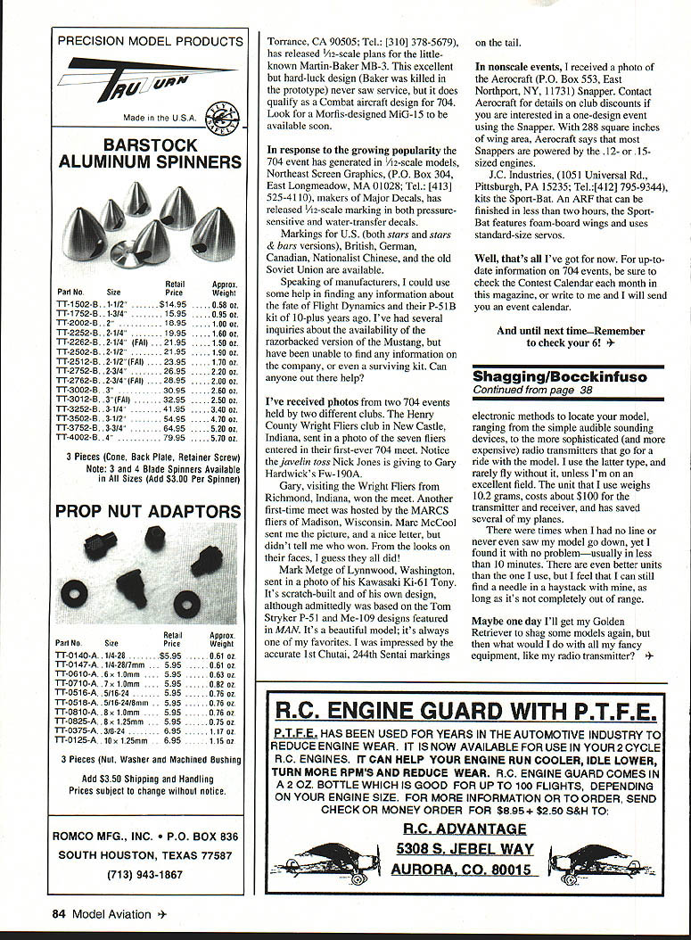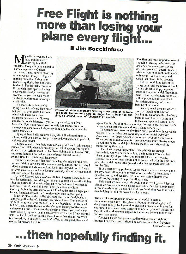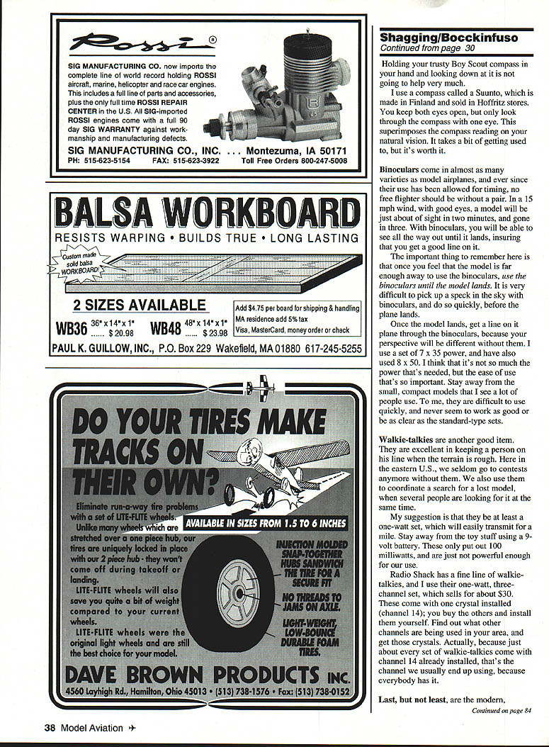 Free Flight nothing losing plane flight. U Jim Bocckinfuso wife has yellow-blond hair used chase free flight models thought quite natural start calling Golden Retriever now have chase own models Flying free flight nothing losing plane flight hopefully finding lucky few fly wide-open spaces finding model usually presents no problem can usually see ground far away half mile Its likely youre flying field very high brush tall grass crops like corn will make plane disappear quicker went Bermuda Triangle youre very unlucky fly Galeville New York lose planes also motorcycles cars wives kids anything else dares enter its magic boundaries Flying fields requires very disciplined set rules follow slack off just second could probably will lose model began realize certain guidelines shagging game about 1985 after years flying sport free flight decided get serious about flying lot Quickie 500 some Pattern needed change pace still wanted competition Free Flight answer immediately lost first hand launch glider knee-high grass because didnt pay close attention landed next day bribed couple kids looking did find close looking Actually about 200 feet launched 1986 knew real free fighter because little dirt bike retrieving doing just fine contest Galeville flying hot little Mini-Pearl its second max mile high mile downwind hot pursuit little motorcycle dirt road following planes flight path Instead angled off left considerably kept going saw plane dethermalize DT land field kept going off left no idea portion field has growth over head soit hopeless Bob Hatschek Jack Nix spent rest afternoon looking model never did find also day learned cant wear shorts flying rough field Several weeks later flew over field still could see plane knew wanted competitive sport couldnt afford lose good planes motors reasons like first important rule shagging stop wherever plane starts get near ground doesnt matter whether youre foot motorcycle caryou must stop watch plane hit ground Take good long look background memorize Look object help get exact line model Tree lines houses fences telephone poles etc will help use cloud formations unless youre barking moon usually mark spot stop scratching dirt leaving hat handkerchief bush case have come back exact spot start over again flights including short test hops because thats can get careless lose plane very easily second rule involves timer good timer worth weight balsa timing model drifting downwind should never take eyes off no matter what asked time someone should also try get good line model just case flier loses sight model during chase Dont look stopwatch plane far enough downwind will never able distinguish another plane sky take eyes off second Besides honest timer should concerned time until after model touches ground line has established flier start having problems seeing model distance dont shy about calling out anyone nearby help Better safe sorry besides Ive never met free fighter would willing help possible written rule book hut free fighters feel should asking other Besides takes few seconds get good line youre timing better helping look hours lost model use compass can also very helpful certain situationsespecially plane about go out sight enough background pick out physical reference line have seen different compass styles shapes will work some degree some better suited purpose others need style gives reading sighting through over it should accurate within 1/2 degree Continued page 38 .then hopefully finding 30 Model Aviation wind retrieval greatly aided few tricks trade see text authors wife no longer has help him out since learned art shagging FF models BALSA WORKBOARD RESISTS WARPING DS TRUE LASTING Iq W B36 36x14xPIAIDAO 48xl4xP $2098VVUtU$2398 Add 475 per board shipping & handling MA residence add 5% tax Visa MasterCard money order check PAUL K GUILLOW INC PO Box 229 Wakefield MA 01880 617-245-5255 ShagginglBocckinfuso Continued page 30 Holding trusty Boy Scout compass hand looking down going help very much use compass called Suunto made Finland sold Hoffritz stores keep both eyes open look through compass eye superimposes compass reading natural vision takes bit getting used its worth Binoculars come almost varieties model airplanes ever since use has altowed timing no free fighter should pair 15 mph wind good eyes model will just about sight two minutes gone three binoculars will able see way out until lands insuring get good line important thing remember once feel model far enough away use binoculars use binoculars until model lan4s very difficult pick up speck sky binoculars quickly before plane lands Once model lands get line plane through binoculars because perspective will different use set 7 x 35 power have also used 8 x 50 think its much power thats needed ease use thats important Stay away small compact models see lot people use difficult use quickly never seem work good clear standard-type sets Walkie-talkies another good item excellent keeping person line terrain rough eastern US seldom go contests anymore also use coordinate search lost model several people looking same time suggestion least one-watt set will easily transmit mile Stay away toy stuff using 9volt battery put out 100 milliwatts just powerful enough use Radio Shack has fine line walkie talkies use one-watt threechannel set sells about $30 come crystal installed channel 14 buy others install yourself Find out what other channels being used area get crystals Actually because just about set walkie-talkies come channel 14 already installed thats channel usually end up using because everybody has Last least modem Continued page 84 38 Model Aviation MANUFACTURING CO now imports complete line world record holding ROSSI aircraft marine helicopter race car engines includes full line parts accessories plus full time ROSSI REPAIR CENTER US 516-imported ROSSI engines come full 90 day 516 WARRANTY against work manship manufacturing defects SIG MANUFACTURING CO INC . Montezuma IA 50171 PH 515-623-