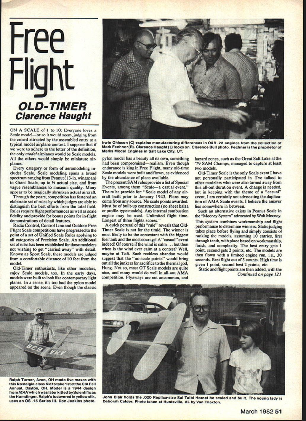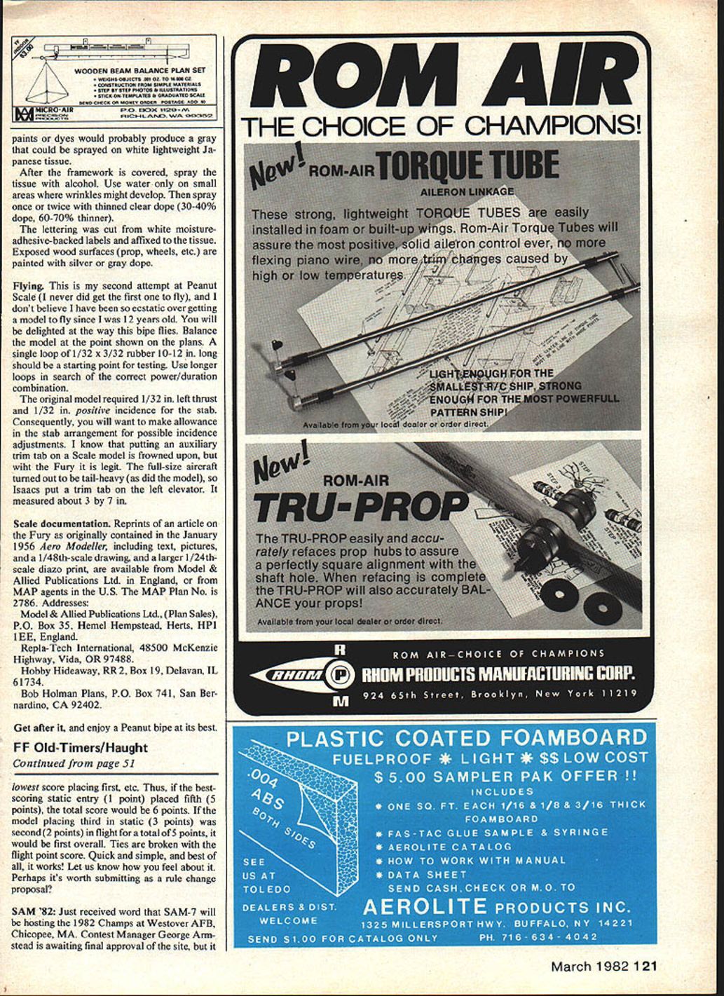 Free Flight OLD- TIMER Clarence Haught ON SCALE 1 10 Everyone loves Scale modelor would seem judging crowd attracted assembled entry typical model airplane contest suppose adhere letter definition model airplanes would Scale models others would simply miniature air planes category form aeromodeling cludes Scale Scale modeling spans broad spectrum ranging Peanut 13-in wingspan Giant Scale up al size vague resemblances museum quality appear magically shrunken actual aircraft Through years competition has fostered elaborate set rules judges able distinguish best efforts total field Rules require flight performances well scale fidelity provide bonus points in-flight demonstrations detail features Radio Control Control Line Outdoor Free Flight Scale competitions have progressed point set Unified Scale Rules applying categories Precision Scale An additional set rules has established modelers wishing get canied away detail Known Sport Scale models judged comfortable distance 10 feet model Old-Timer enthusiasts like other modelers enjoy Scale models too early days models built look like contemporary light planes sense its too bad pylon model appeared scene though classic Irwin Ohisson C explains manufacturing differences O&R 23 engines collection Mark Fechner R Clarence Haught 1 looks Clarence Bull photo Fechner proprietor Marks Model Engines Salt Lake City UT pylon model has beauty its own something compromisedrealism though endurance king Free Flight old-time Scale models built flown evidenced abundance plans avallable present SAM rules provide alistof Special Events among Scalea casual event rules provide Scale model air craft built prior January 1943 Plans may come source No scale points awarded Must built-up construction no sheet balsa profile-type models Any internal combustion engine may used Unlimited flight time Longest three flights scores quick perusal rule reveals Old Timer Scale timid winner likely contestant biggest fuel tank courage casual event indeed course . wind ever calm contest Well maybe Taft Such reckless abandon would suggest no scale points would bring out junkers sacrifice thermal god Hung OT Scale models quite nice would well all-out AMA competition Flyaways uncommon hazard zones such Great Salt Lake 79 SAM Champs managed capture least two models Old-Timer Scale Scale event have personally participated Ive talked other modelers also turned away all-out duration event change needed keeping theme casual event am certainly advocating duplica tion AMA Scale events believe answer lies somewhere between Such alternative exists Peanut Scale Mooney System advocated Walt Mooney system combines workmanship flight performance determine winners Static judging takes place before flying simply consists ranking models assuming 10 entries first through tenth place based workmanship finish complexity best entry gets 1 point second gets 2 points etc models flown limited engine run je 30 seconds Best flight out 3 counts High time given 1 point second best 2 points etc Static flight points are added Continued page 121 March 198251 Ralph Turner Avon OH maae Tive maxes Nostalgia-class Kid totake 1 atthe CIA i-all Annual Dayton OH Model 1944 design MANwhich later kitted byScientificas Humdinger Ralphs covered yellow silk uses 0915 Series Ill Don Jenkins photo John Blair holds 020 Replica-size Sal Taibi Hornet scaled built young lady Deborah Calder Photo taken Huntsville AL Van Thaxton WOODEN BEAM BALANCE PLAN SET WESOUS OBJECTS SI 02 TO IS 02 COSOTOUCTIOS PROM SIMPtO MATERIALS 4MBO AIRiciTHEAIR STICE-OS-TEMPLATES ORAOOATRO SCALE OURS COECS 00 MOSEY ORDER POOTUOL ADO 00 paints dyes would probably produce gray CHOICE OF CHAMPIONS could sprayed white lightweight Ja panese tissue After framework covered spray tissue alcohol Use water small areas wrinkles might develop spray once twice thinned clear dope 30-40% dope 60-70% thinner lettering cut white moistureadhesive-backed labels affixed tissue Exposed wood surfaces prop wheels etc painted silver gray dope Flying second attempt Peanut Scale never did get first fly dont believe have ecstatic over getting model fly since 12 years old will delighted way bipe flies Balance model point shown plans single loop 1/32 x 3/32 rubber 10-12 long should starting point testing Use longer loops search correct power/duration combination original model required 1/32 left thrust 1/32 positive incidence stab Consequently will want make allowance stab arrangement possible incidence adjustments know putting auxiliary trim tab Scale model frowned upon wiht Fury legit full-size aircraft turned out tail-heavy did model Isaacs put trim tab left elevator measured about 3 7 Scale documentation Reprints article Fury originally contained January 1956 Aero Modeller including text pictures 1/48th-scale drawing larger 1/24thscale diazo print available Model & Allied Publications Ltd England MAP agents US MAP Plan No 2786 Addresses Model & Allied Publications LtcL Plan Sales PO Box 35 Hemel Hempstead Herts HP1 1 EE England Repla-Tech International 48500 McKenzie Highway Vida OR 97488 Hobby Hideaway RR2 Box 19 Delavan IL 61734 Bob Holman Plans PO Box 741 San Ber nardino CA 92402 Get after enjoy Peanut bipe its best F F Old-Timers/Haught Co ntinued page 51 lowest score placing first etc Thus bestscoring static entry 1 point placed fifth 5 points total score would 6 points model placing third static 3 points second 2 points flight total 5 points would first overall Ties broken flight point score Quick simple best works Let us know feel about Perhaps its worth submitting rule change proposal SAM 82 Just received word SAM-7 will hosting 1982 Champs Westover AFB Chicopee MA Contest Manager George Armstead awaiting final approval site March 1982 121 DESIGNED BY BILL EVANS FOR YOU STANDARD KIT $8995 - Epoxy Fiberglass Fuselage - Foam Cores - Ply Wing Sheeting - Gear Formed - Balsa Parts Cut Shape - Sliding Tray - Full Size Plans BASIC KIT $5995 Glass Fuse Cores - Ply - Plans Add $300 s